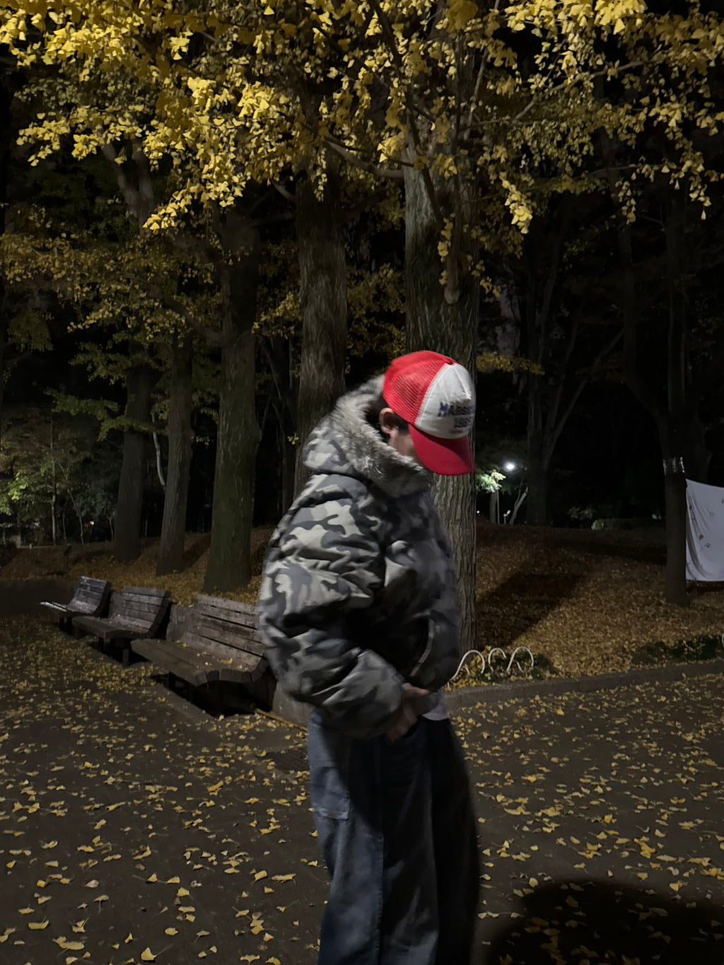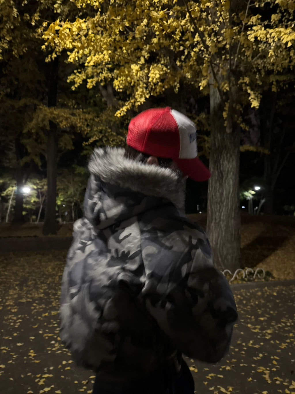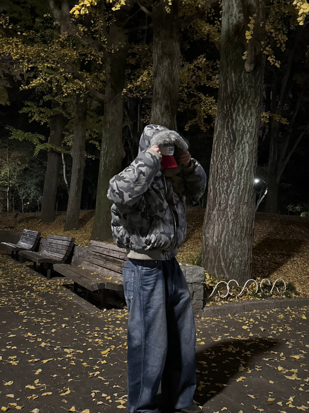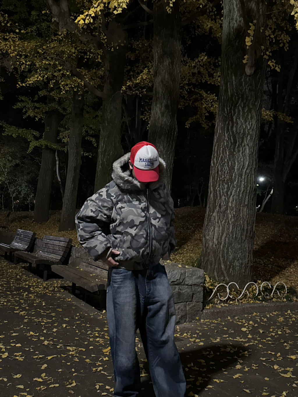 フードのファーと迷彩の組み合わせが、無骨でストリートなムードを加速させる。実はリバーシブルだから、着回し力も抜群。今日は極太のバギーデニムと合わせて、上下ともにボリューミーな「重×重」シルエットに。