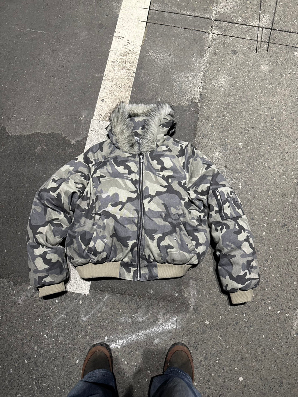 このカモフラ柄ジャケット、ボリューム感が最強。