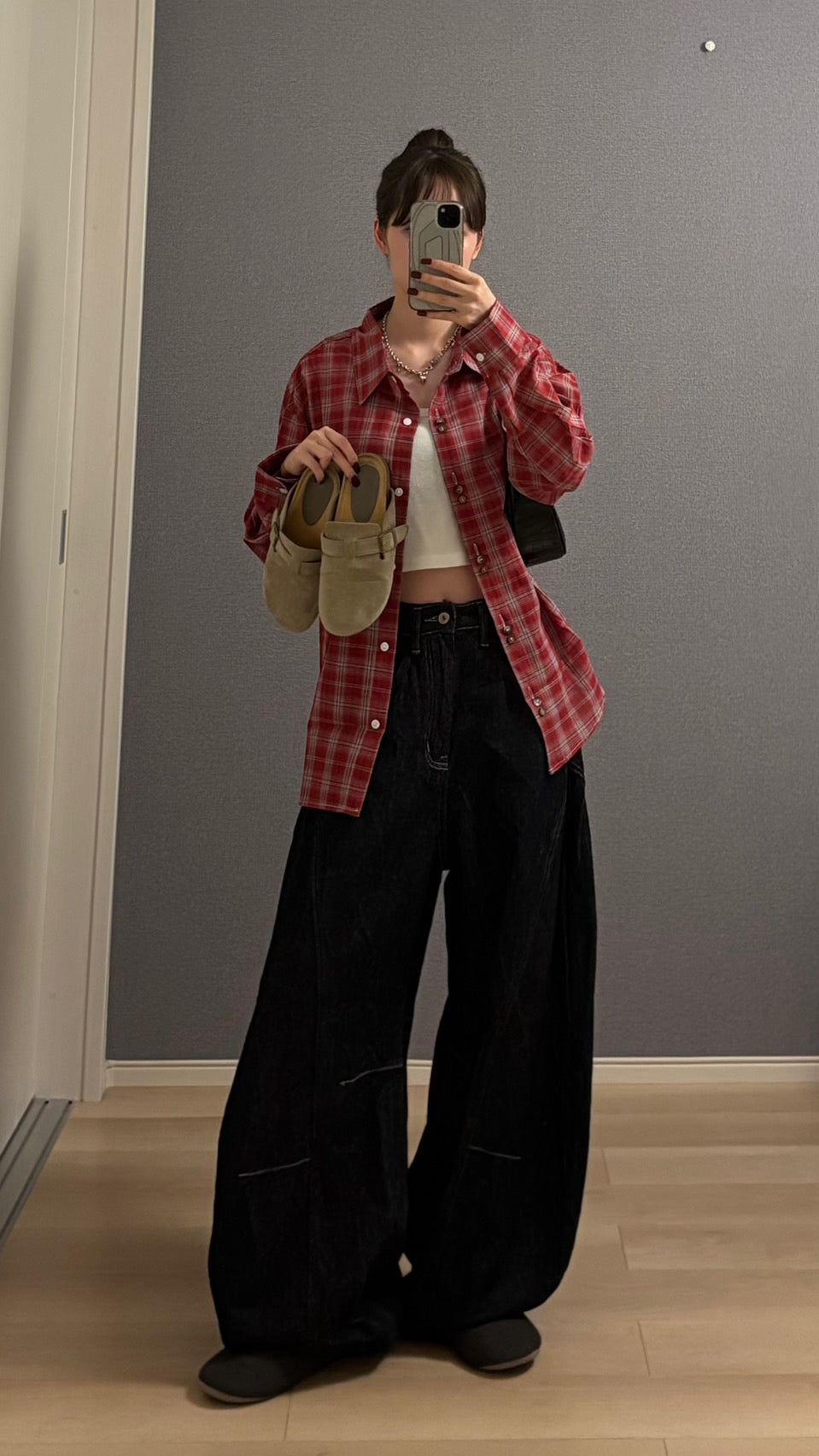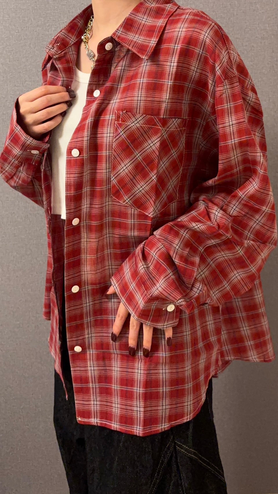 羽織るだけでコーデにアクセントを与え、インナーを白タンクやクロップド丈と合わせれば一気に今っぽいバランスに。オーバーサイズシルエットだから、ルーズなデニムやワイドパンツとの相性も抜群。袖を少し捲ってラフに着崩すとこなれ感が増し、首元にチェーンネックレスを合わせればグランジ感を引き立てられる一枚です。