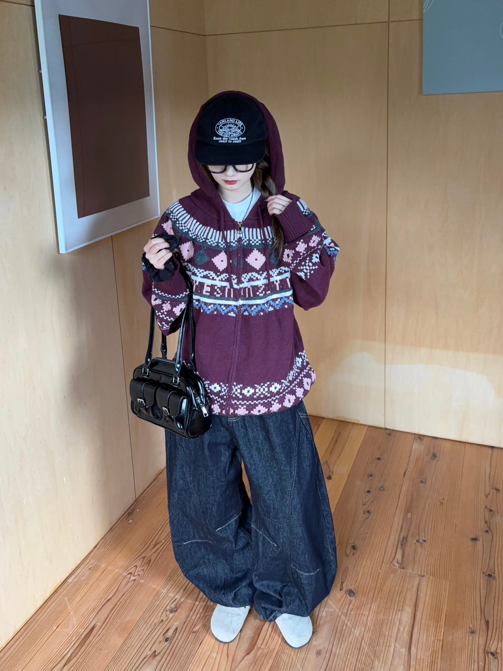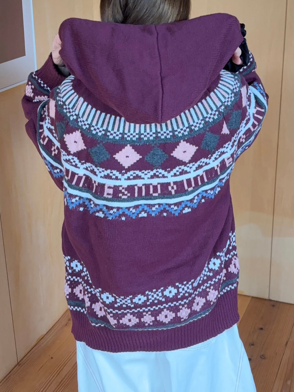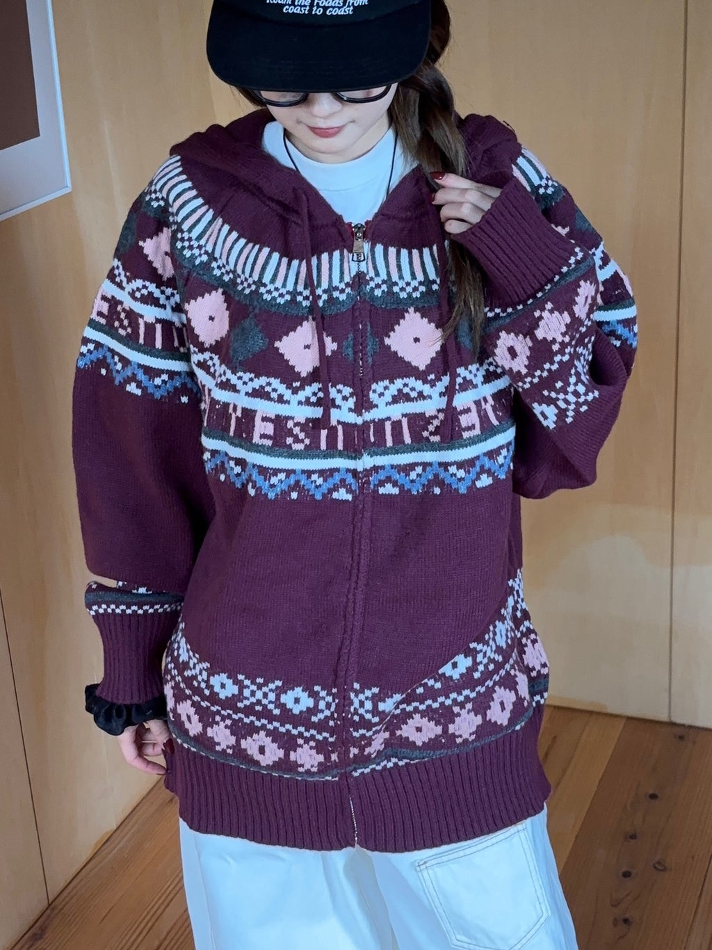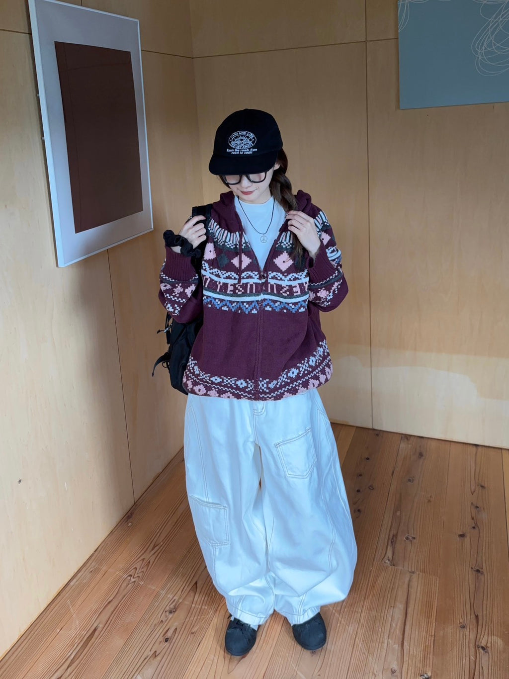 ボルドーを基調にしたノルディック柄のニットパーカーが主役の冬コーデ。