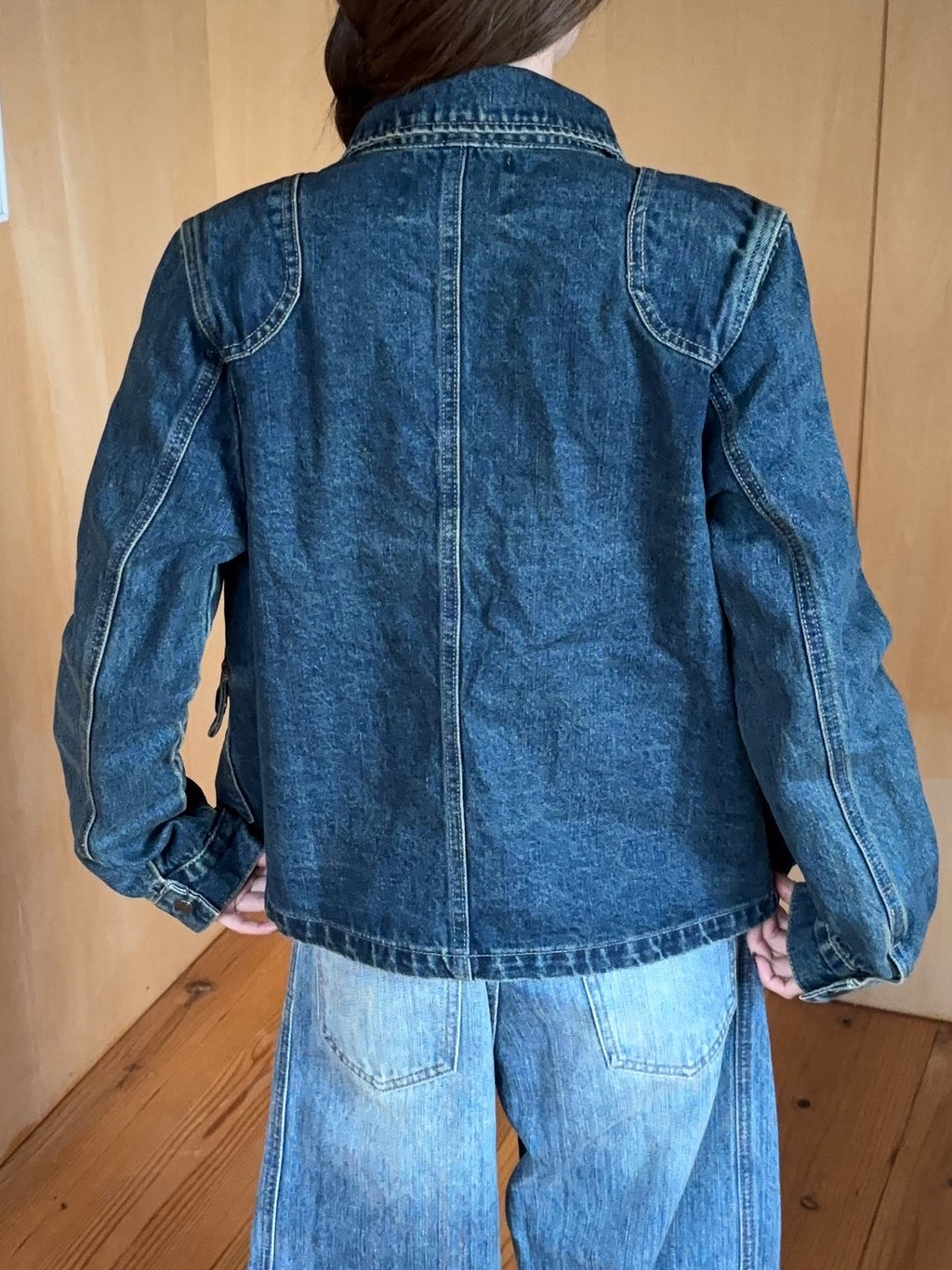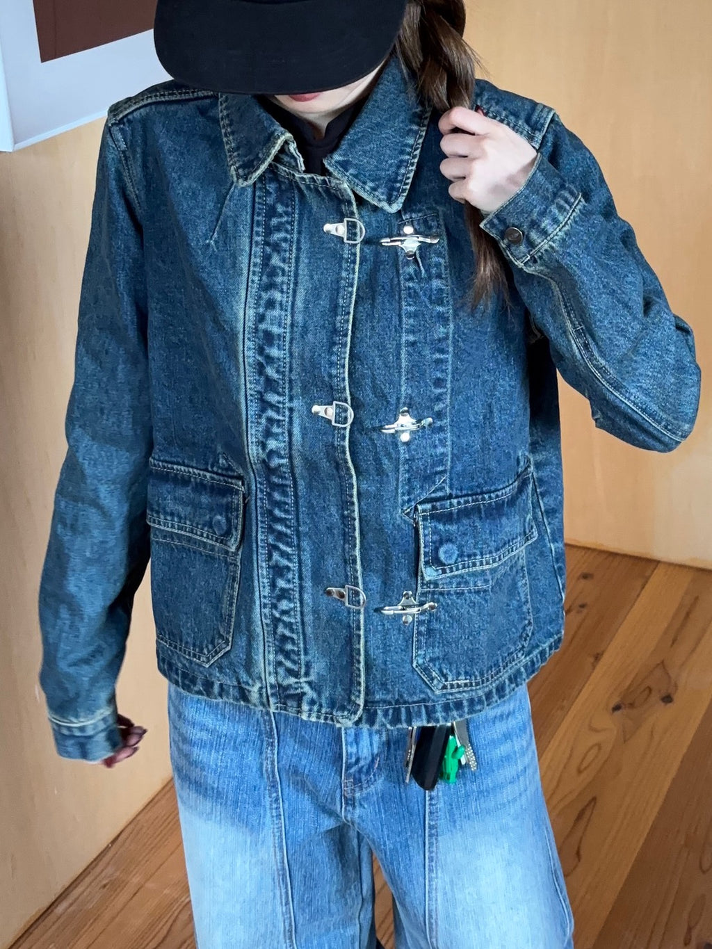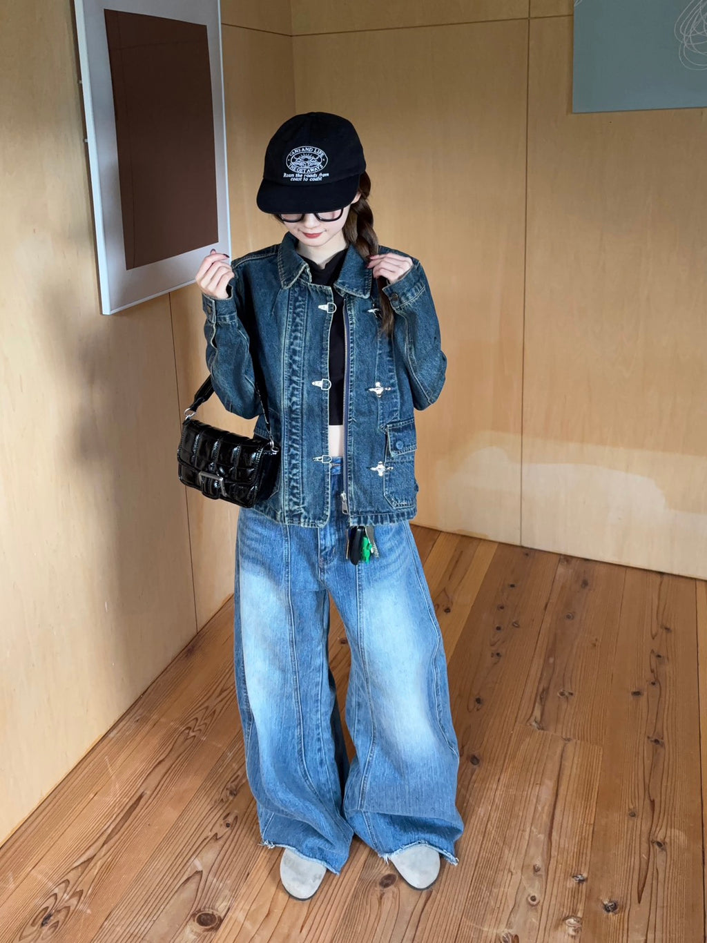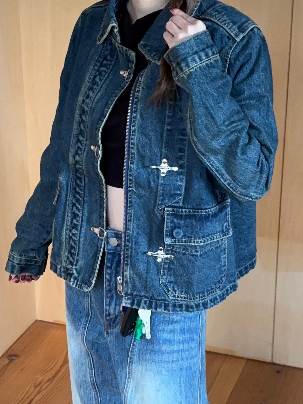 今日はデニムオンデニムで気分を上げてみたよ。メタルフックが可愛いこのジャケット、ちょっとメンズっぽいけど、それが逆にいいバランス。中はコンパクトな黒のトップスで引き締めて、パンツはあえてゆるっとワイドに。キャップと黒バッグで全体をまとめたら、ラフだけどこなれた感じに仕上がった気がする。
