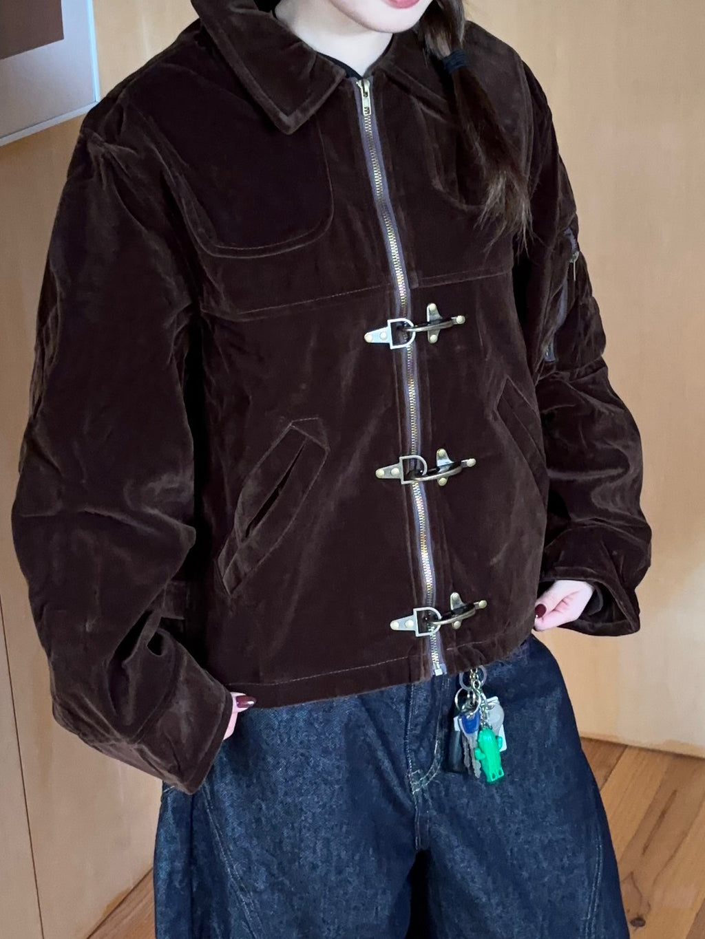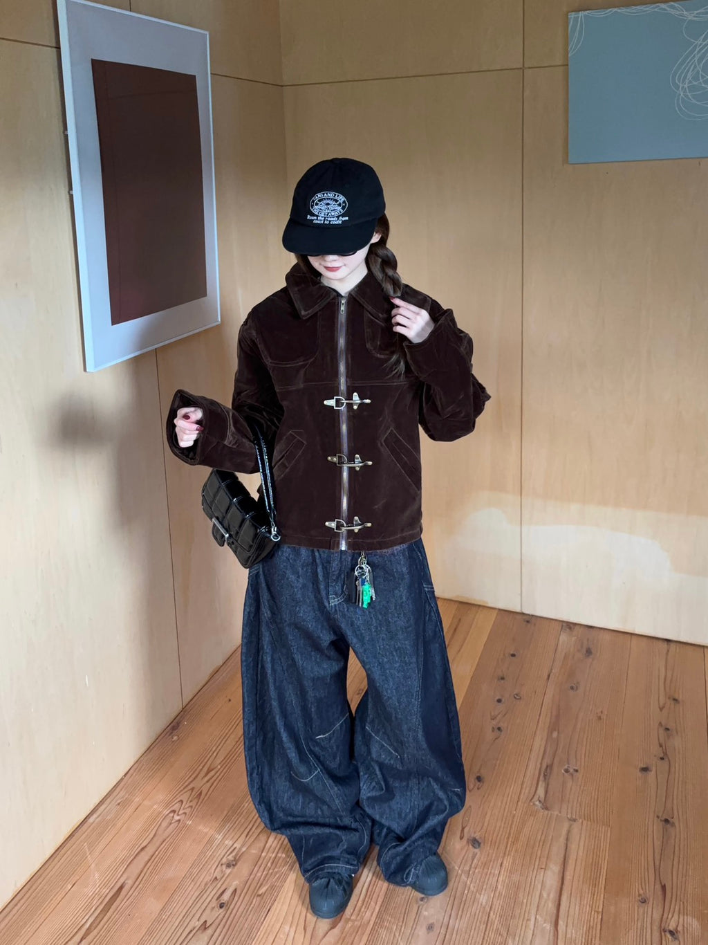 光の当たり方で表情が変わる深いブラウンが気に入ってる。メタルフックのデザインで甘すぎず、少しモードな雰囲気に。ボリュームのあるデニムを合わせて、バランスよくカジュアルダウン。キャップと黒バッグで引き締めて、ゆるいけどちゃんと洒落て見える感じを意識したよ。