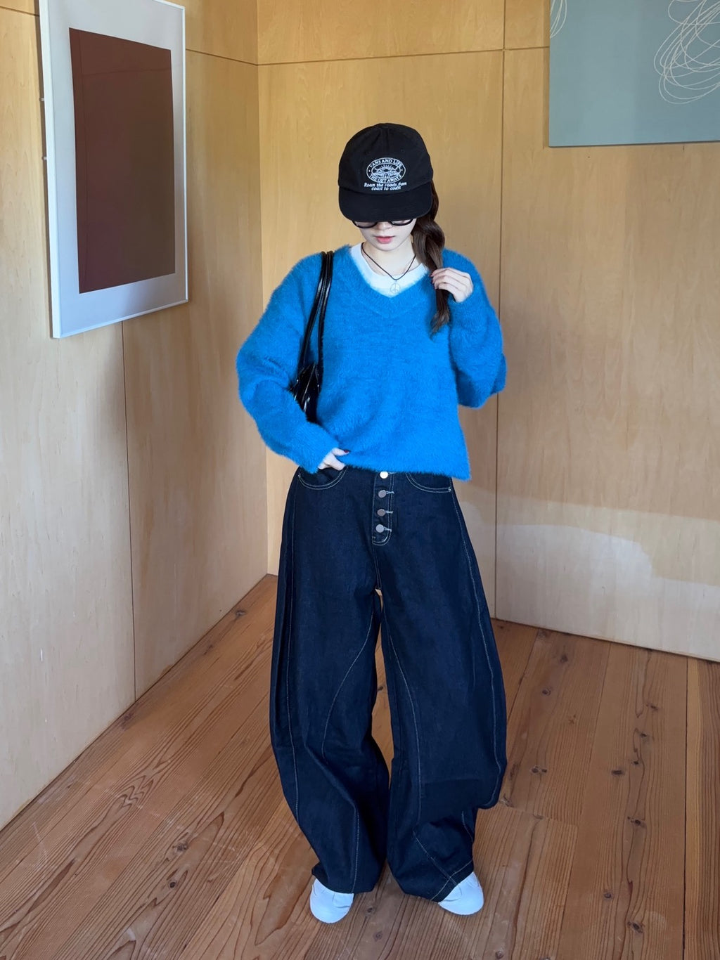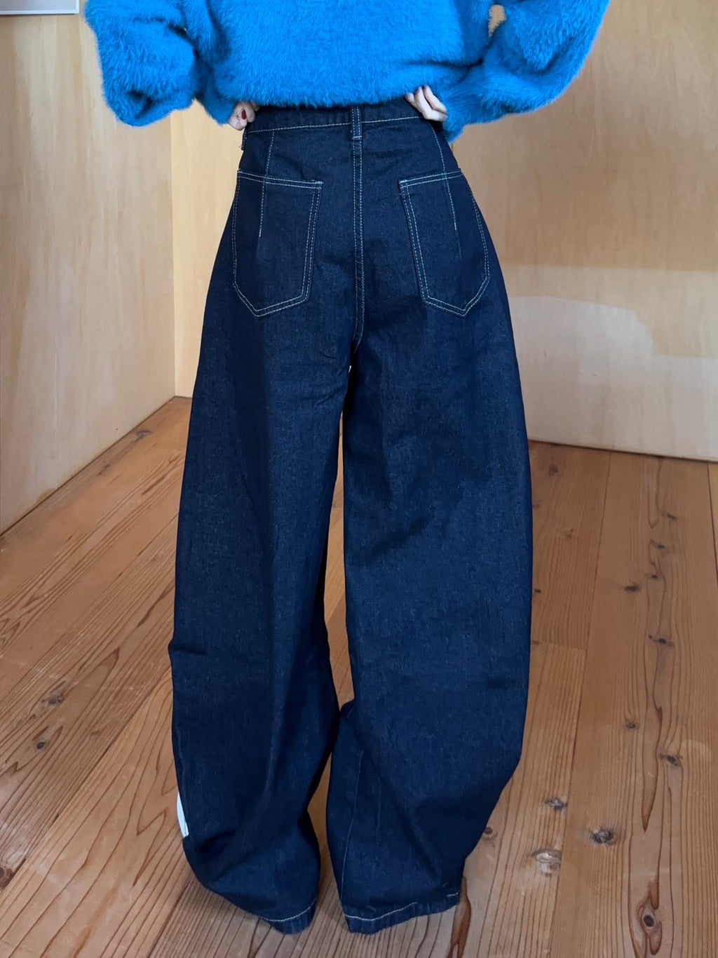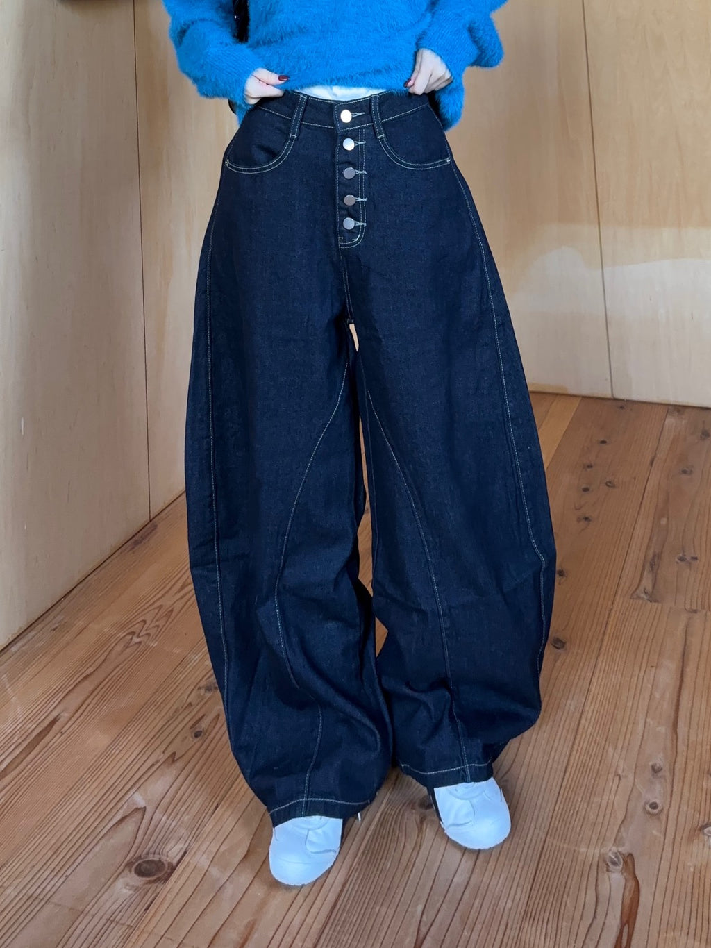 今日の主役はこのカーブデニム。フロントのボタンフライと、立体的なコクーンシルエットがポイント。ハイウエストだから、トップスは短め丈を合わせるか、タックインするのが鉄則。今日はあえて発色の良いブルーのシャギーニットを合わせて、デニムのカジュアルさと素材感のギャップを楽しんでる。白Tのレイヤードとキャップで、ラフな抜け感をプラス。