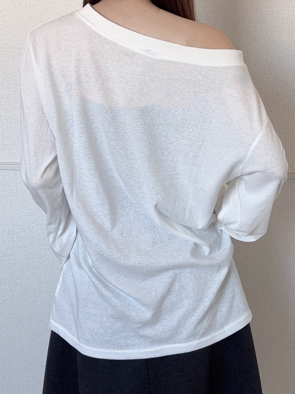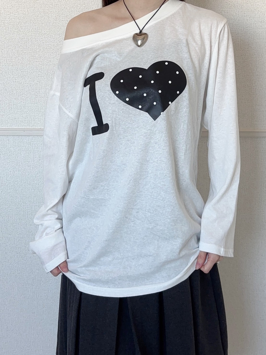ほんのり透け感のある軽い素材に、ドットとハートをミックスしたプリント。甘くなりがちなモチーフだけど、色味と配置が控えめだから、大人でも取り入れやすいバランスです。ワンショルダー風のネックラインが、ラフなのに自然な色気を足してくれます。