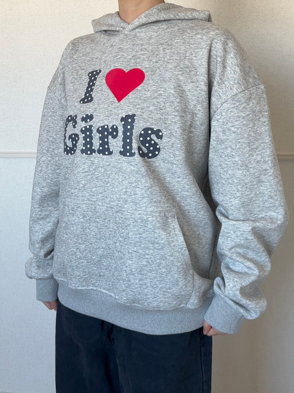 グレーをベースに、メッセージロゴとドット×ハートのプリントを重ねたデザイン。甘さのあるモチーフだけど、色数を抑えているから、ストリートにも自然に馴染みます。裏側は起毛仕様で、着た瞬間からしっかり暖かいのも嬉しいポイント。