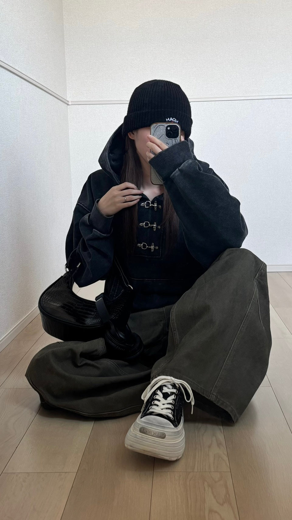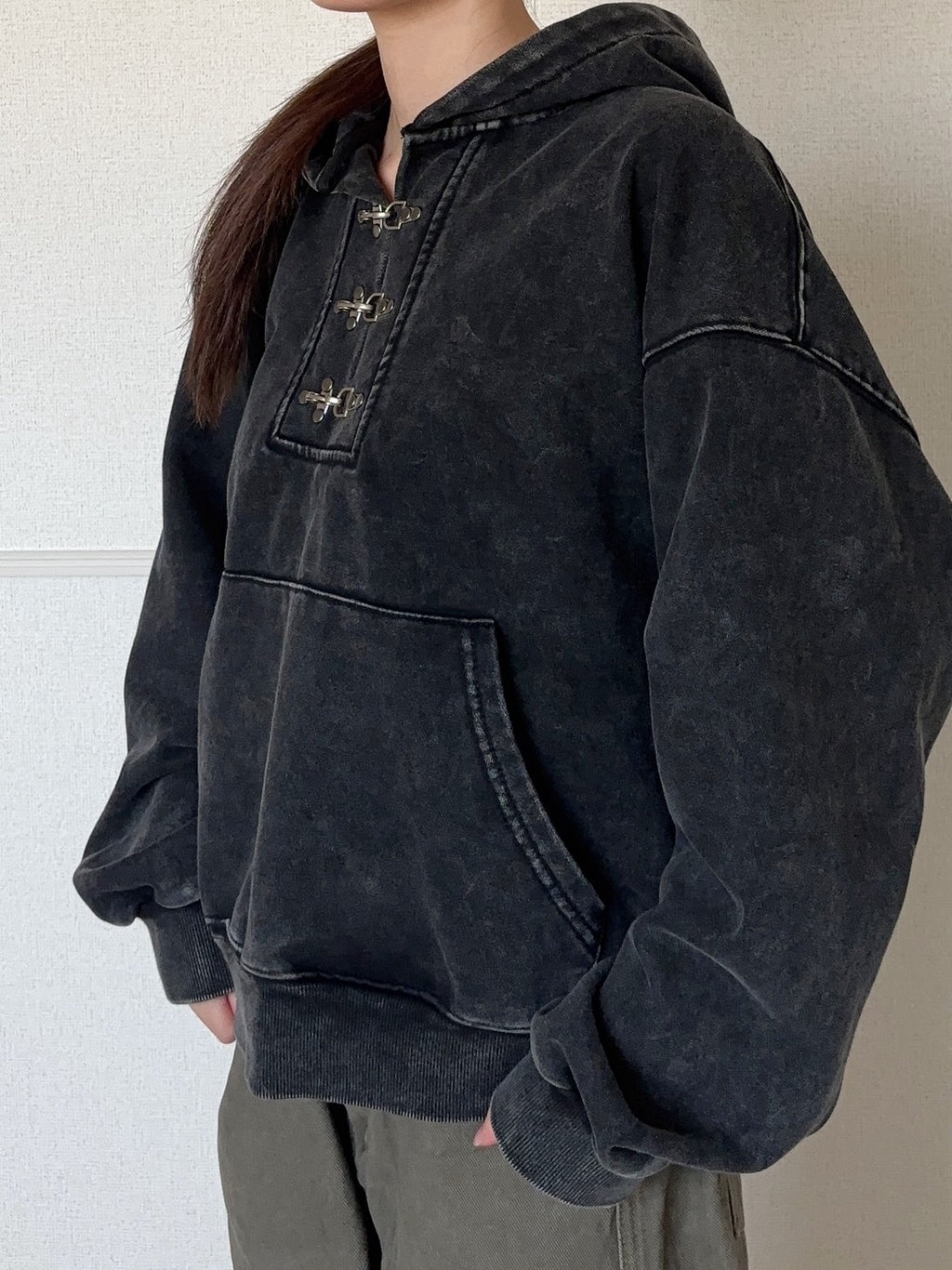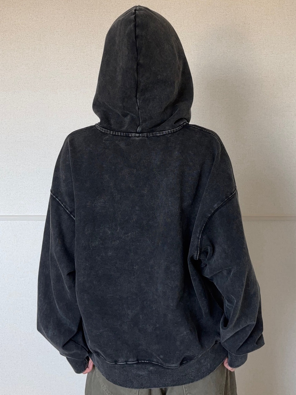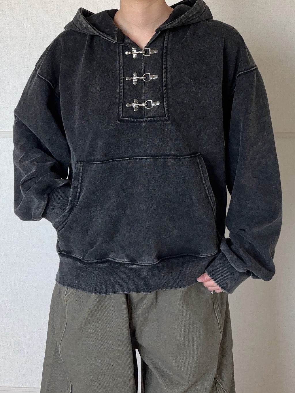 新品なのに、最初から“着込んだ空気”がある。このフーディは、その雰囲気が完成しています。しっかり厚みのある重磅スウェットに、洗い加工をかけたマットなブラック。色ムラやフェード感が自然で、いわゆる古着っぽさとも少し違う、落ち着いた表情です。フロントにはメタルフックを配置していて、無地だけどちゃんと存在感があるのもポイント。