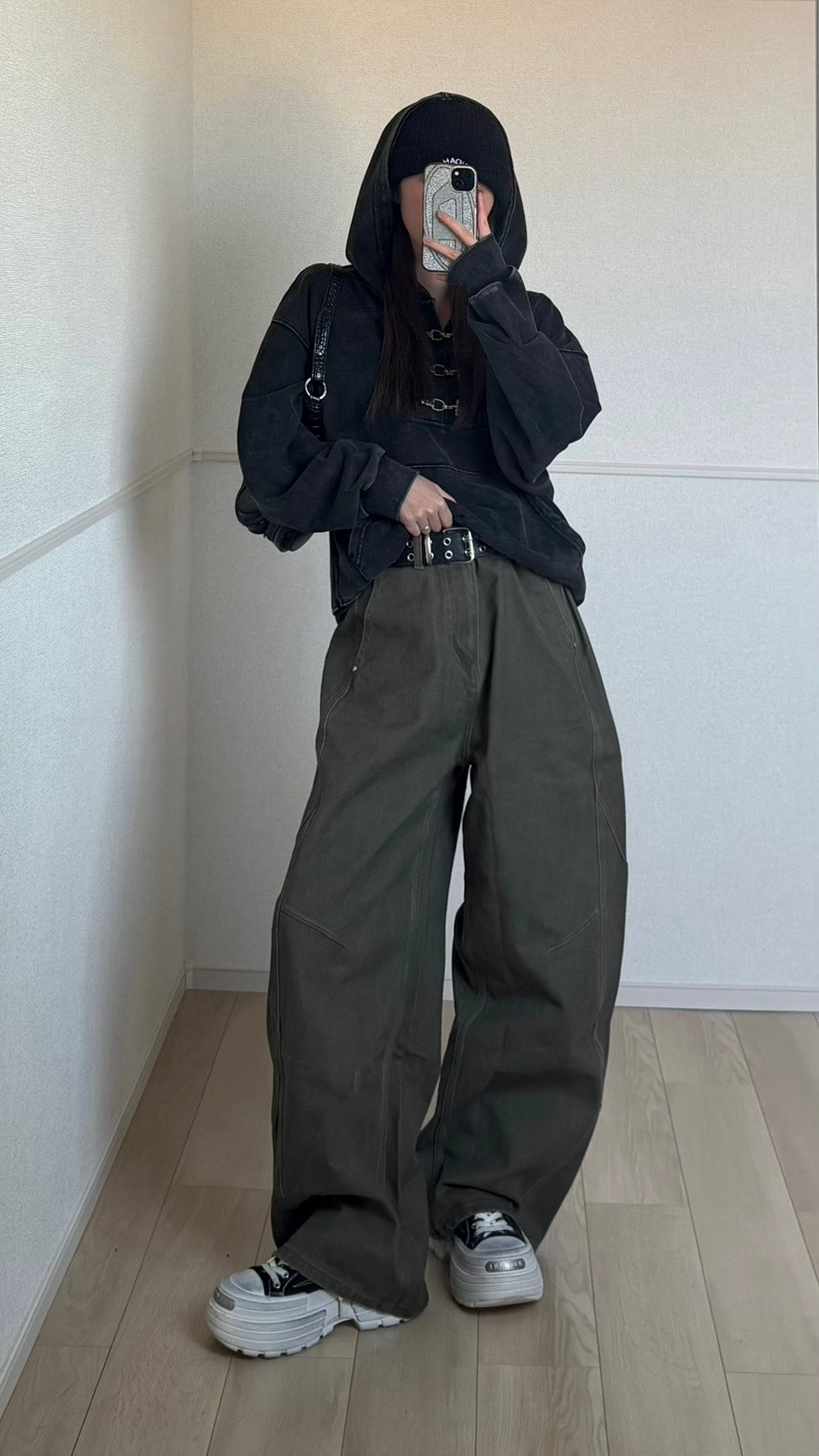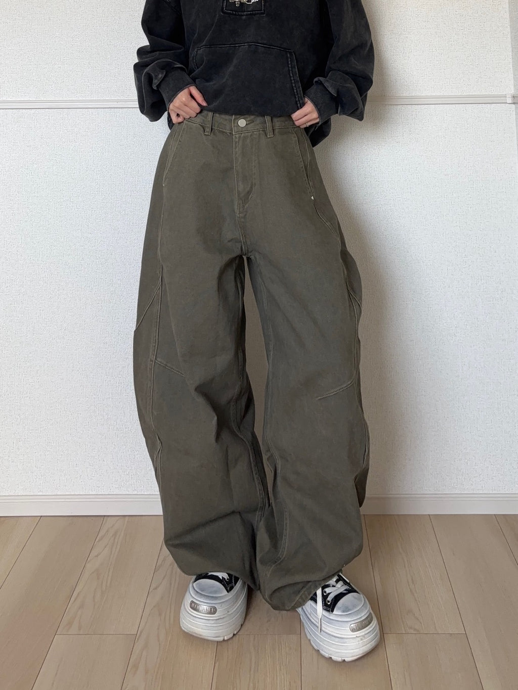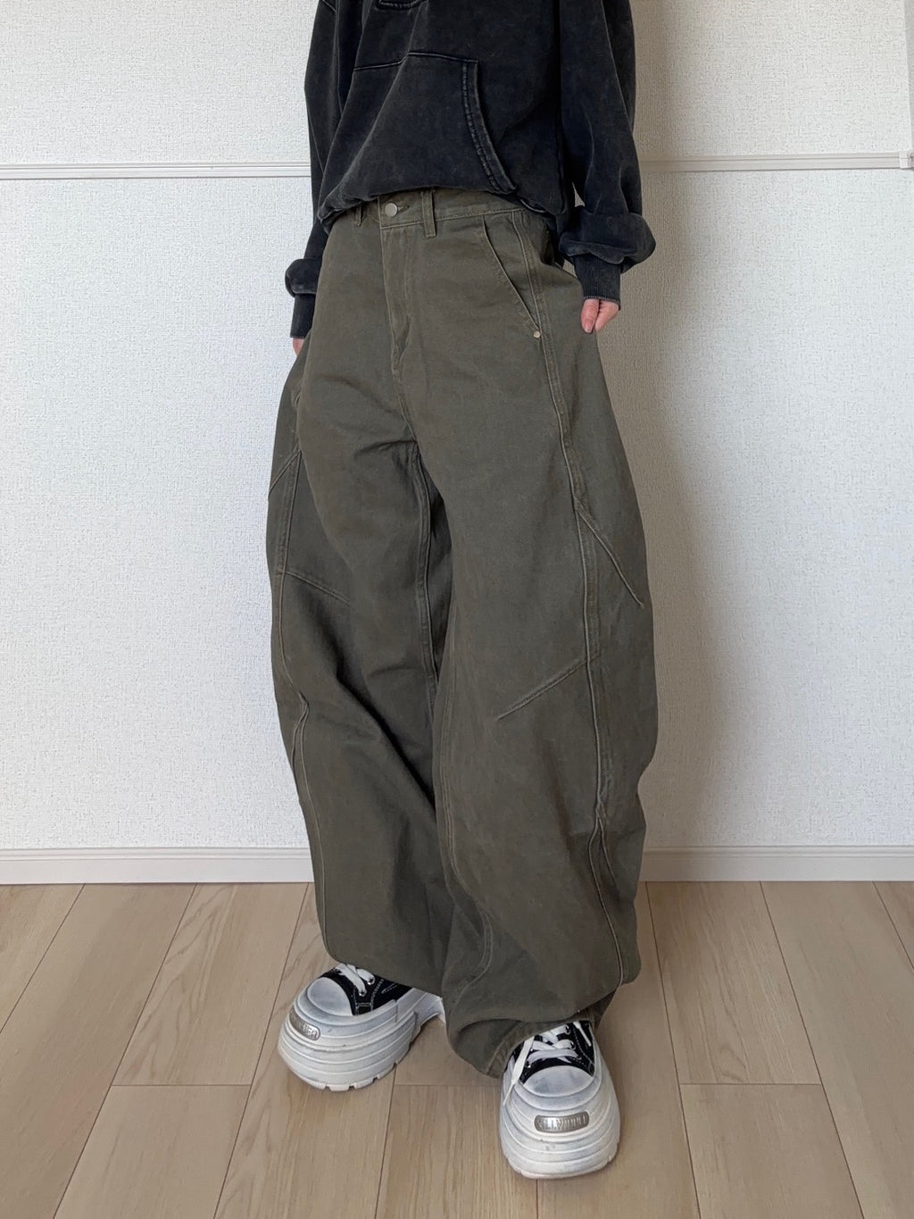 シルエットはワイドだけど、ただ広いだけじゃない。太ももから裾にかけて自然に落ちるラインで、立体裁断のおかげで横から見た時もきれい。溜まり方が重すぎず、厚底スニーカーやブーツと合わせるとバランスが取りやすいです。