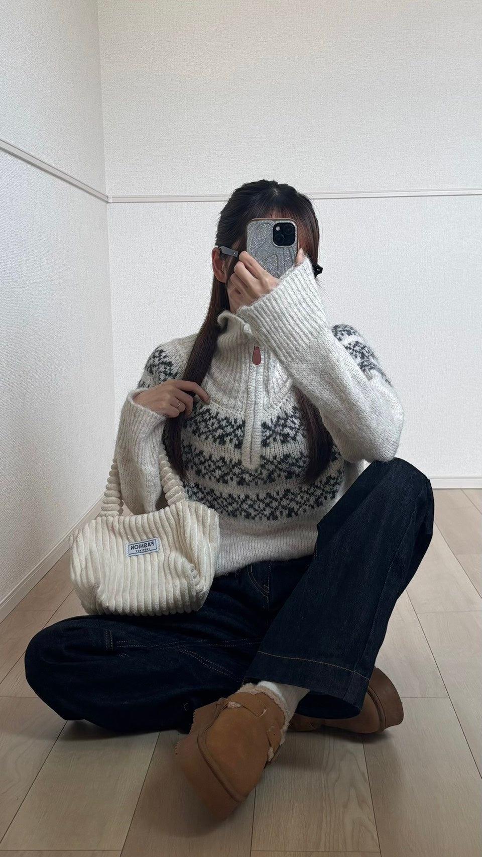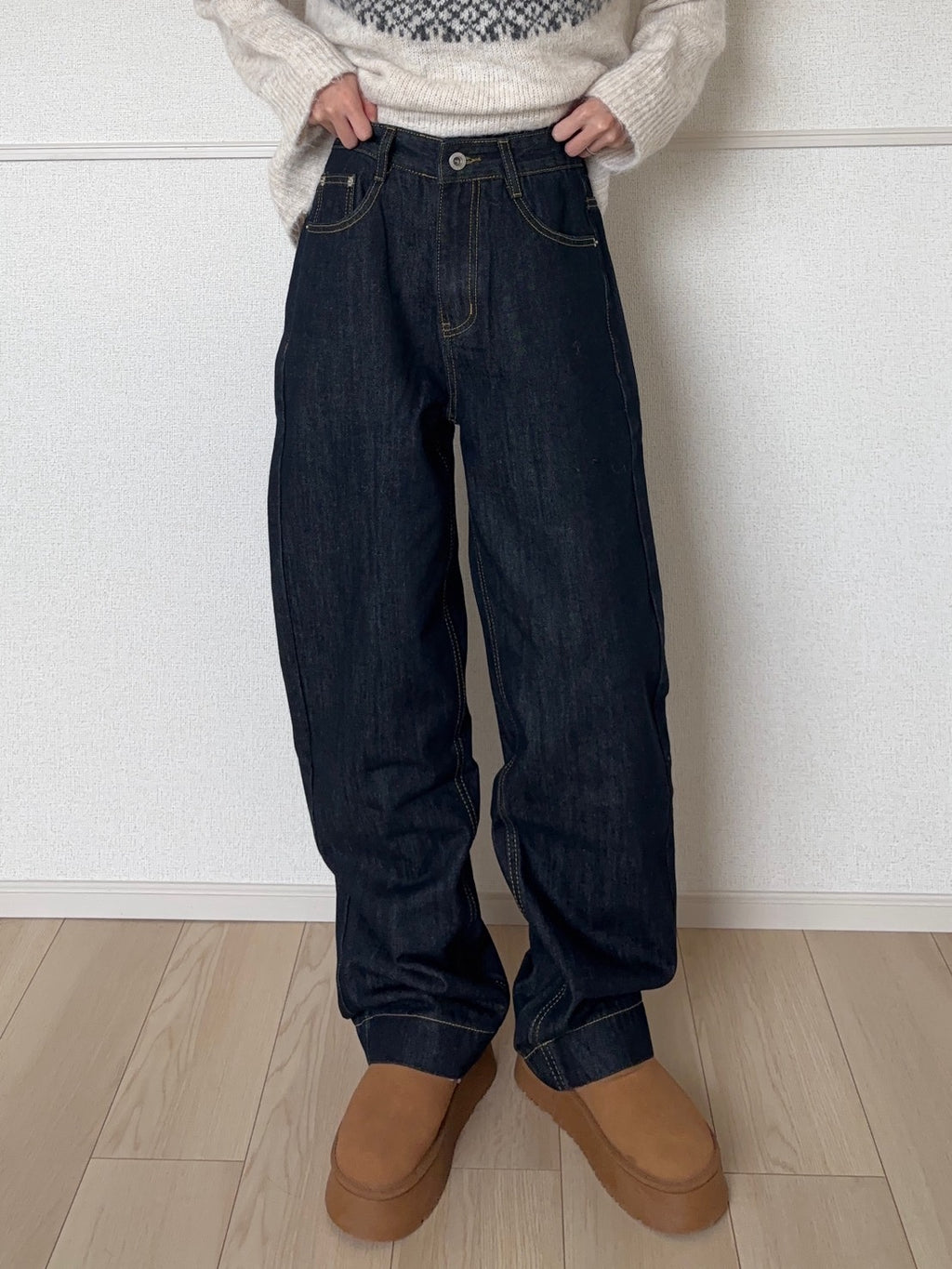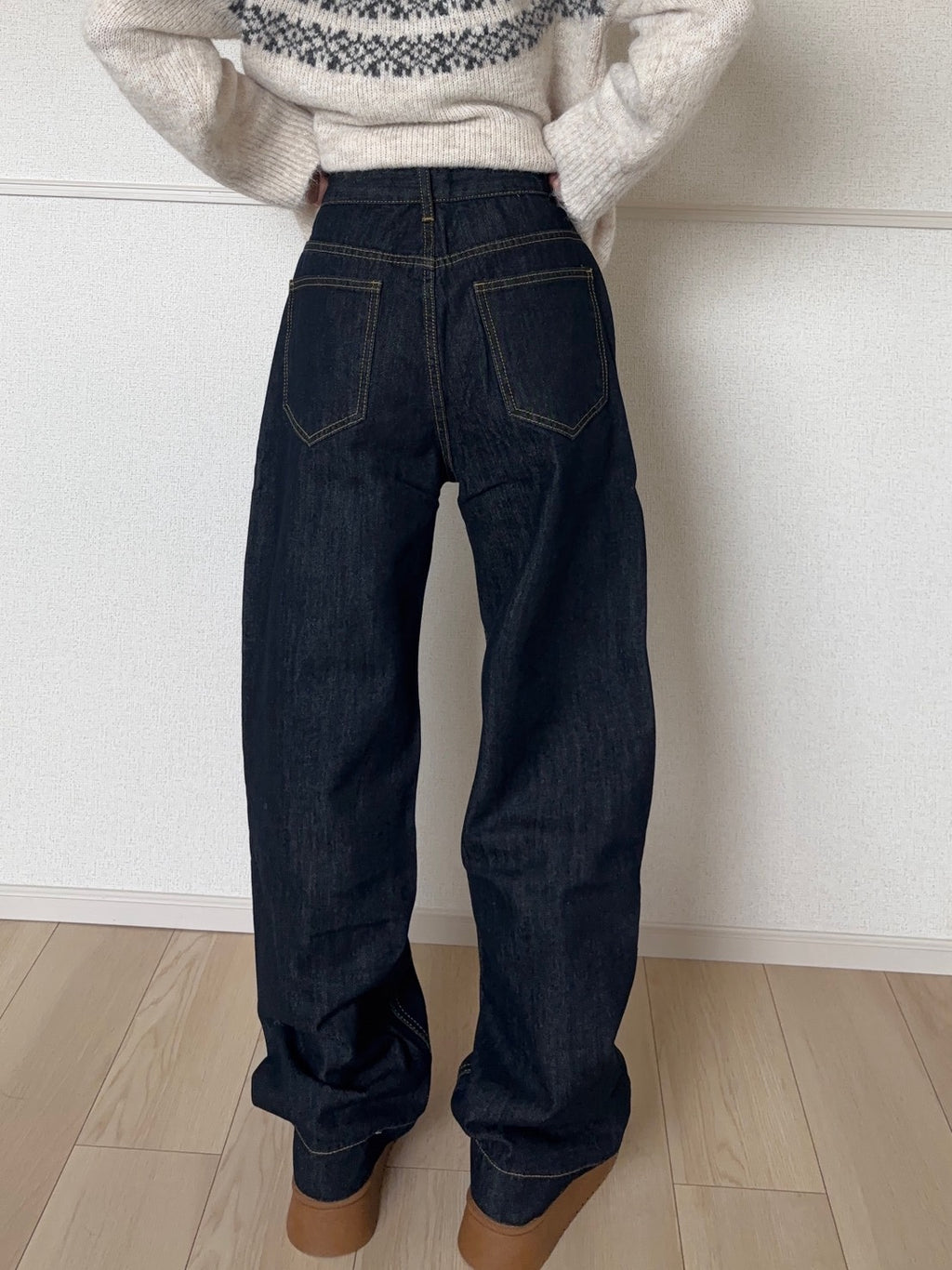 シルエットは直筒のワイドタイプ。太さはしっかりありますが、広がりすぎず、ストンと下に落ちるラインなので重く見えません。歩いたときのドレープ感もきれいで、厚底スニーカーやブーツとも自然に馴染みます。