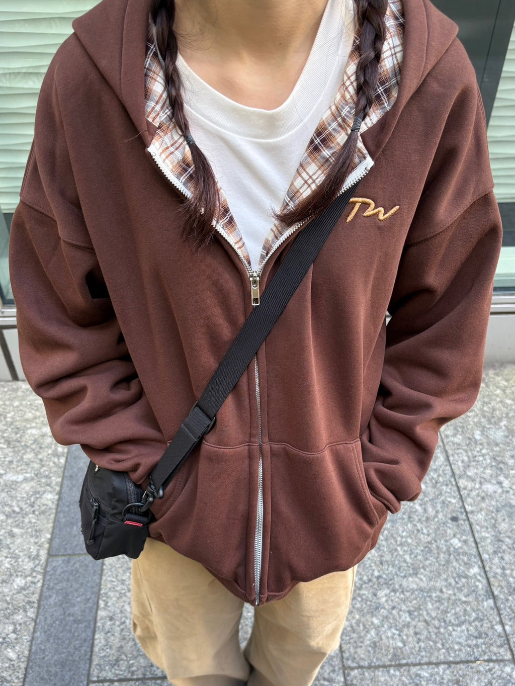 最大の魅力は、フード裏からチラ見えするチェック柄。今日は白Tとベージュのワイドパンツを合わせて、ブラウン系のワントーンコーデに。ラフに羽織るだけで、こなれたストリートスタイルの完成。おさげヘアとの相性も◎。