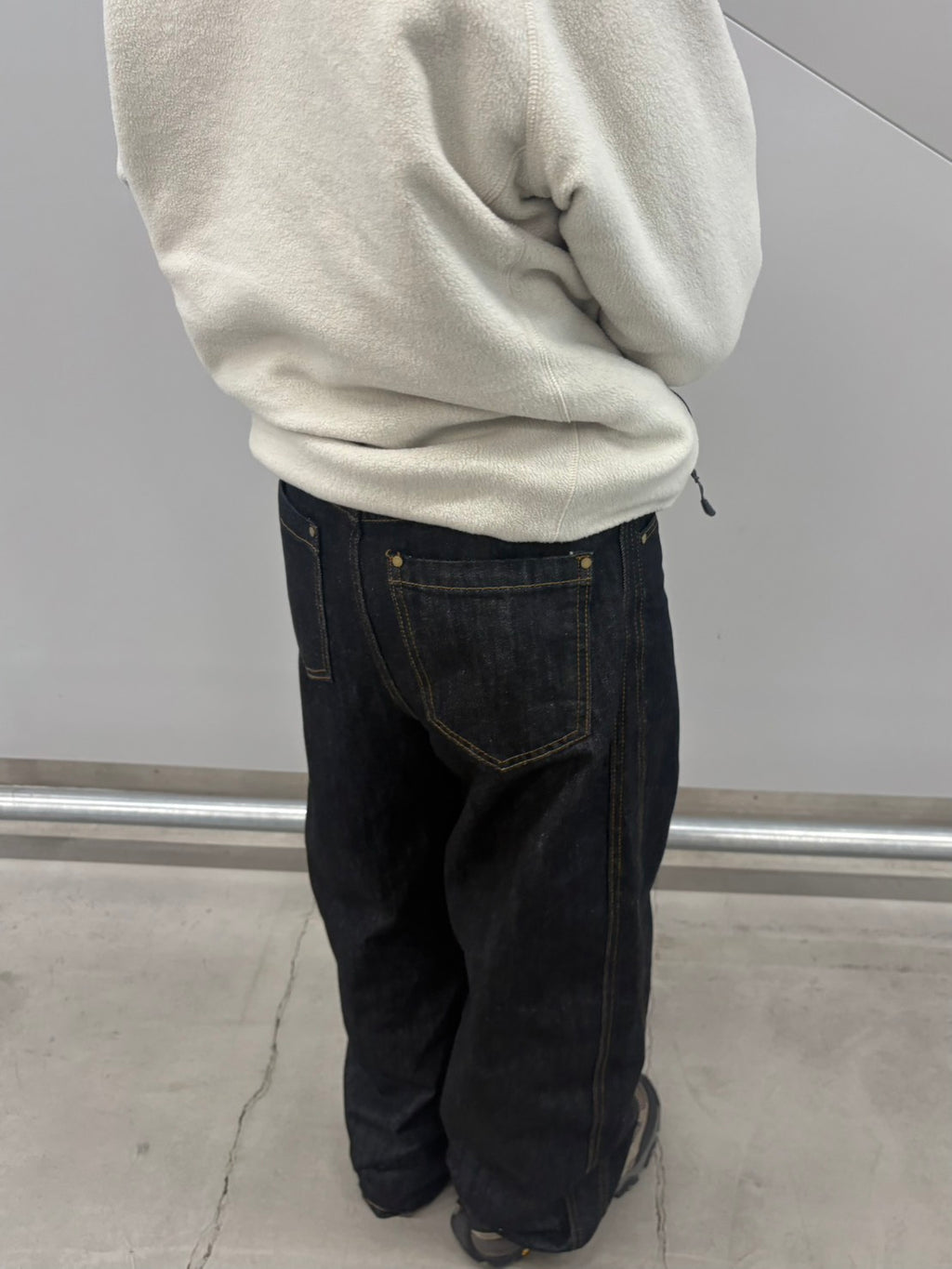 シーム入りの立体感が腰まわりをすっきり見せてくれて、ゆるいカーブシルエットでも野暮ったくならないのが好き。ブラックデニムはどんなトップスとも相性が良くて、フリース合わせでも程よく締まる。アウトドア寄りのスタイルにも馴染む万能パンツです。