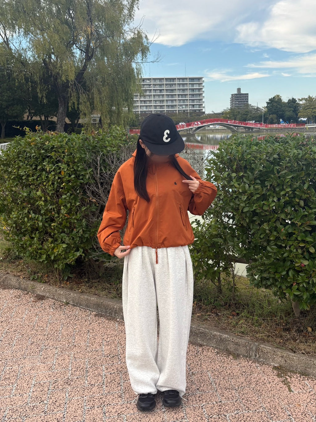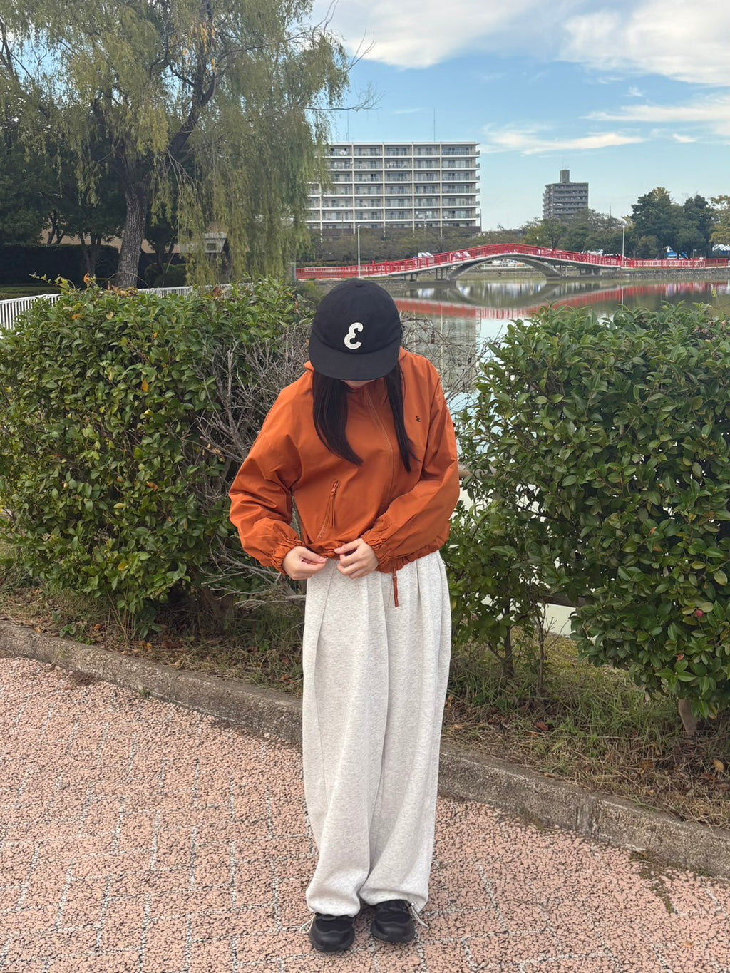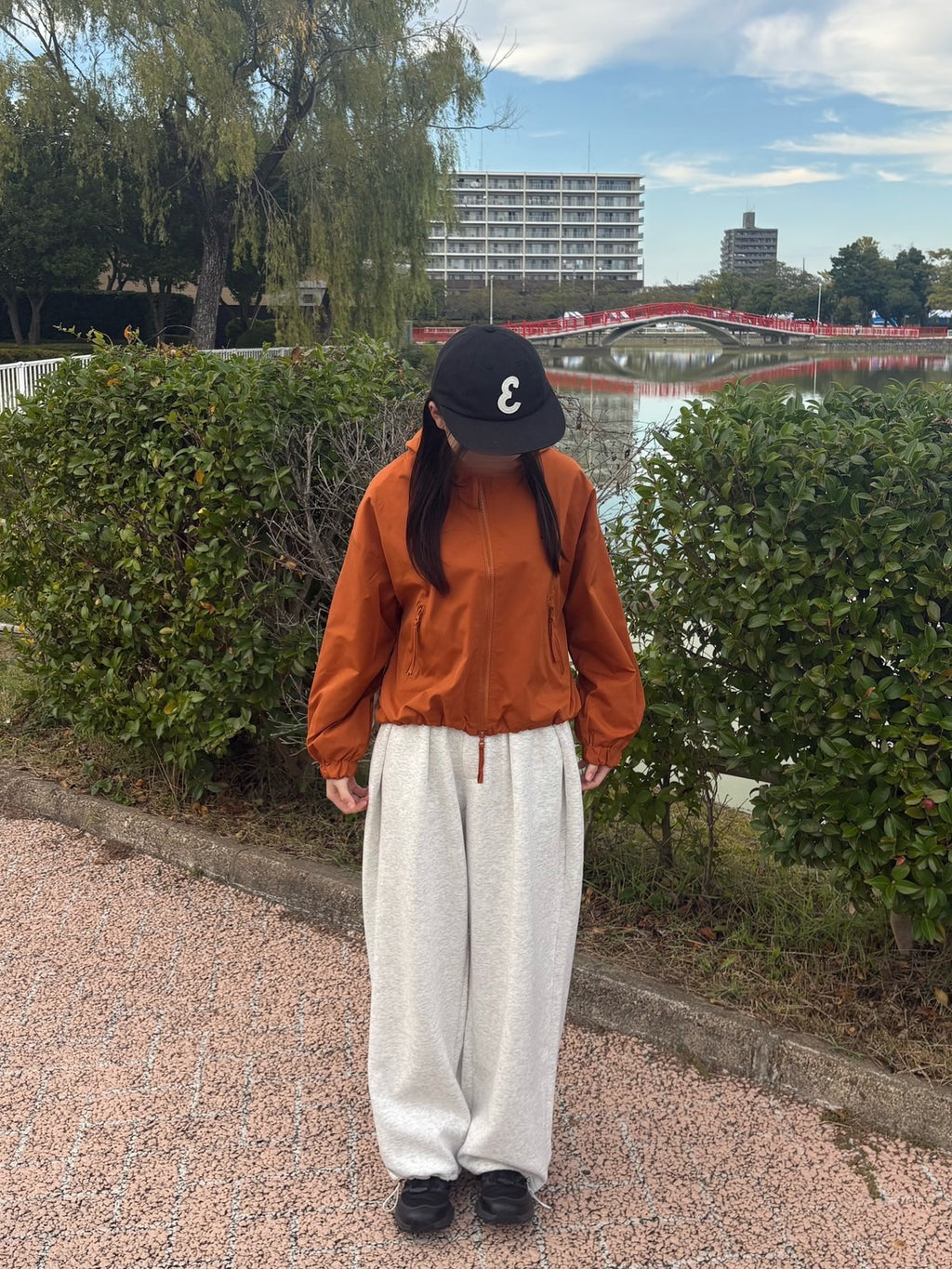 鮮やかなオレンジのマウンテンパーカーが主役のストリートライクなスタイル。スポーティでありながら程よくルーズなシルエットが抜け感を演出。グレーのスウェットパンツを合わせることで、リラックスした雰囲気とトレンド感を両立。キャップ&スニーカーをプラスすれば、タウンユースからアウトドアまで幅広く対応できる万能コーデに。