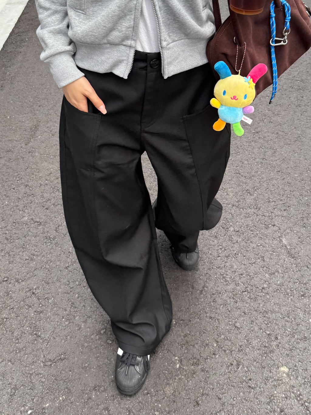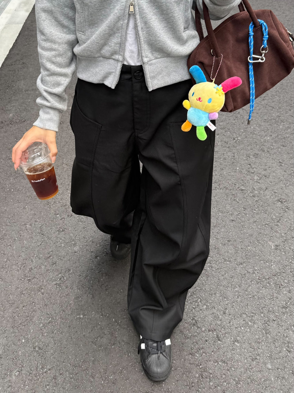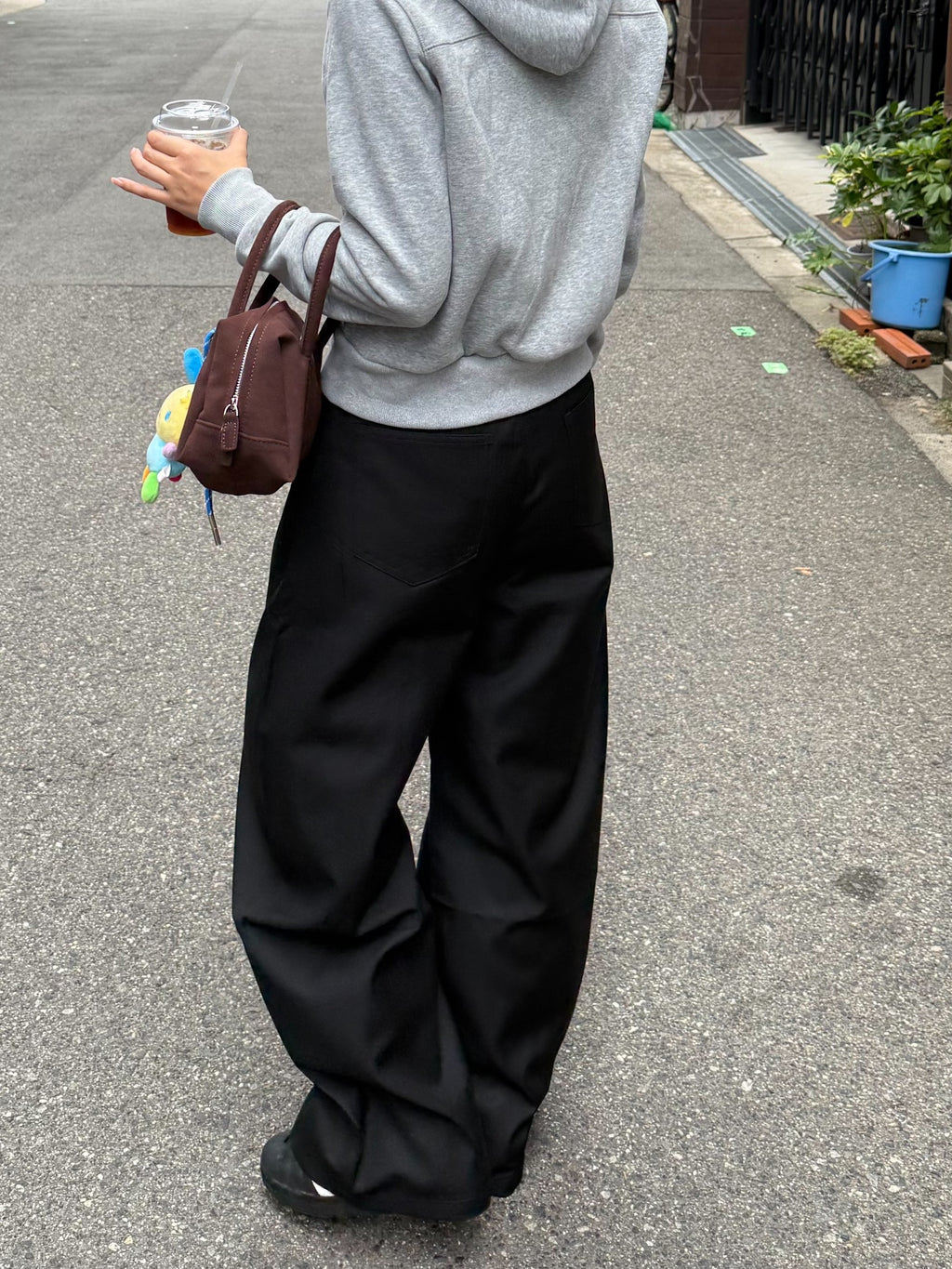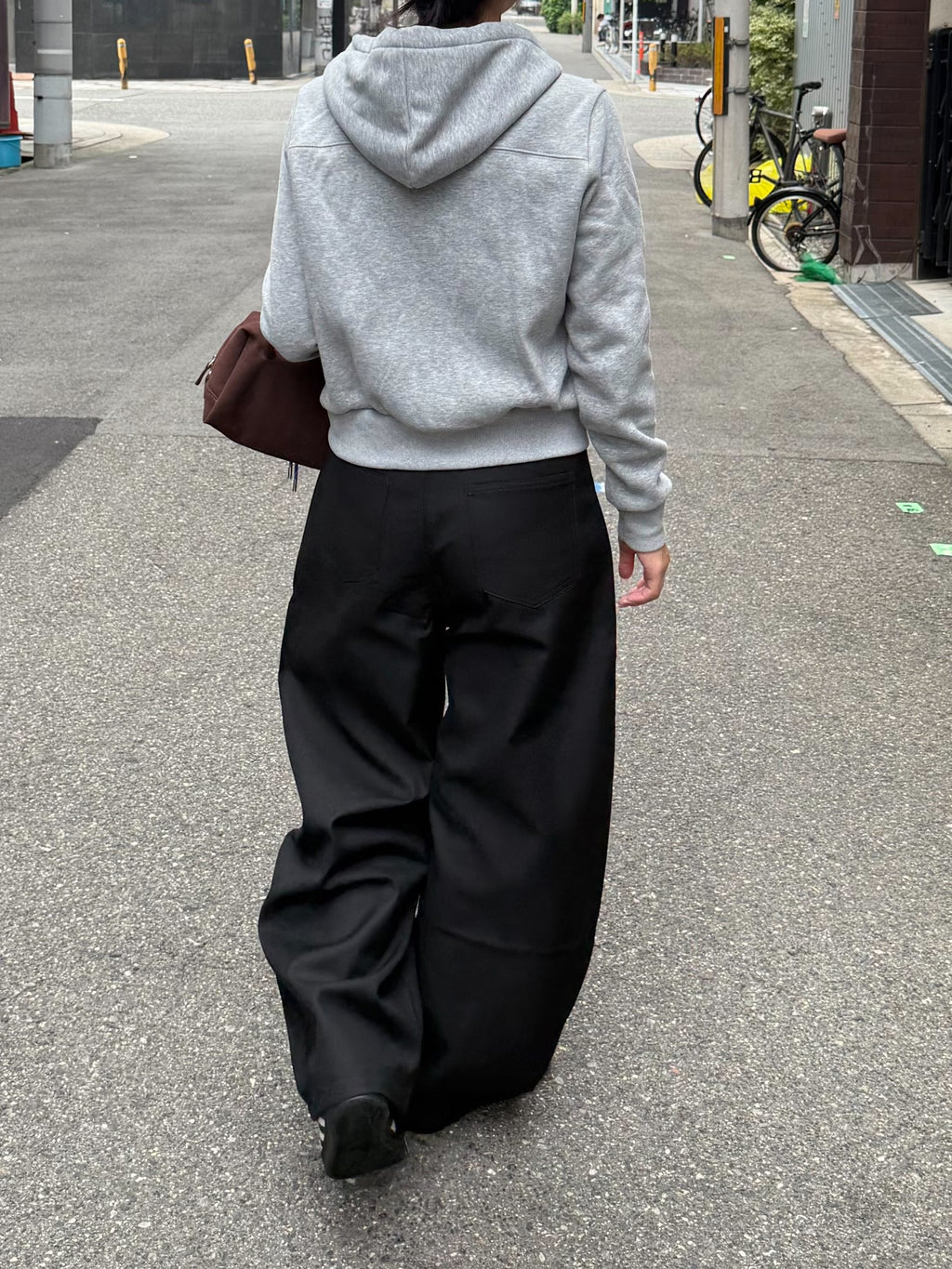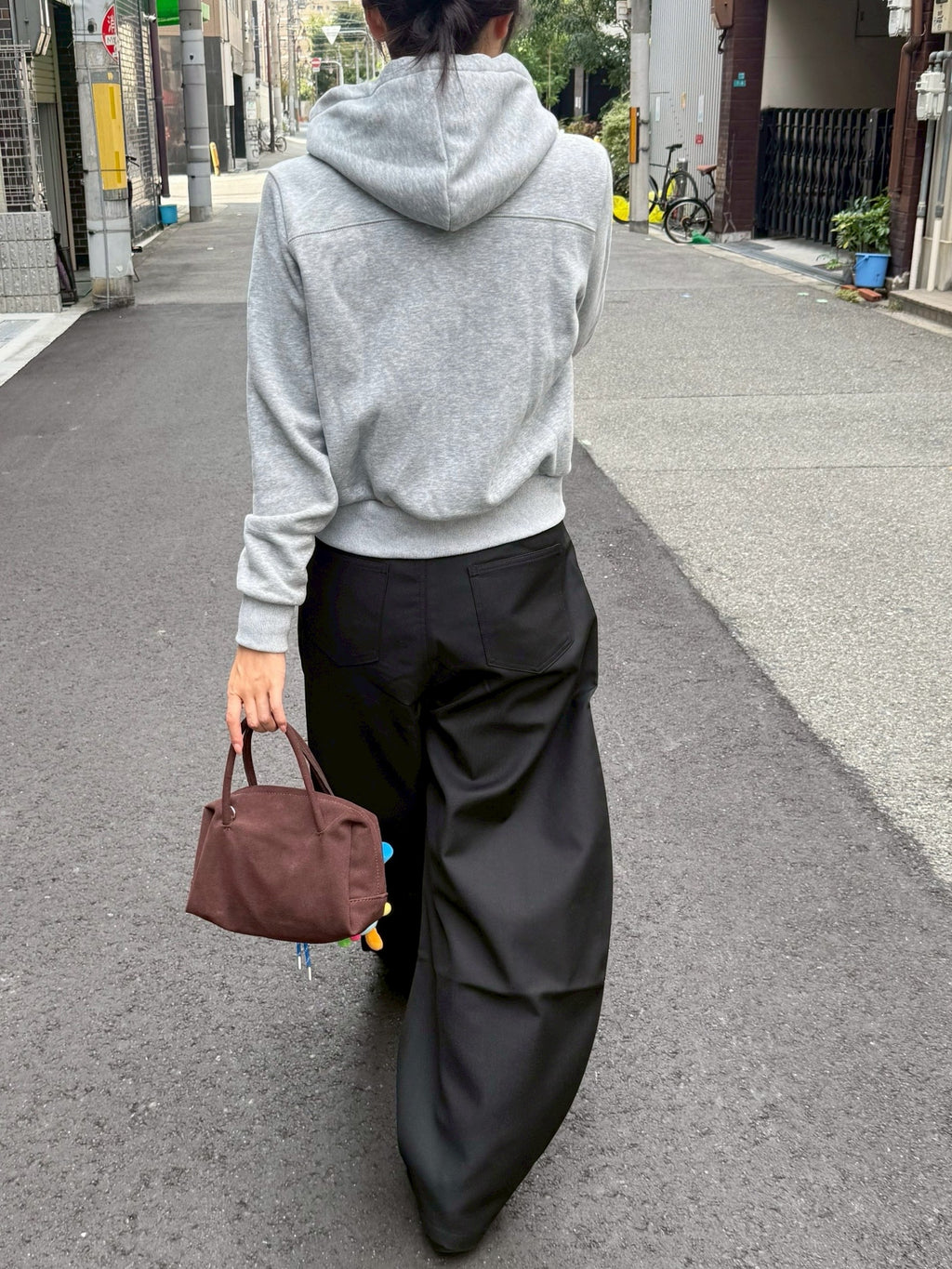 ただ太いだけじゃない、この丸みがコーデの主役。今日はあえてクロップド丈のジップパーカーを合わせて、ストリートな「ゆる×短」バランスに。黒だからトップスを選ばないし、スニーカーとの相性も抜群。バッグチャームで遊び心もプラス。