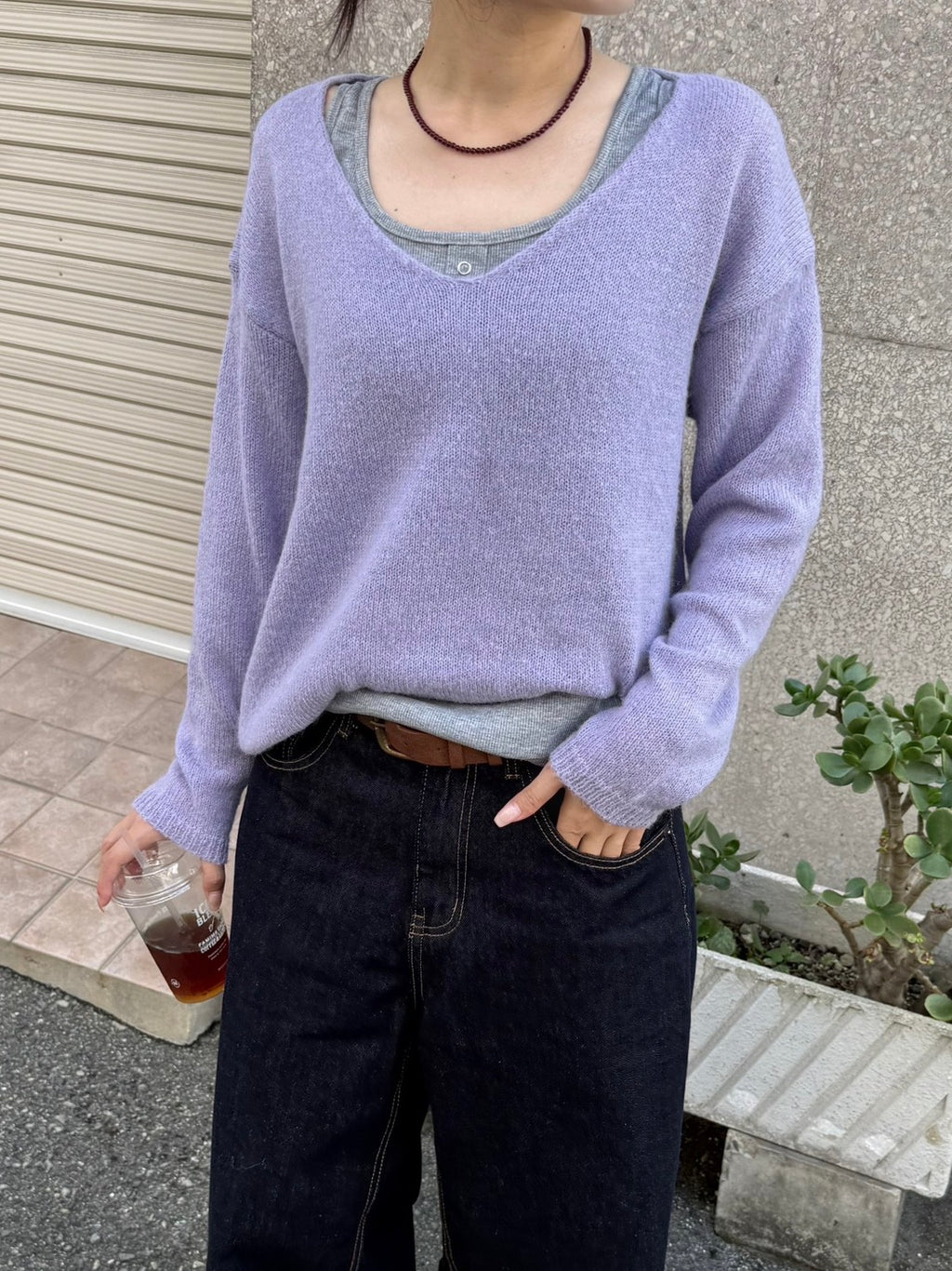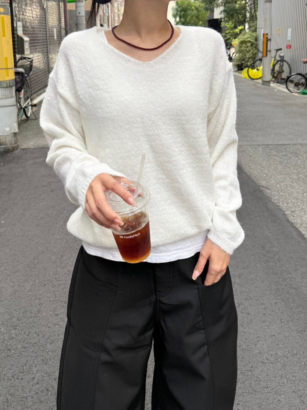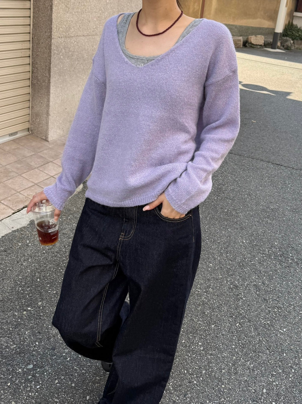 今日はVネックを活かしてレイヤードスタイルに。白ニットには白Tを、ラベンダーにはグレーのヘンリーネックをイン。この首元のレイヤード感がポイント。ボトムスはあえてワイドデニムやスラックスで、ゆるっとリラックス感を。シンプルだけど、素材感と色味で差をつけるのがマイルール。