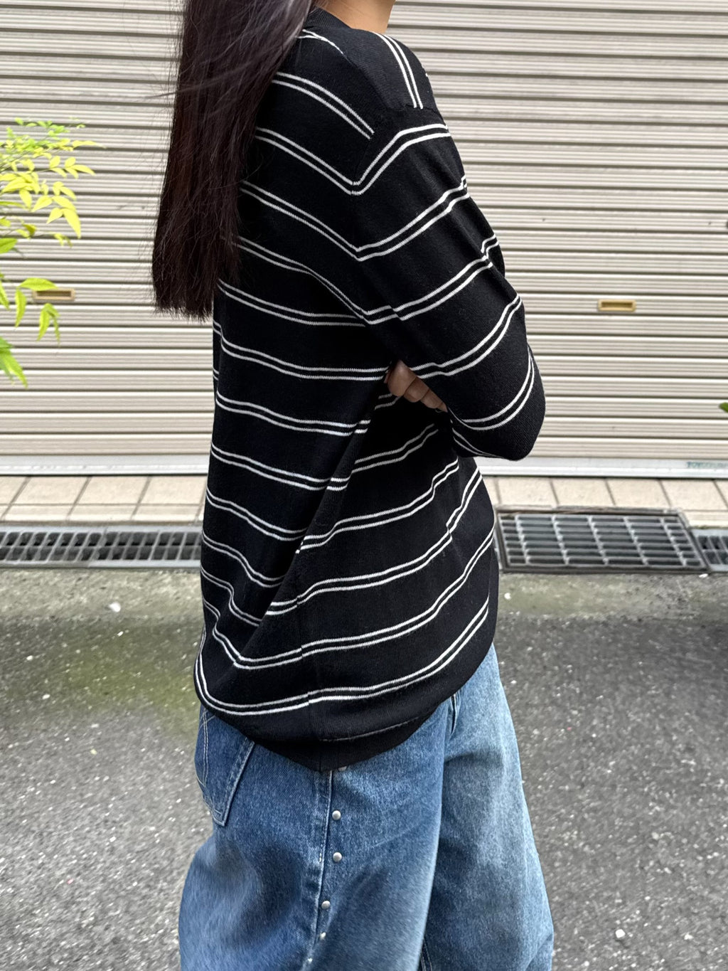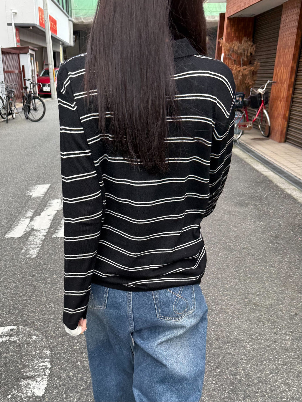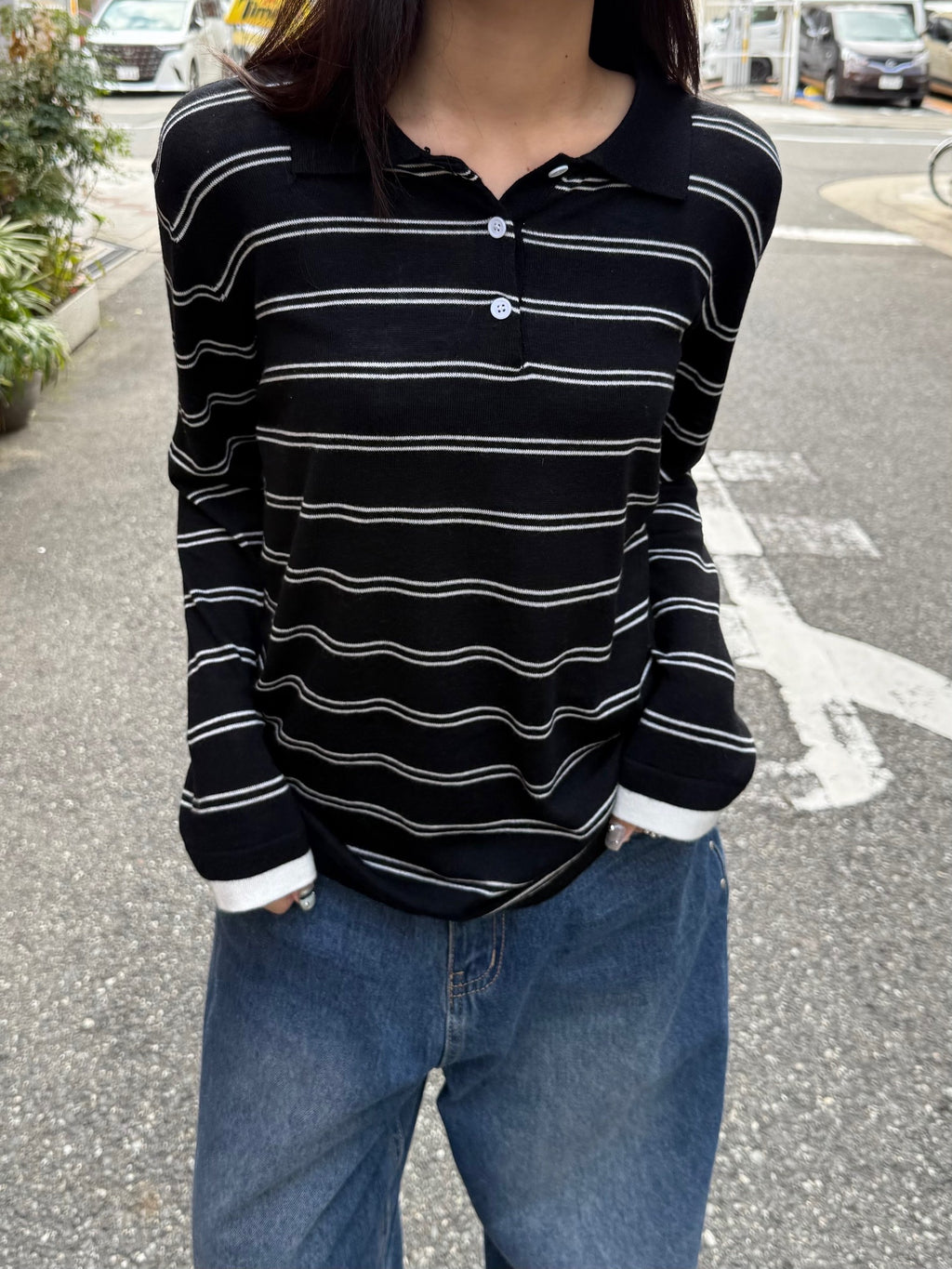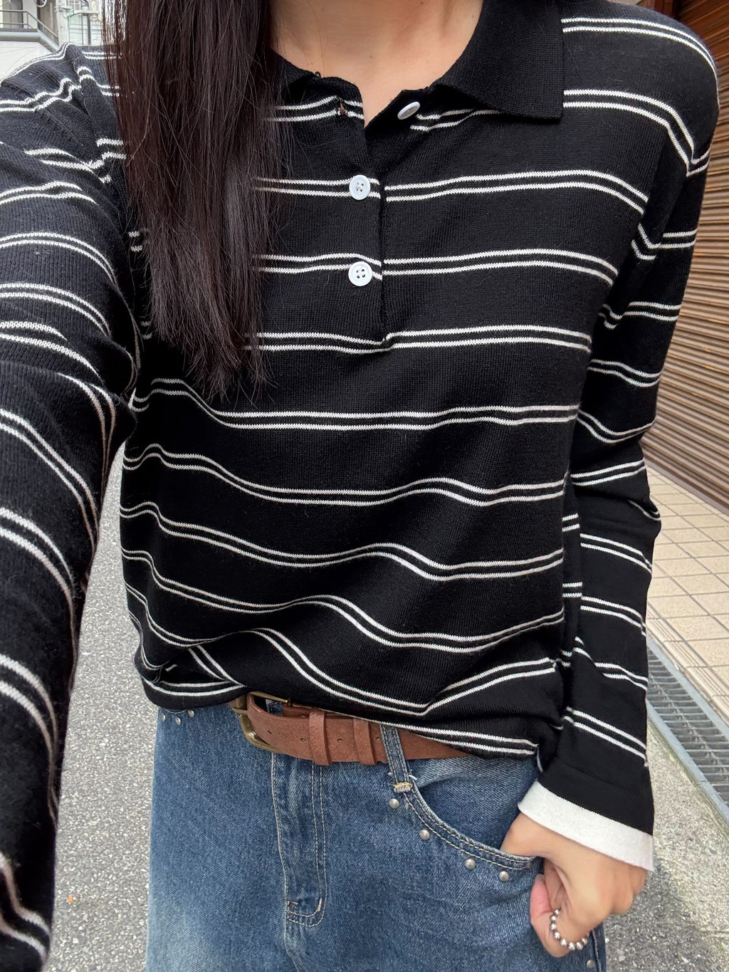 スクールライクな襟付きデザインを、あえてルーズなスタッズデニムとブラウンベルトでハズすのがマイルール。ニット素材だからラフすぎず、ほどよい落ち感が◎。袖口の白をチラ見せしたり、ボタンを一つ開けて抜け感を出す。これ一枚でコーデがキマる優れもの。