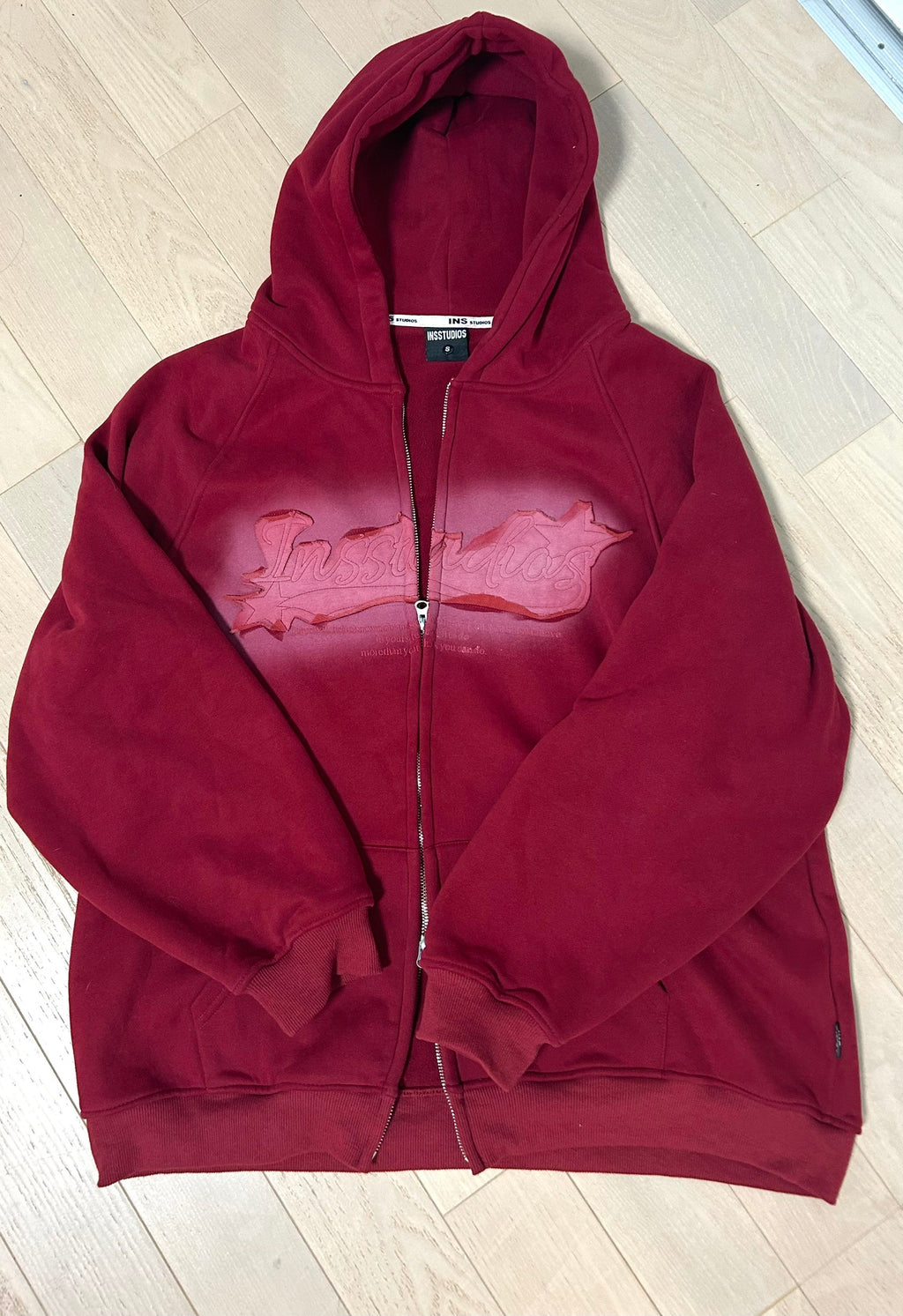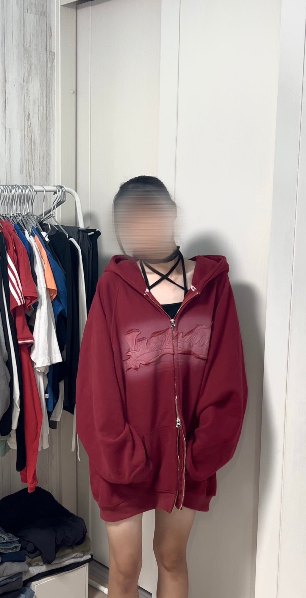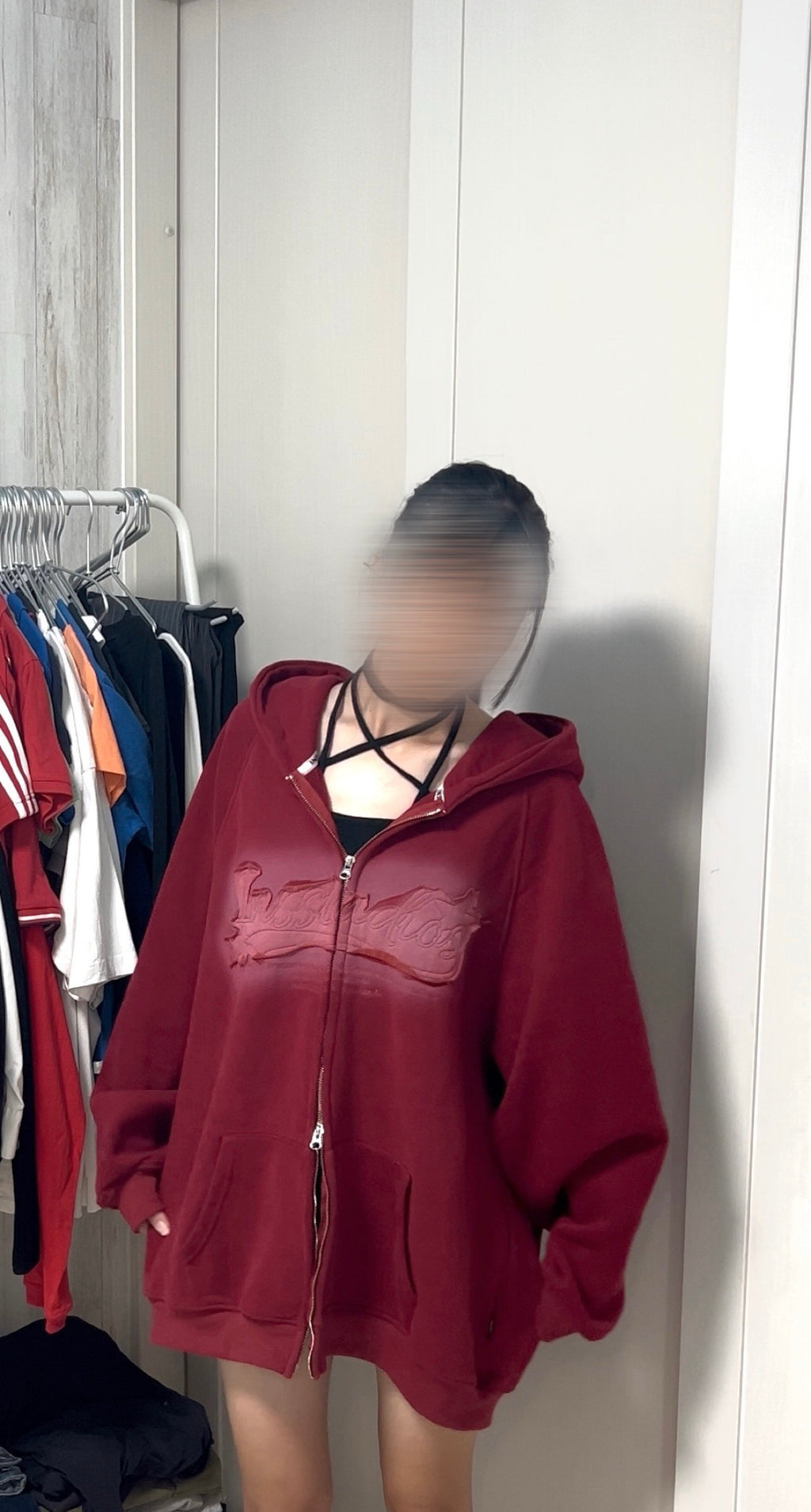 深みのあるレッドのZIPパーカーは、ストリート感とこなれ感を同時に演出してくれる主役アイテム。