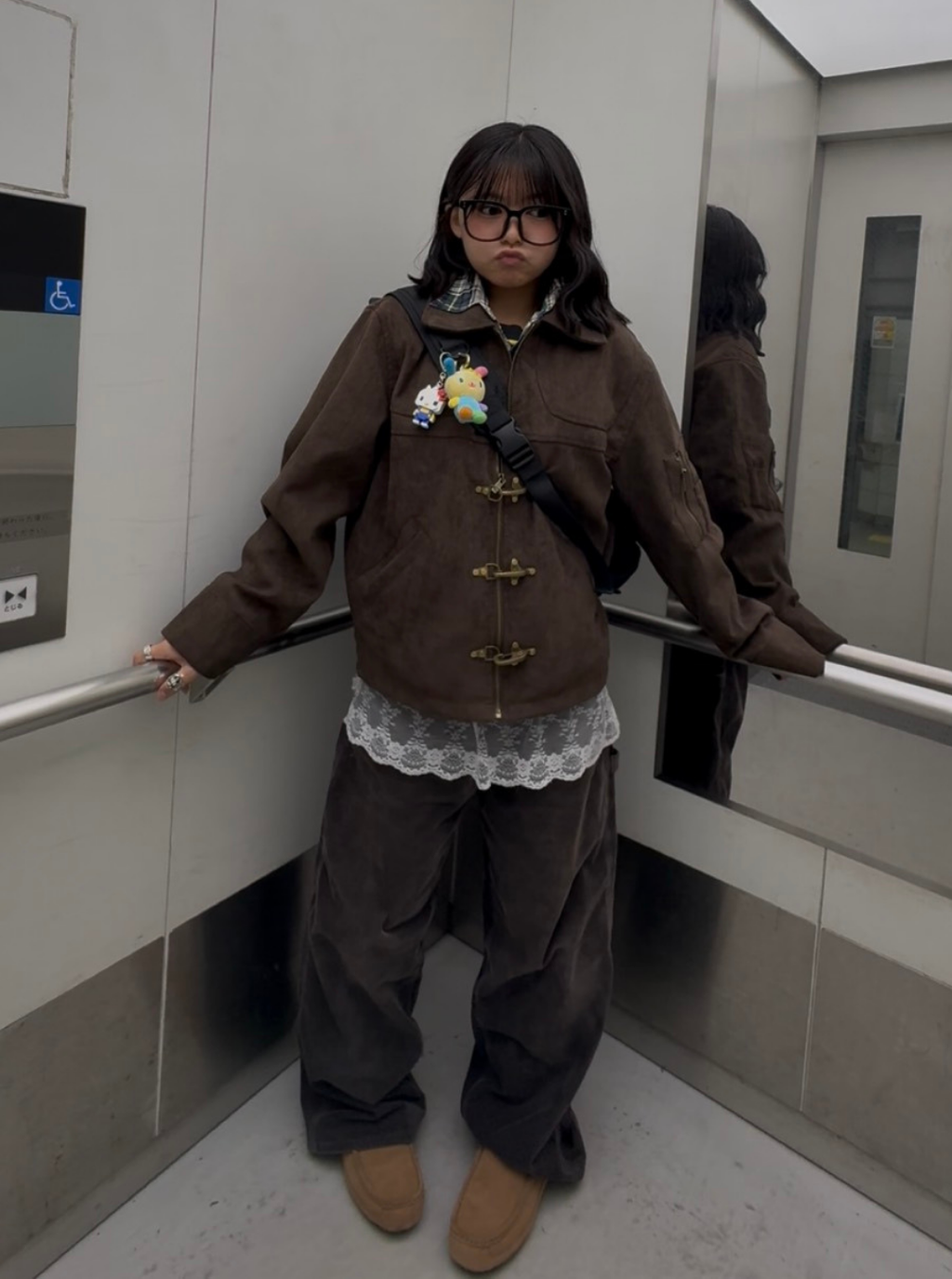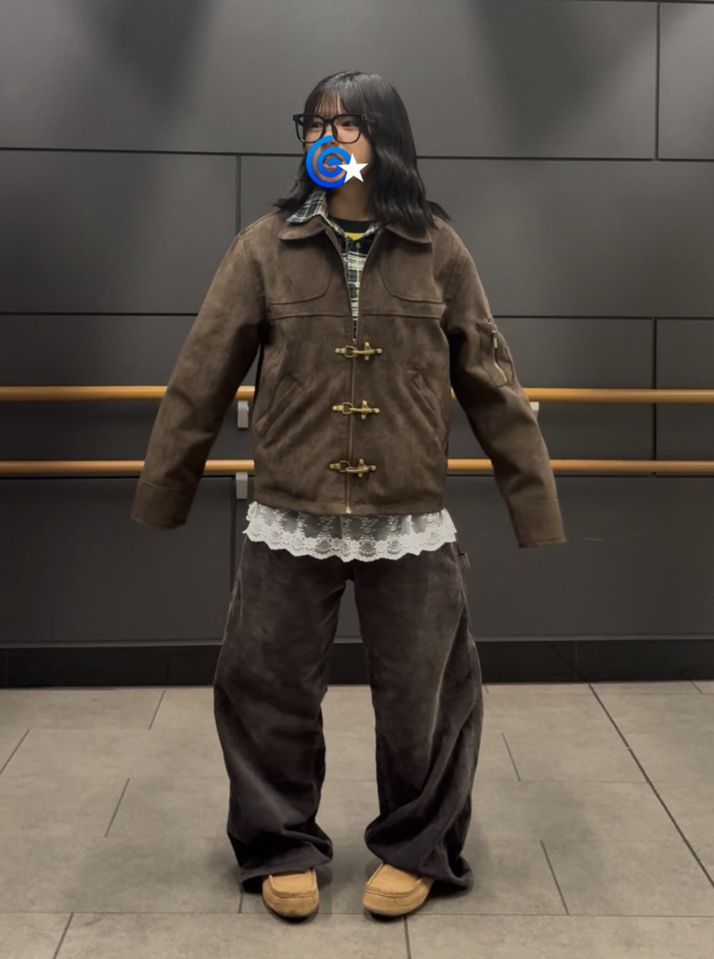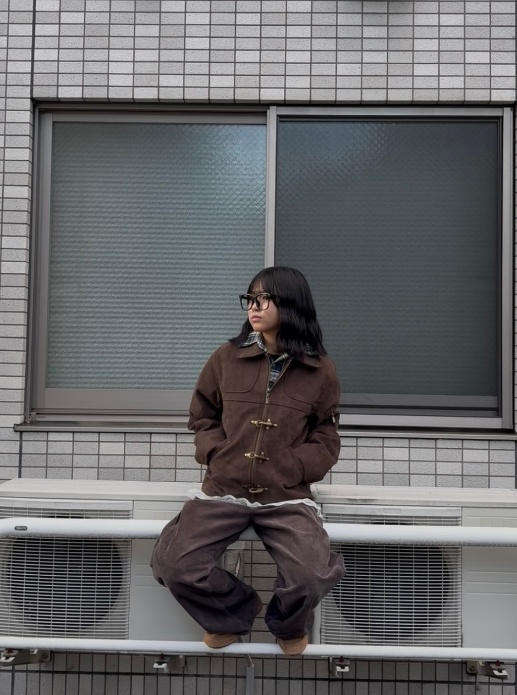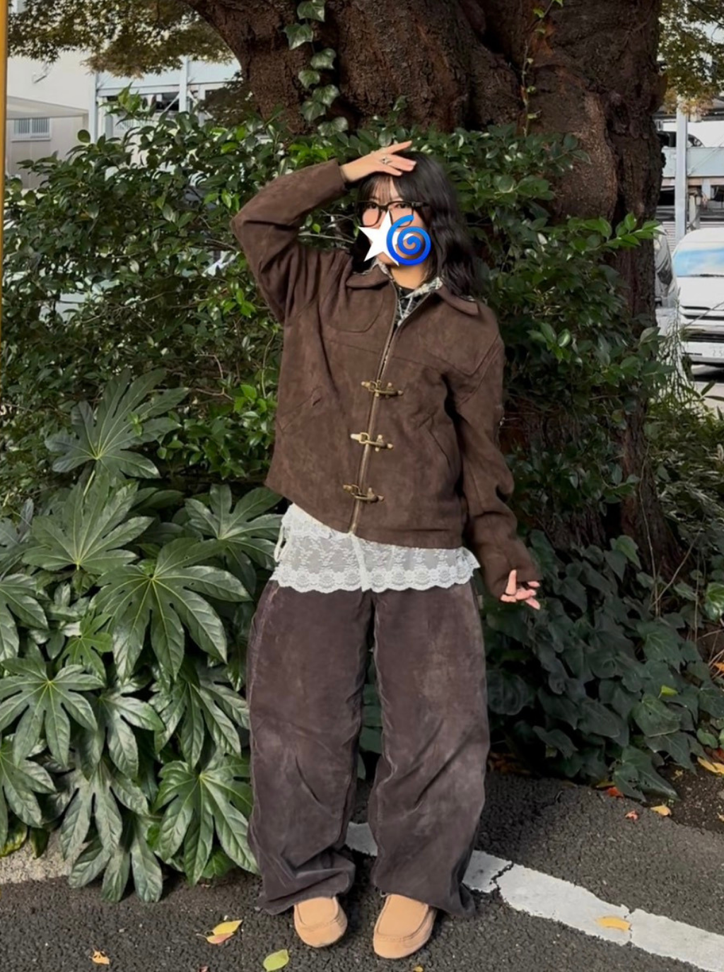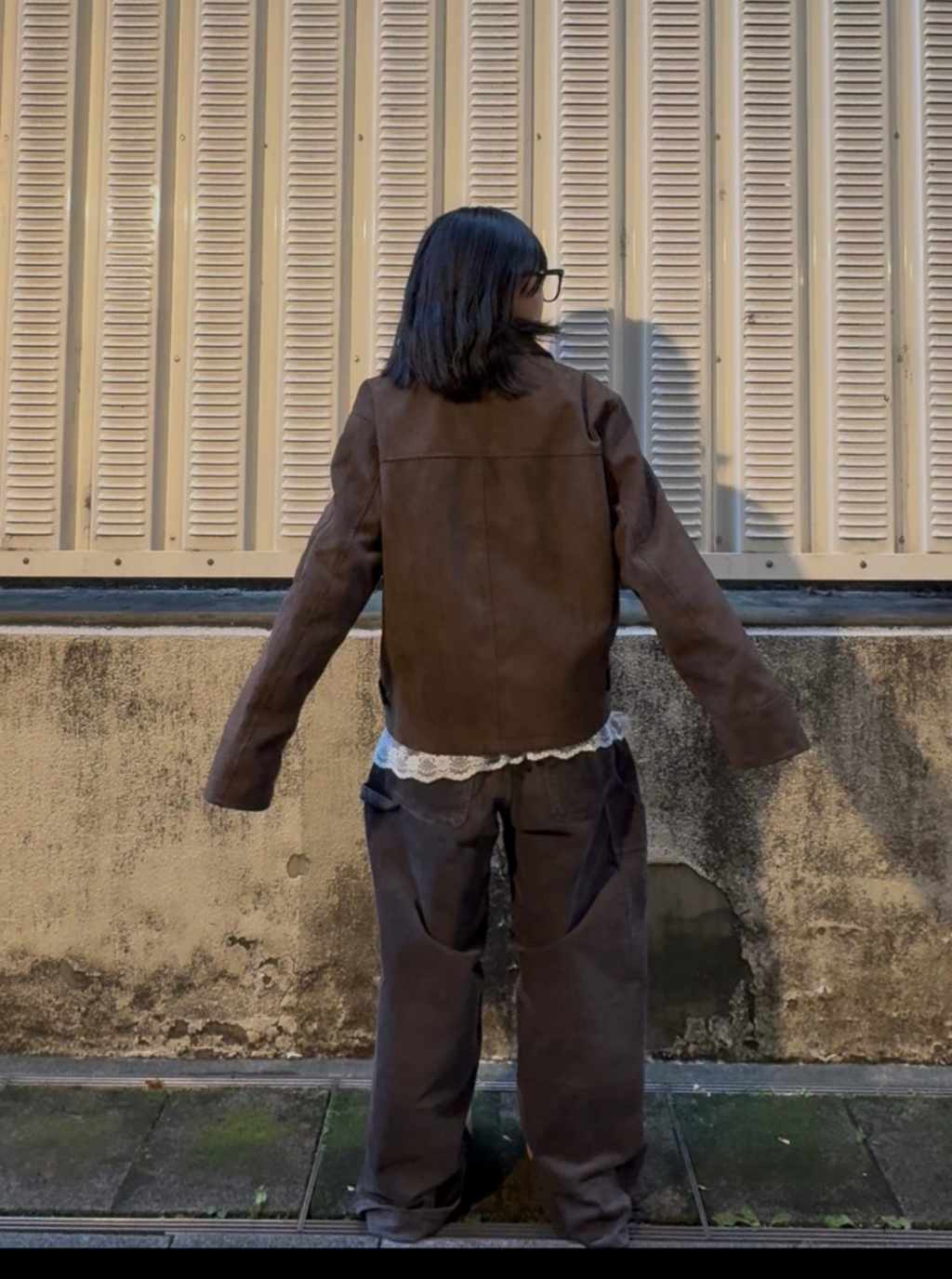 レトロな雰囲気がたまらない。あえての短丈だから、ボトムスは極太のワイドパンツ一択。この「短×太」のシルエットが今の気分。今日はインナーのチェックシャツもパンツもブラウン系でまとめて、秋のワントーンコーデ。羽織るだけでサマになる。