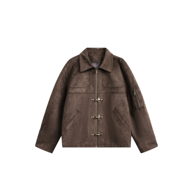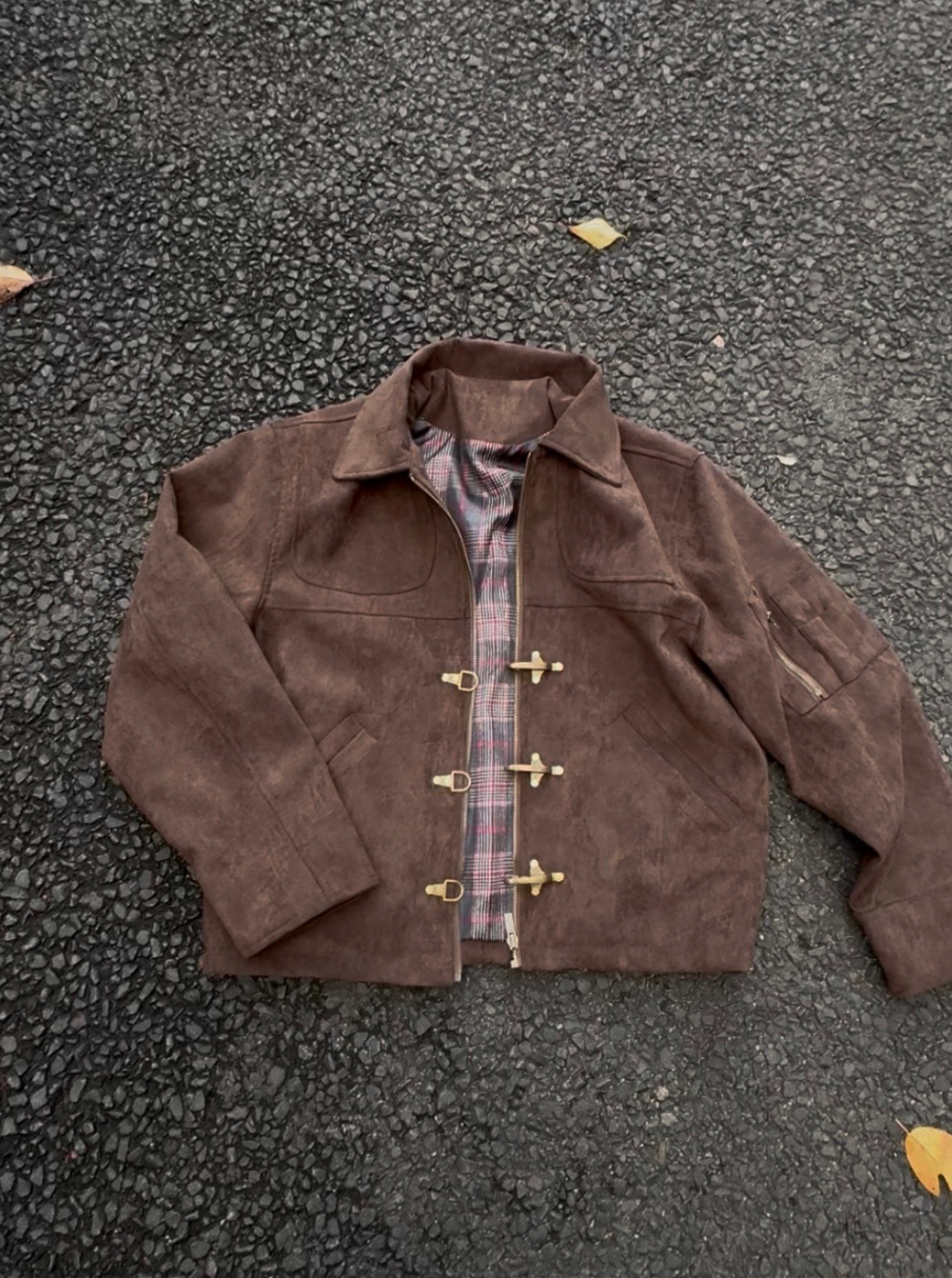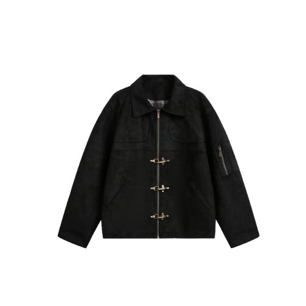 このスエードライクなブルゾンは、なんといってもこのメタリックなトグルボタンが主役。