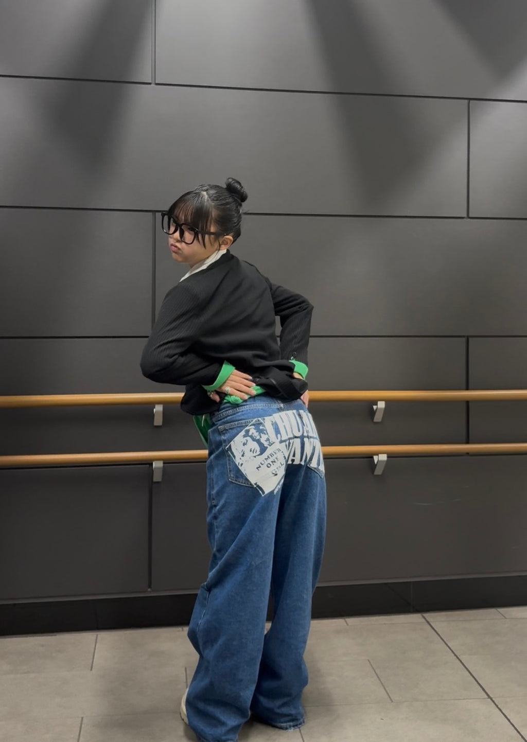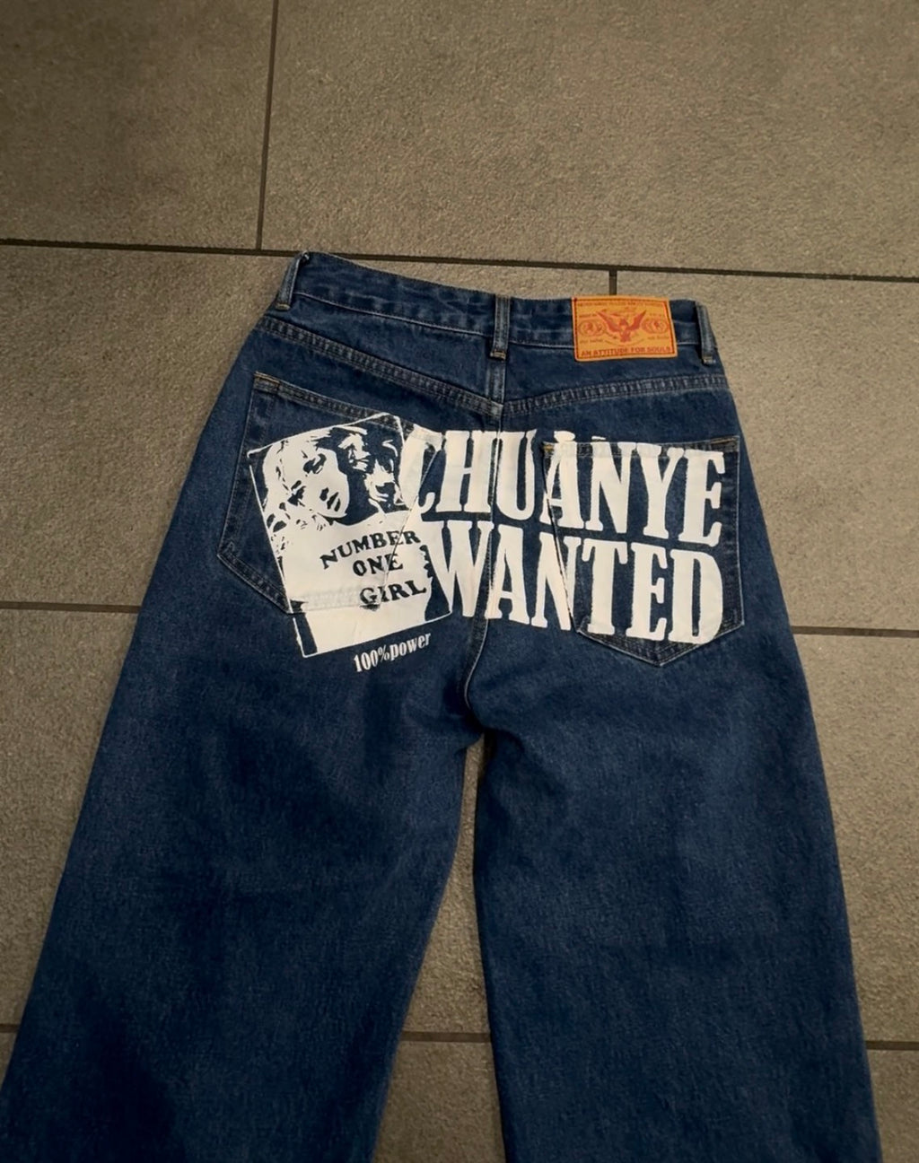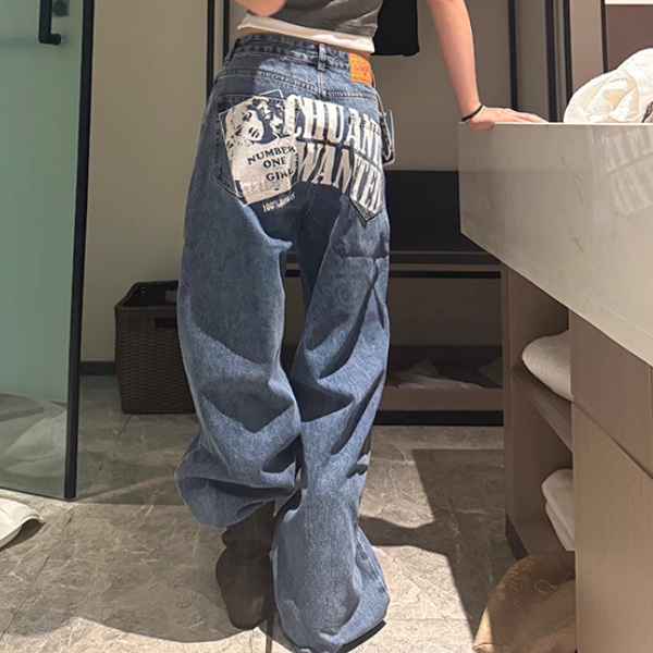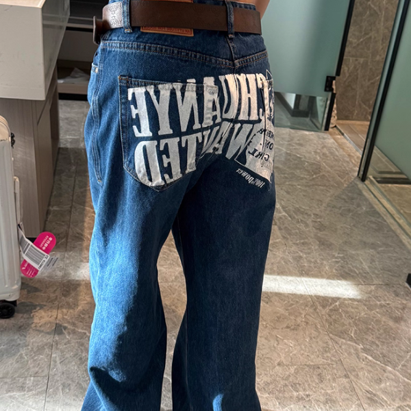 コーデの主役は、バックプリントが効いたこの極太デニム。