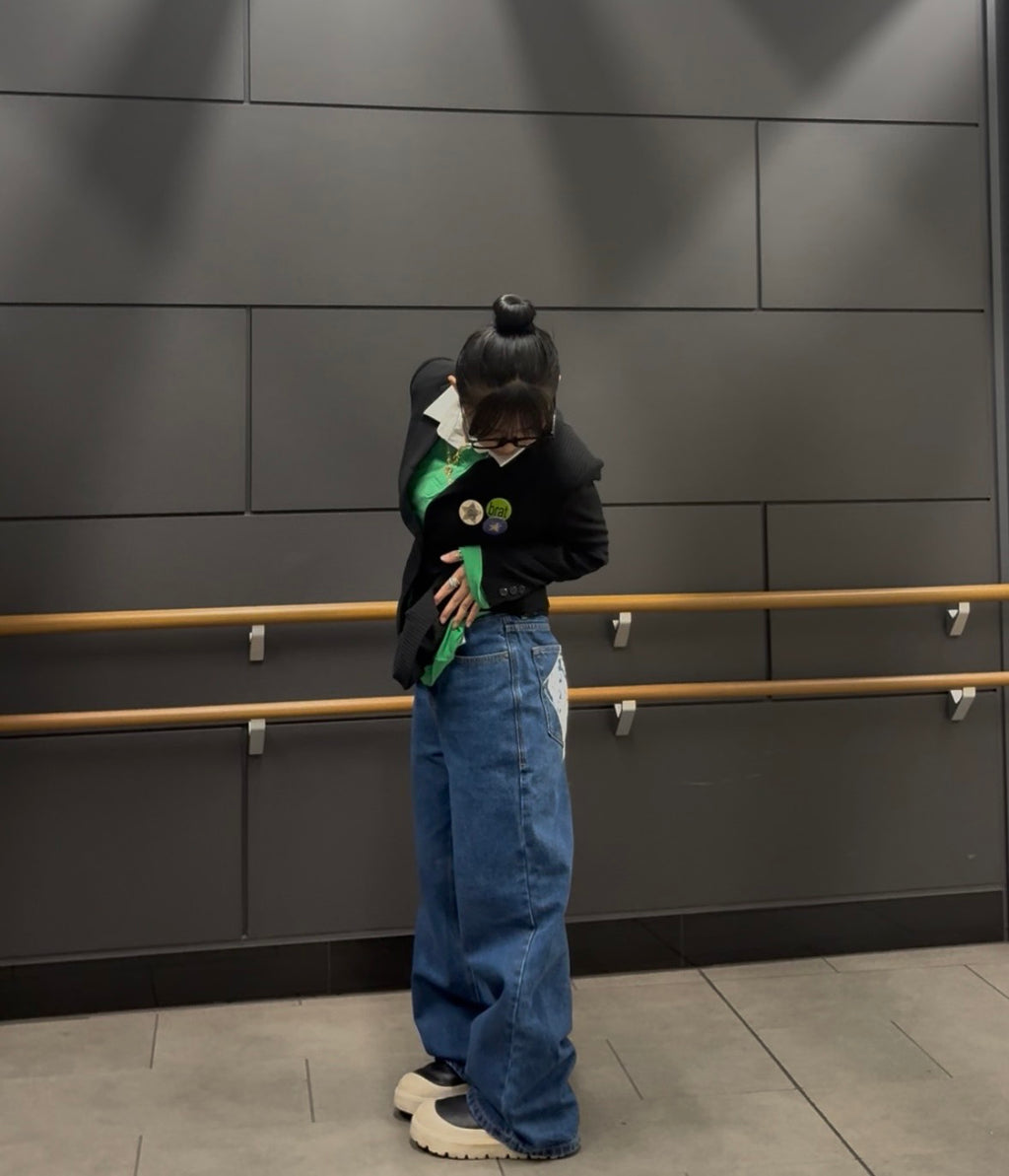 このダボっと感がキモ。今日はあえてブレザーと差し色の緑ニットで、プレッピーとストリートをMIX。裾からレースを覗かせるのもポイント。このアンバランス感がたまらない。