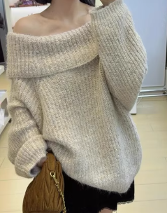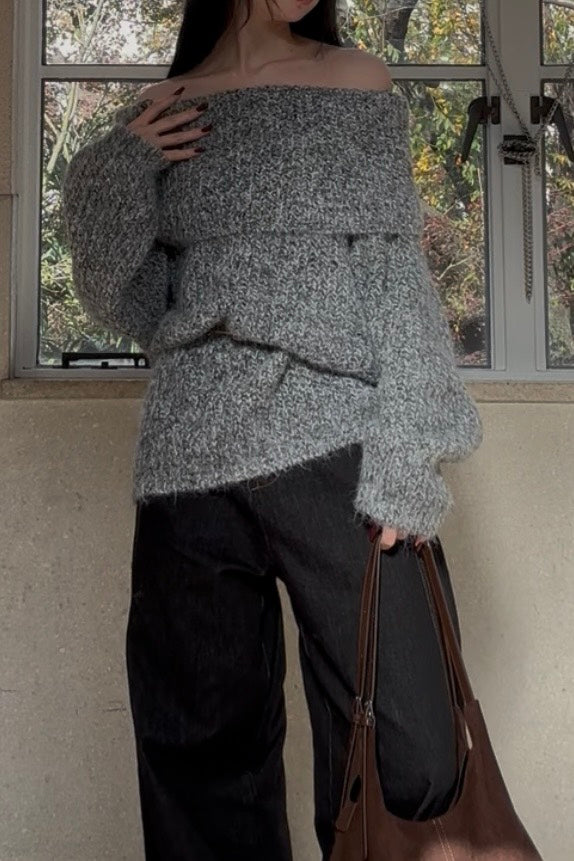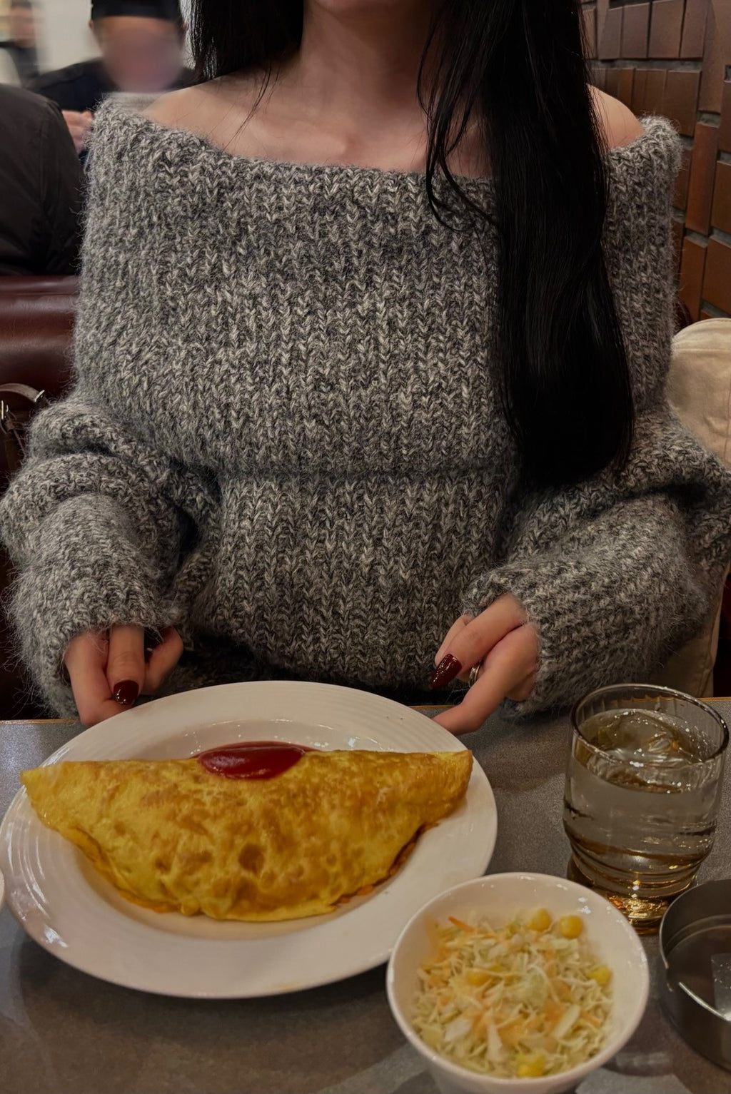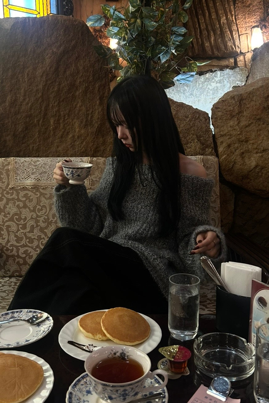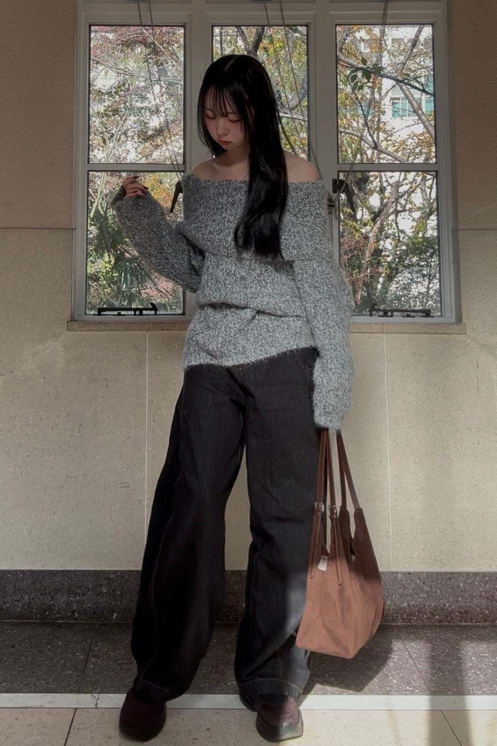 このフェザーヤーンのニット、ふわふわした質感が最高に可愛い。オフショルでデコルテを見せて、少し甘めに振るのが気分。でも、ボトムスはブラックの極太デニムでクールに引き締めるのがマイルール。足元はブラウンの厚底シューズでY2K感をプラス。甘すぎない、大人のリラックススタイル。