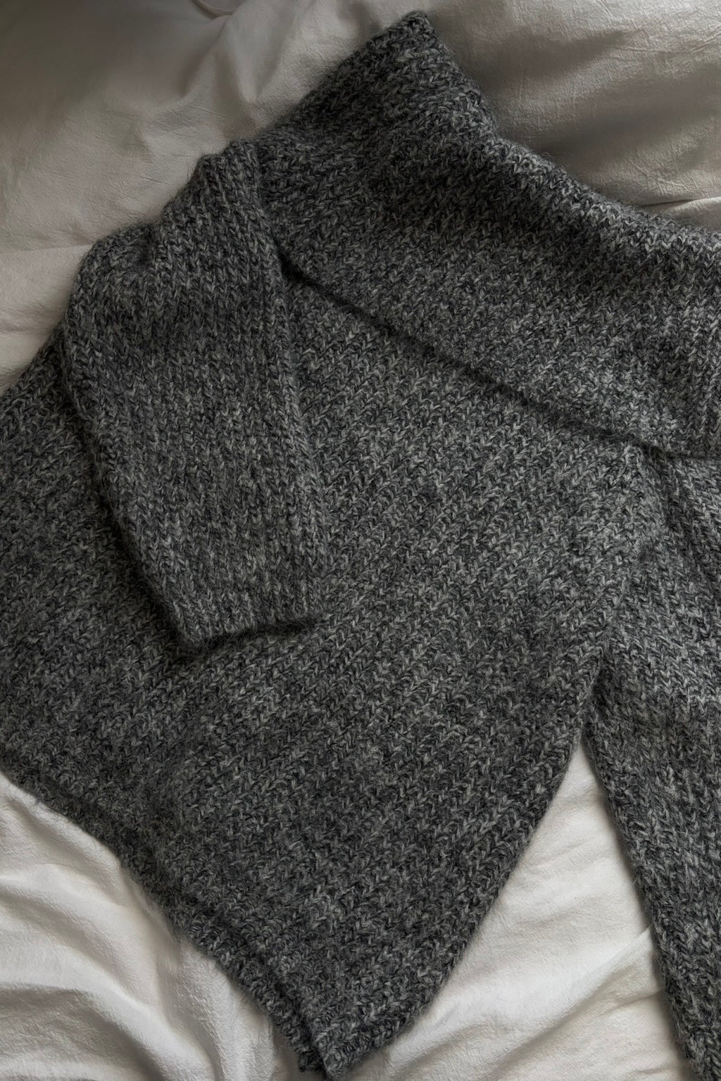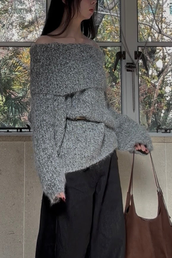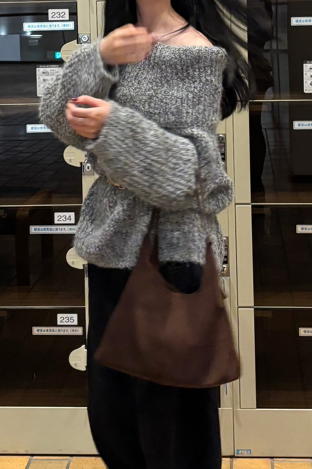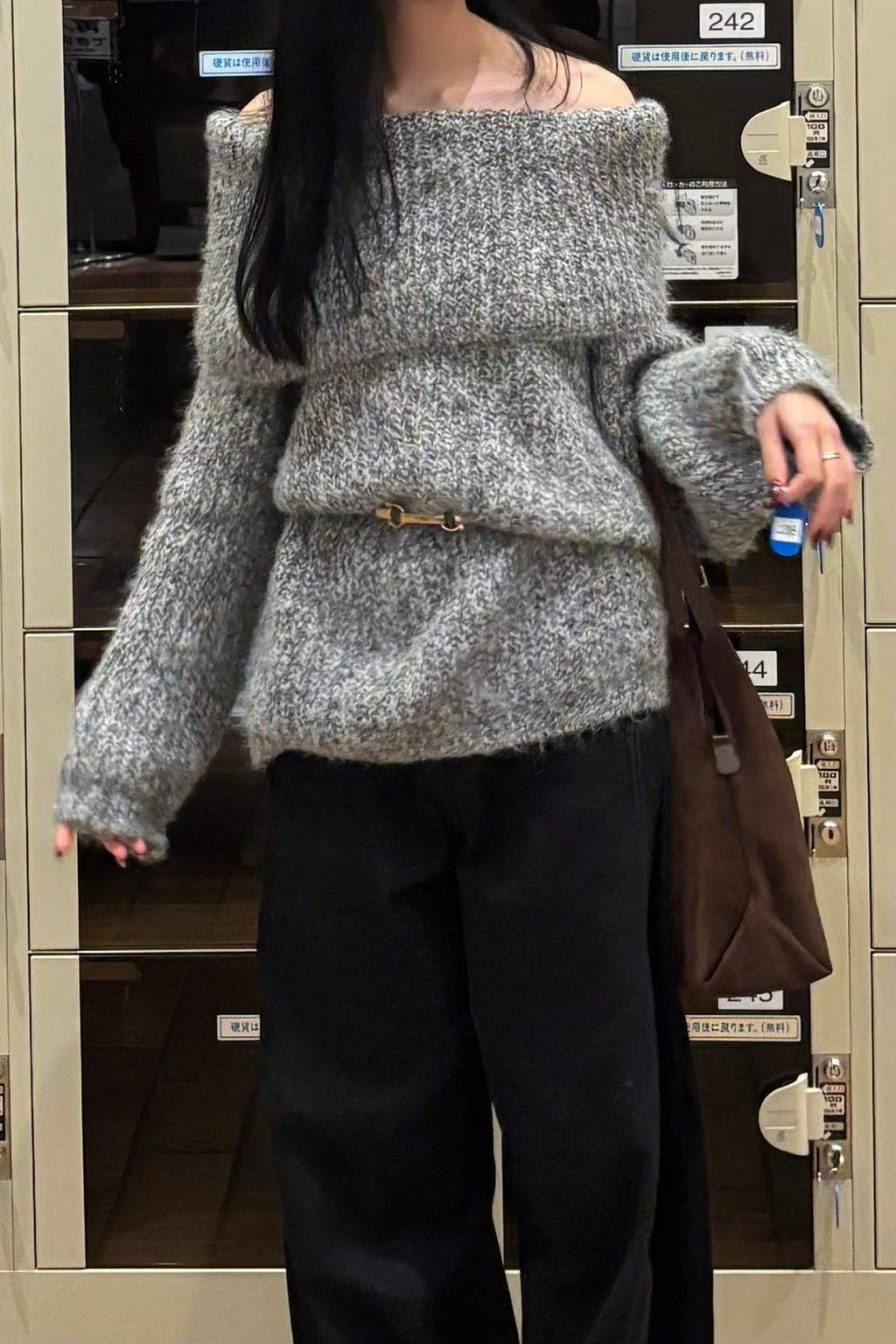 このフェザーヤーンのニット、ふわふわした質感が最高に可愛い。オフショルでデコルテを見せて、少し甘めに振るのが気分。でも、ボトムスはブラックの極太デニムでクールに引き締めるのがマイルール。足元はブラウンの厚底シューズでY2K感をプラス。甘すぎない、大人のリラックススタイル。