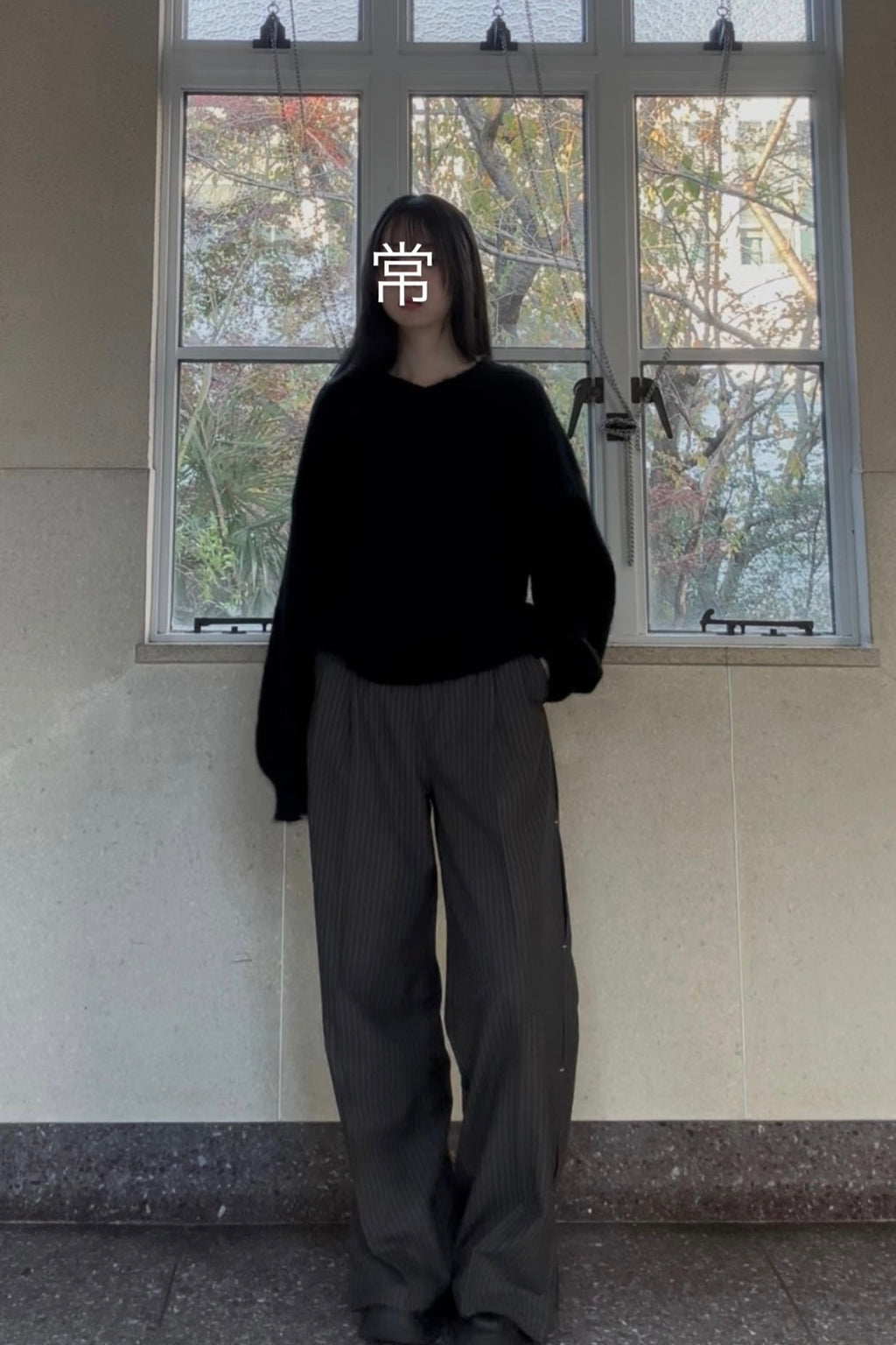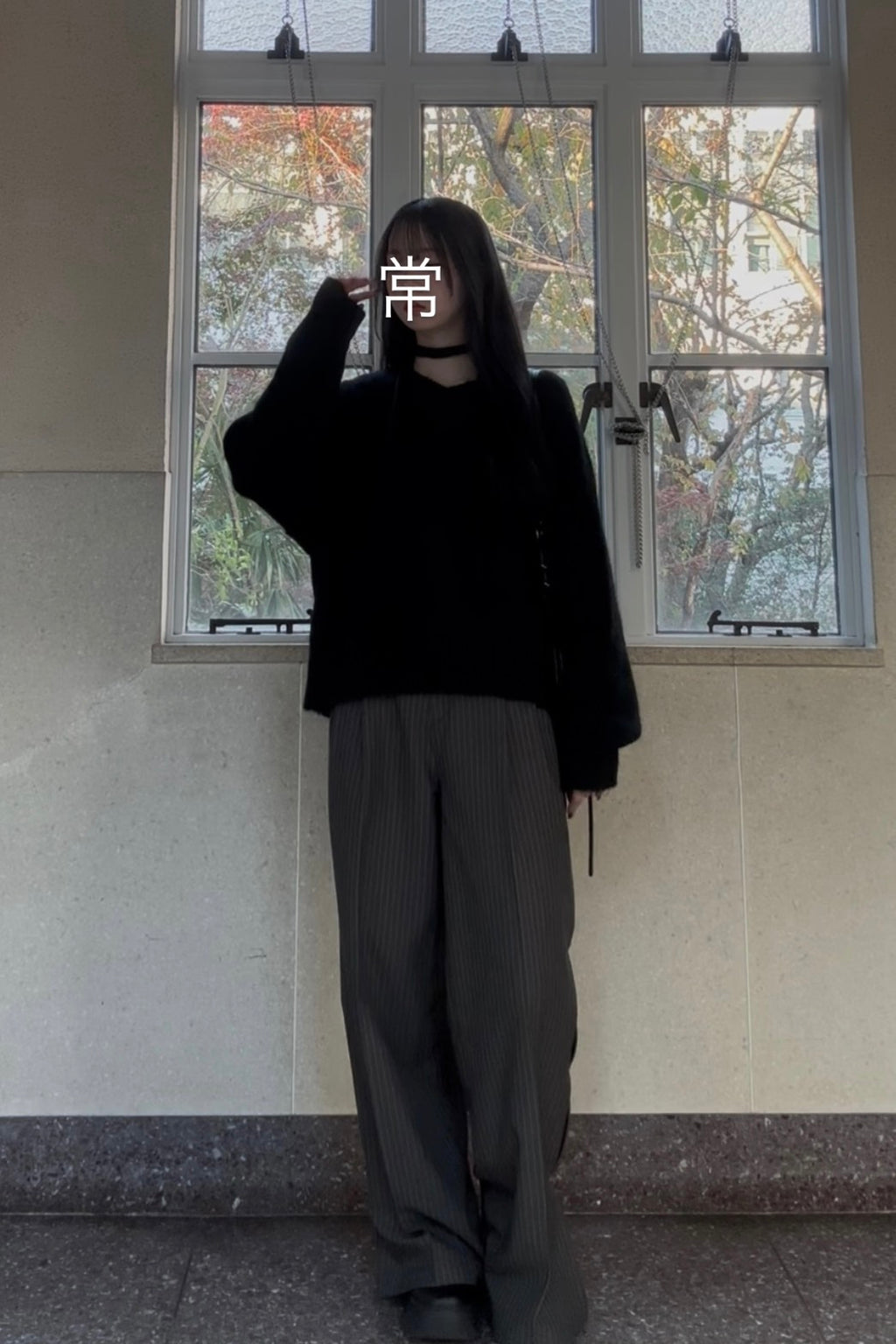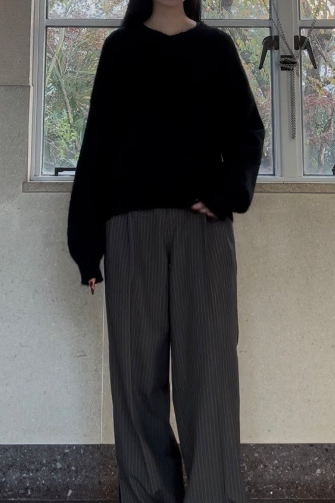 ふわっと空気を含んだブラックニットは、シンプルなのに雰囲気が出るのが好きなところ。落ち感のあるワイドなストライプパンツと合わせて、ゆるさの中に大人っぽさを少しだけプラスしました。首元はVネックで抜け感を作りつつ、オールブラックでも重くならないシルエットバランスにしています。