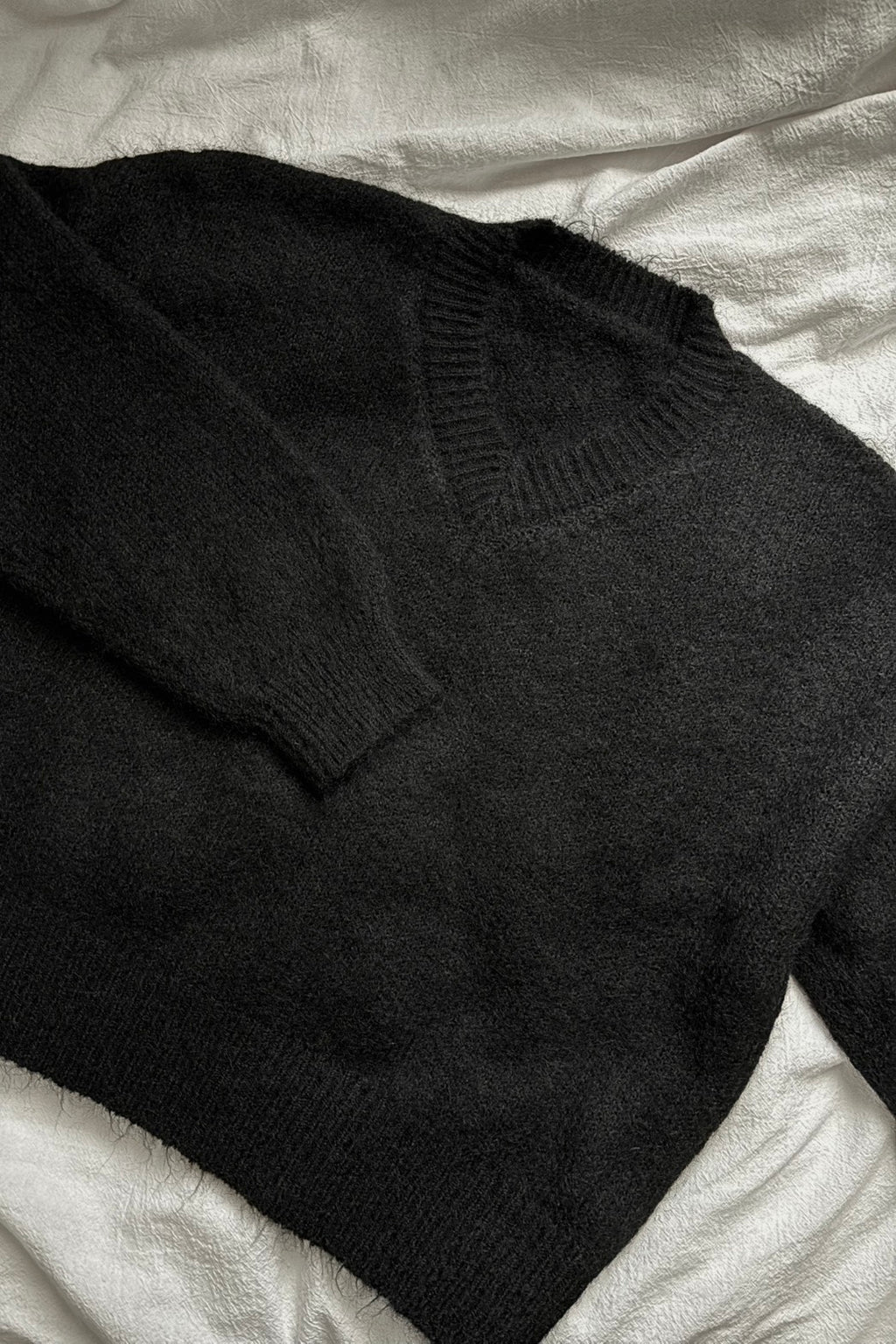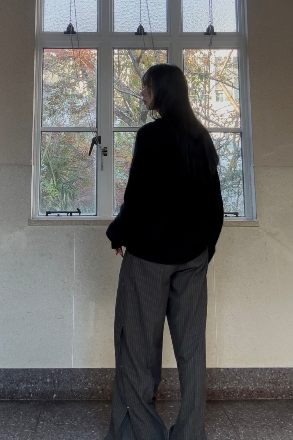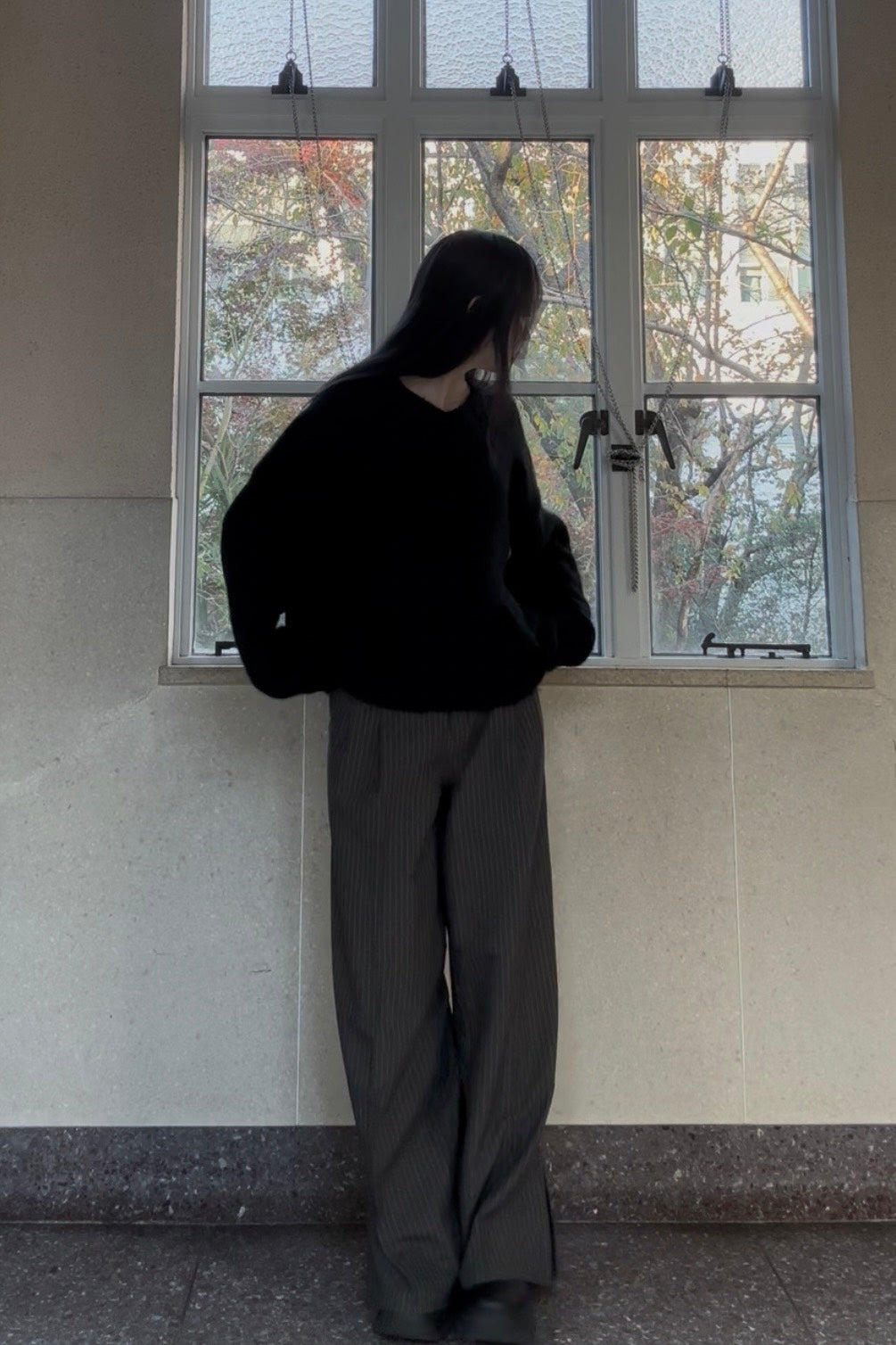 ふわっと空気を含んだブラックニットは、シンプルなのに雰囲気が出るのが好きなところ。落ち感のあるワイドなストライプパンツと合わせて、ゆるさの中に大人っぽさを少しだけプラスしました。首元はVネックで抜け感を作りつつ、オールブラックでも重くならないシルエットバランスにしています。