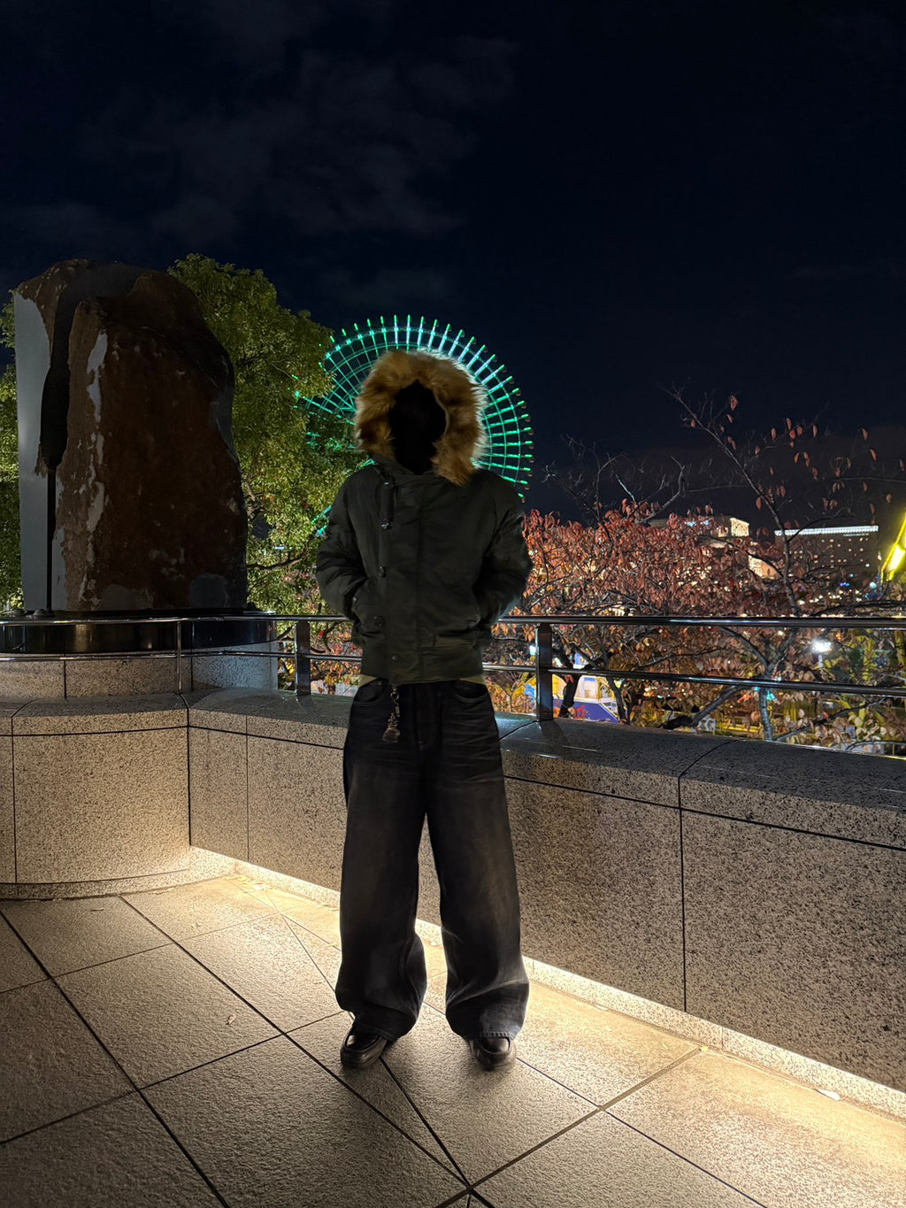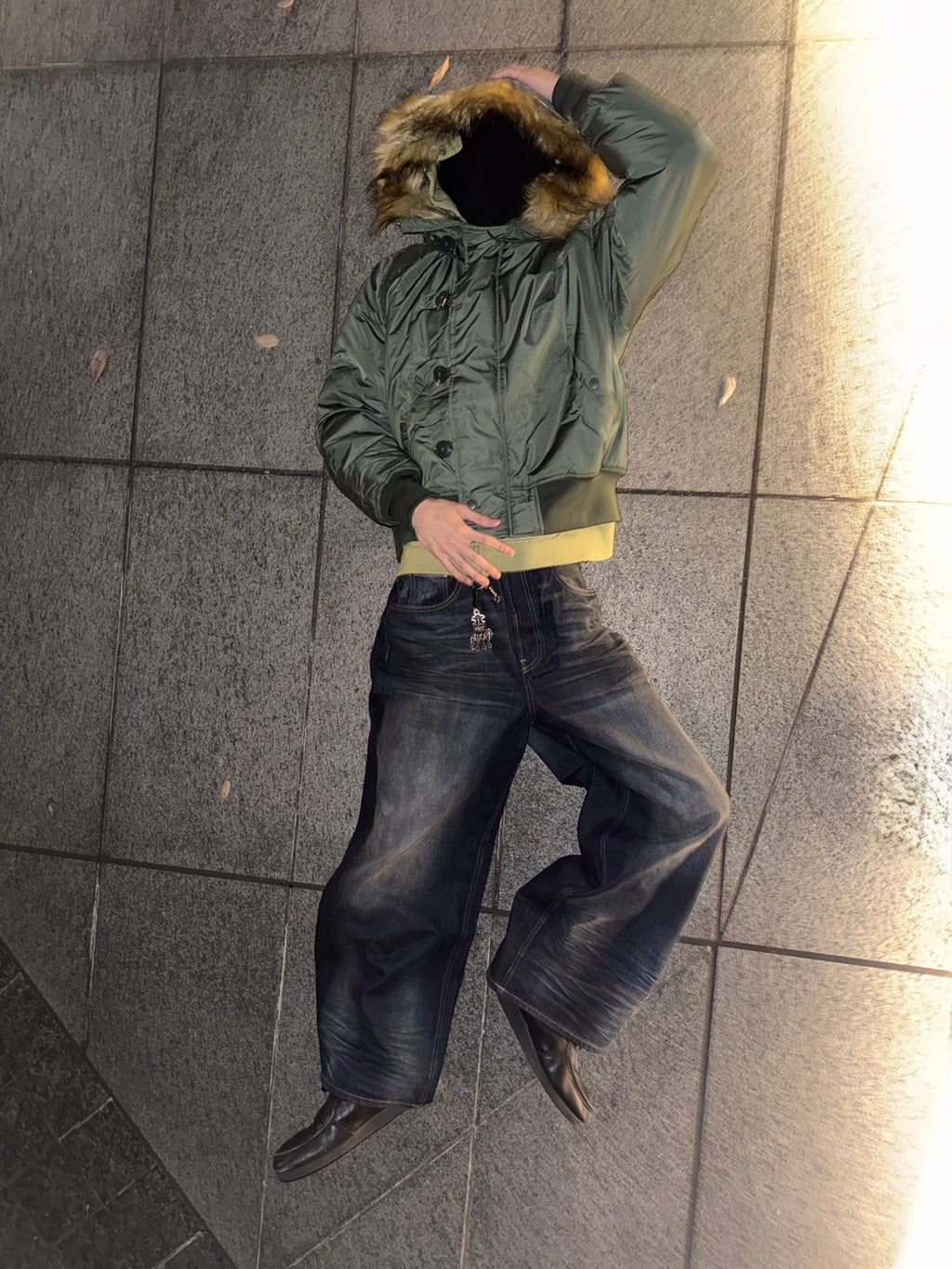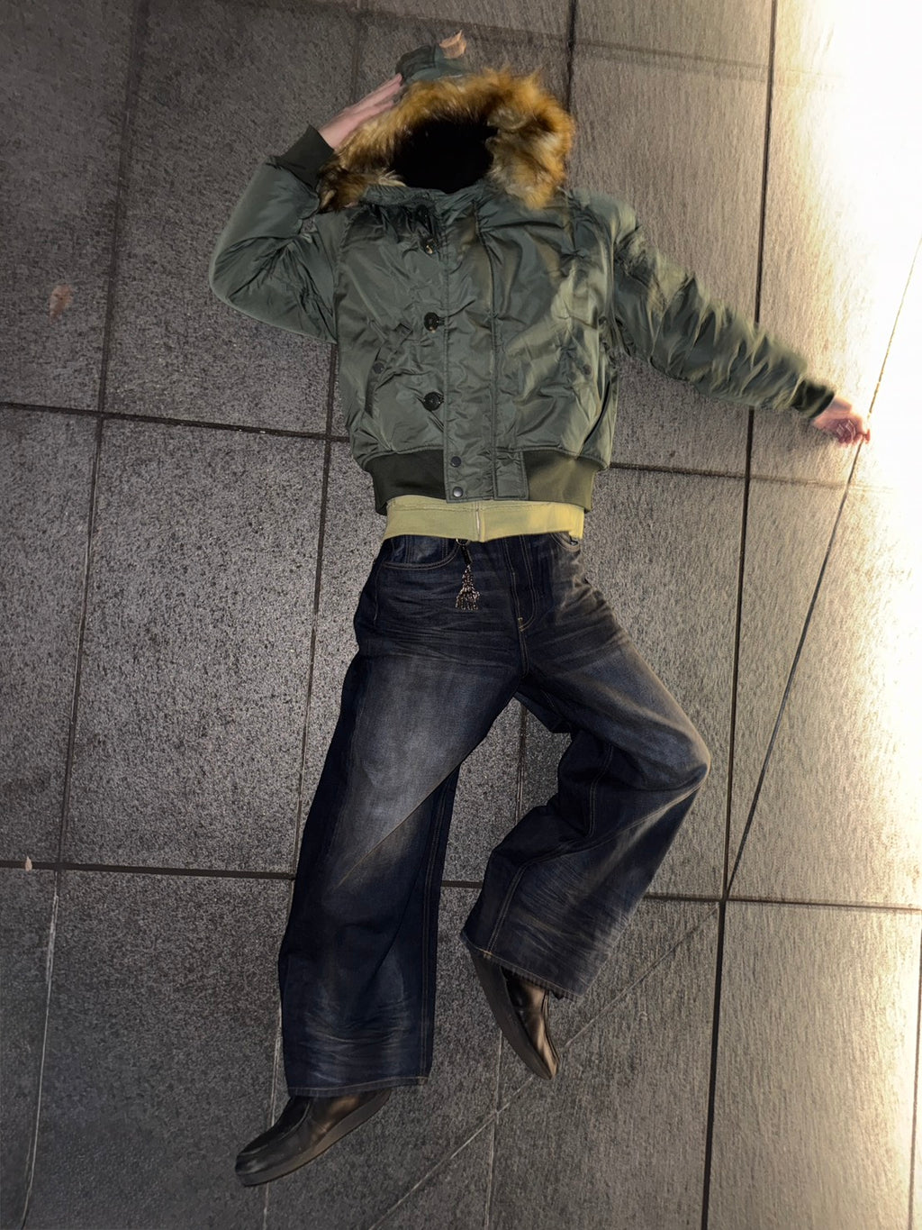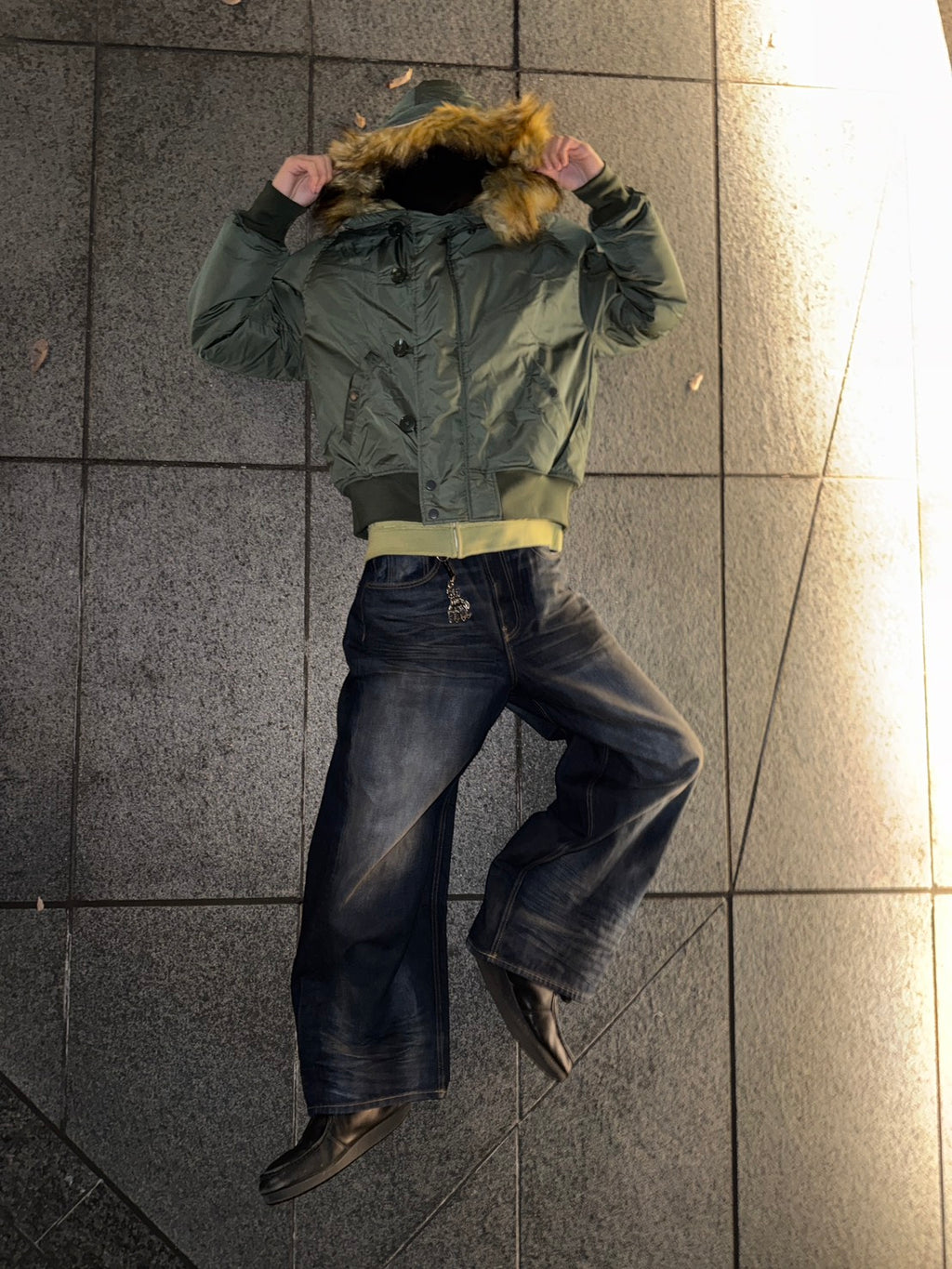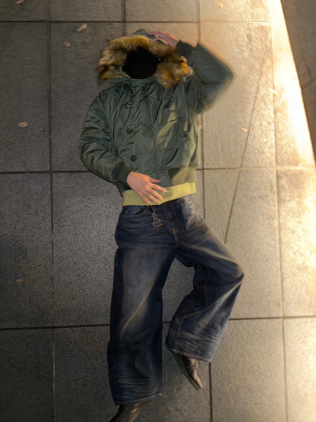 今日の主役は、このN-2Bフライトジャケット。ボリューム感のあるファー付きフードと、コンパクトなショート丈がたまらない。ミリタリーなオリーブグリーンには、あえてヴィンテージ加工の極太バギーデニムを合わせて、とことん「重×重」なY2Kストリートに。インナーのイエローを裾からチラ見せして、抜け感を出すのがマイルール。