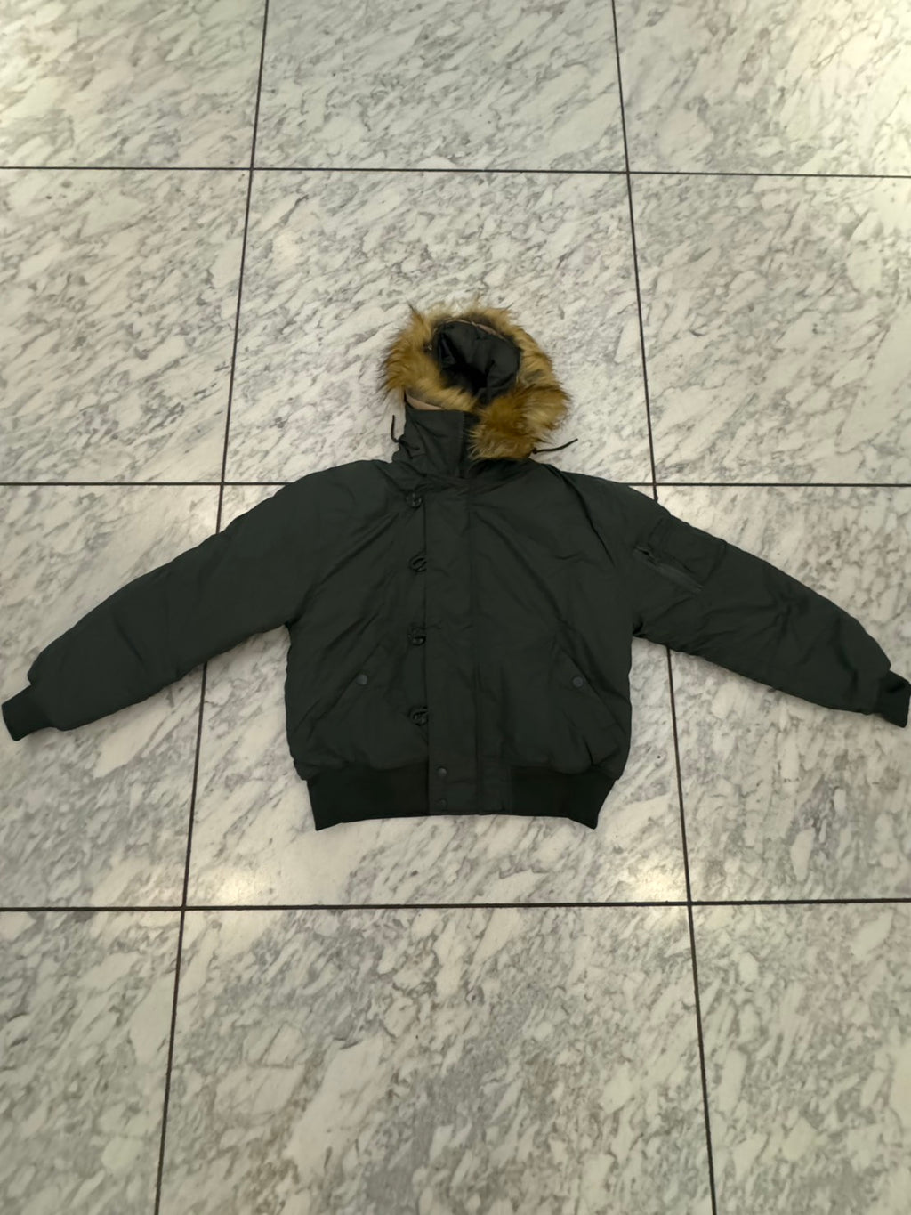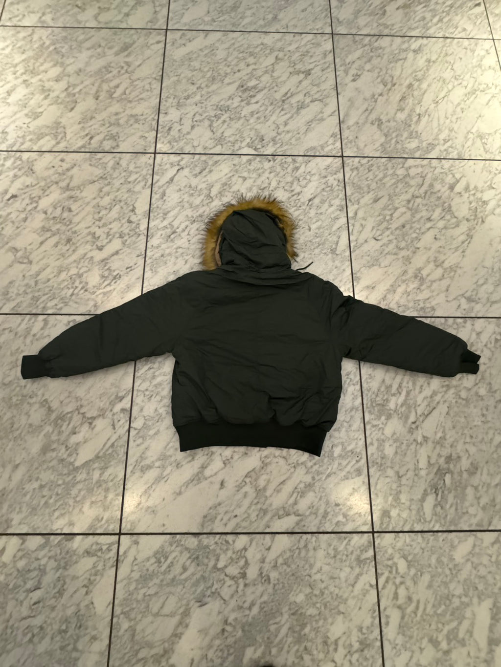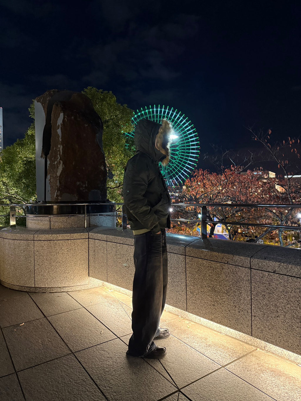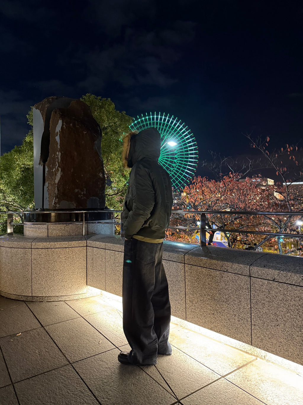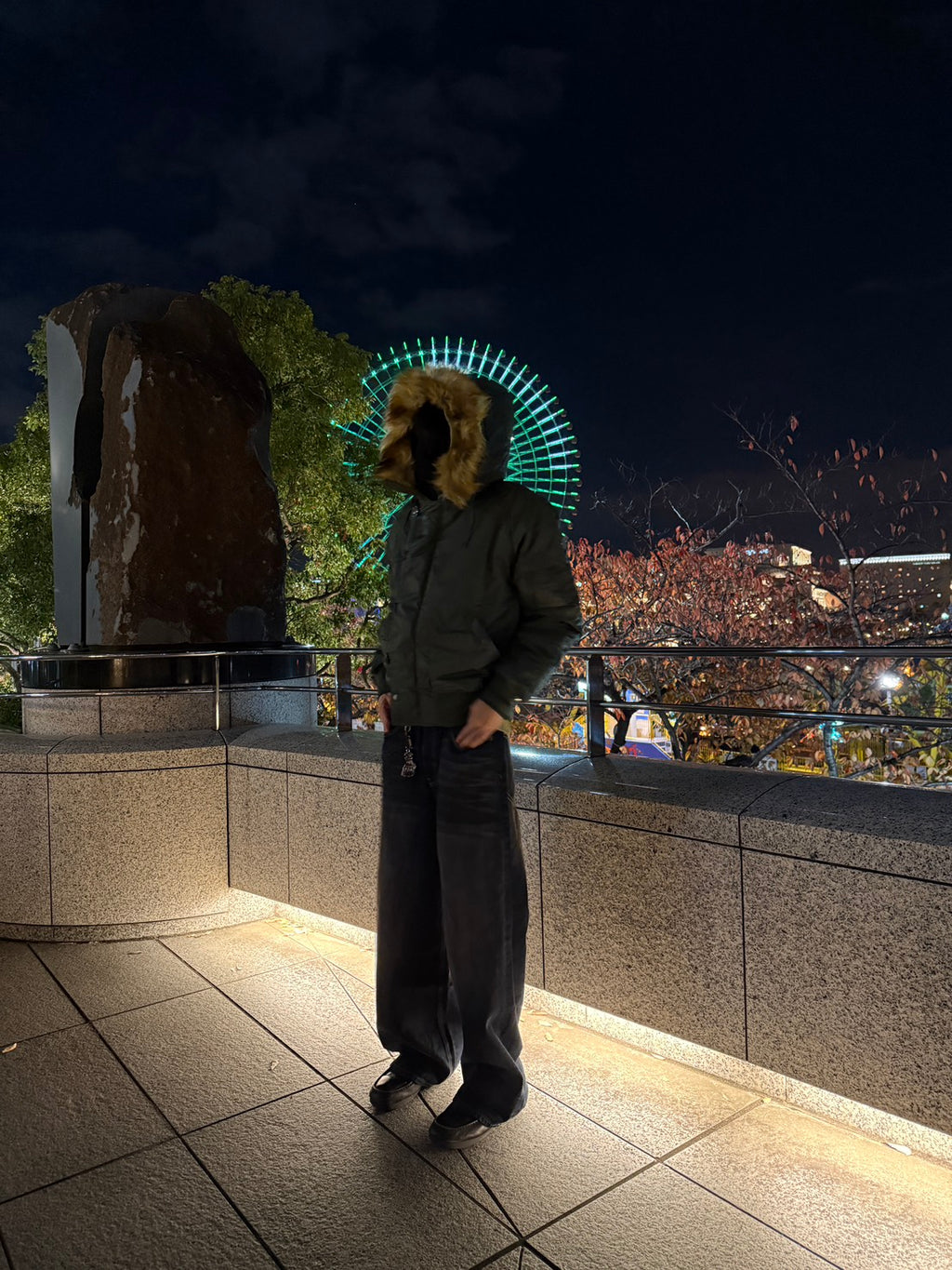 今日の主役は、このN-2Bフライトジャケット。ボリューム感のあるファー付きフードと、コンパクトなショート丈がたまらない。ミリタリーなオリーブグリーンには、あえてヴィンテージ加工の極太バギーデニムを合わせて、とことん「重×重」なY2Kストリートに。インナーのイエローを裾からチラ見せして、抜け感を出すのがマイルール。