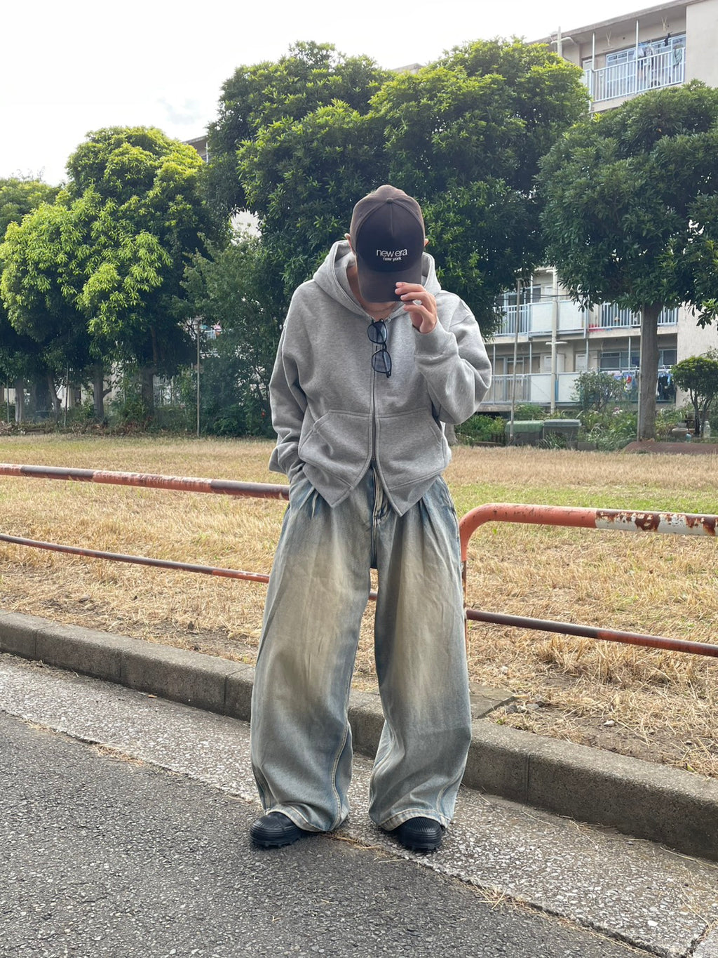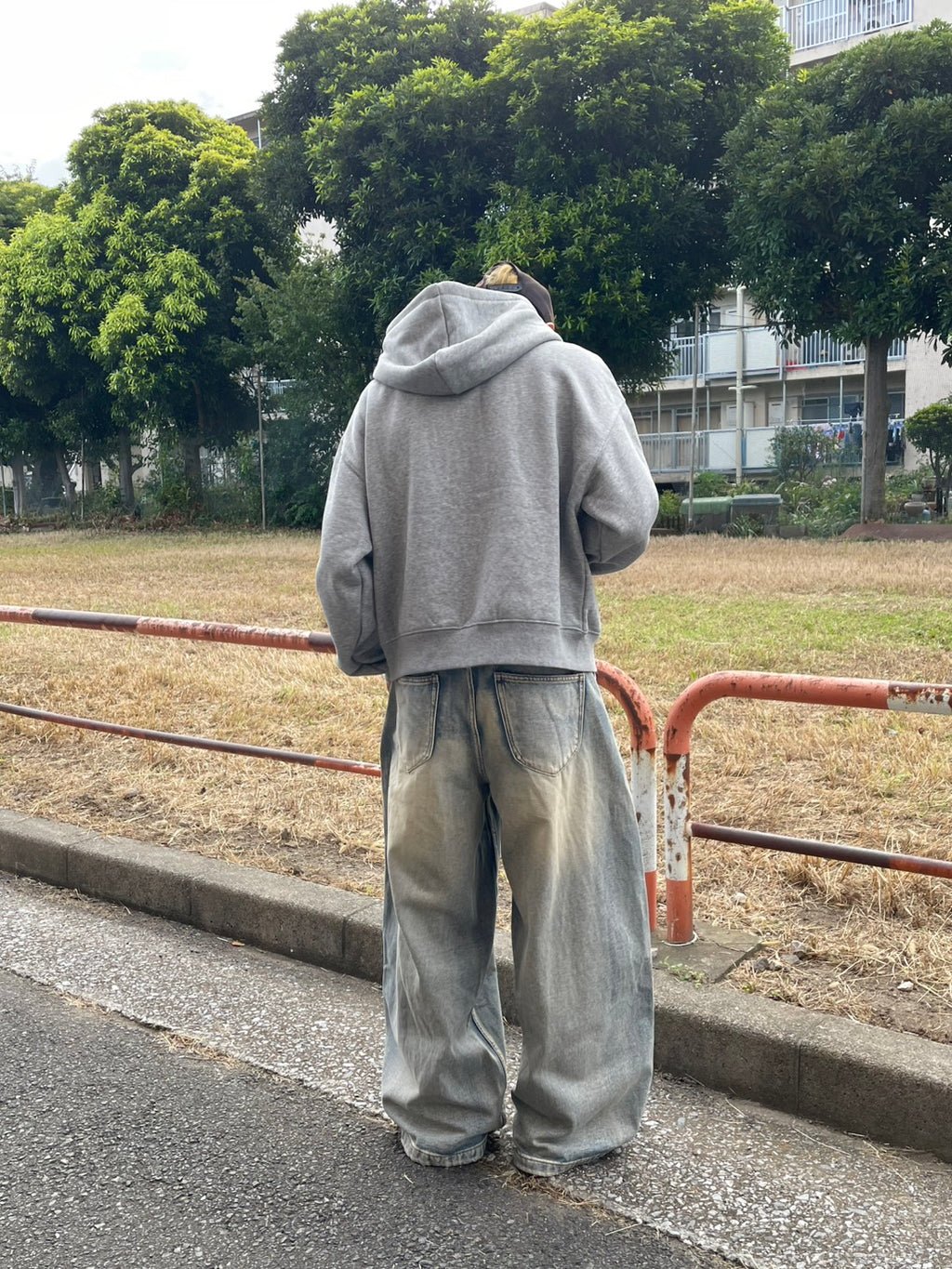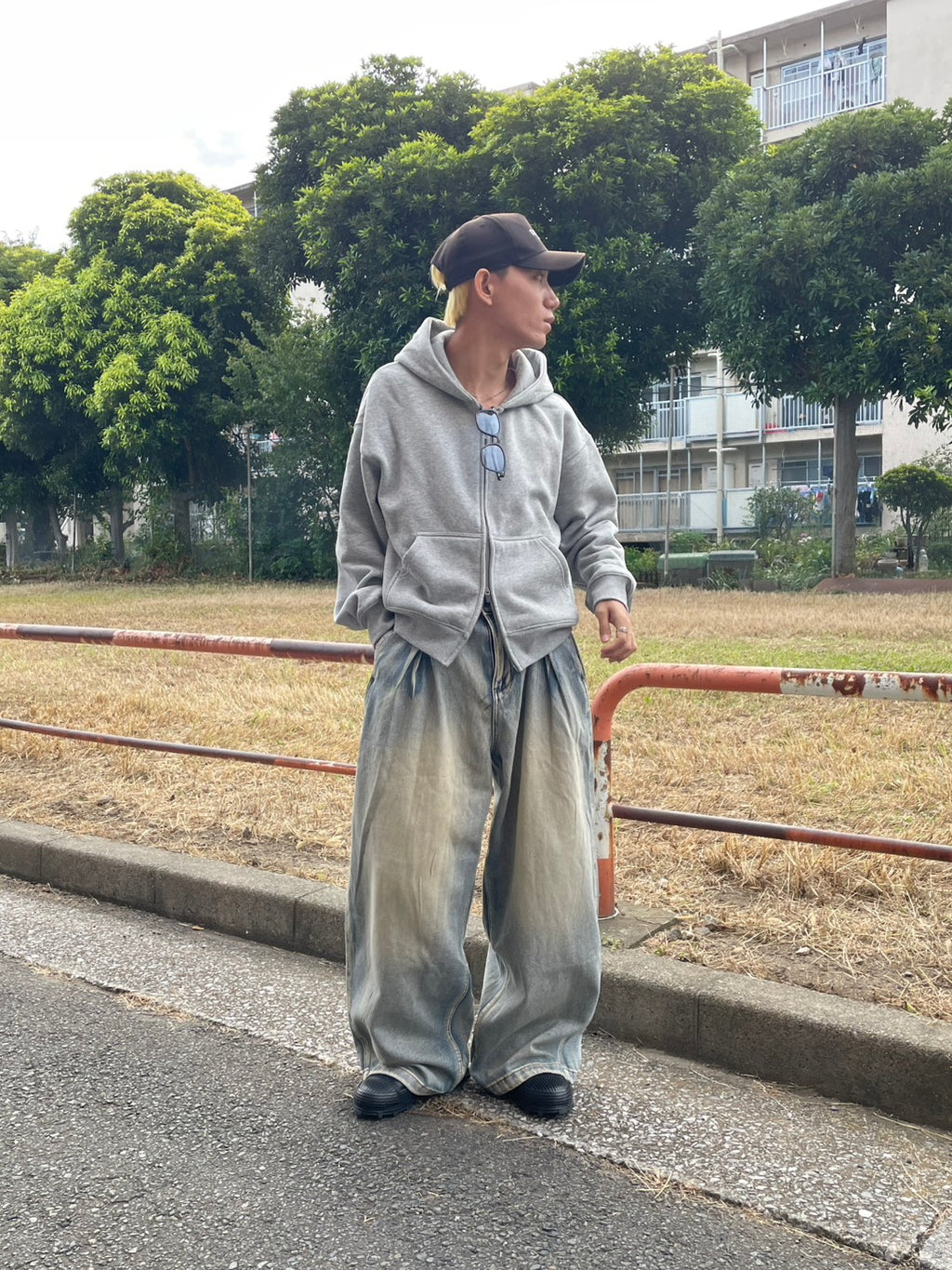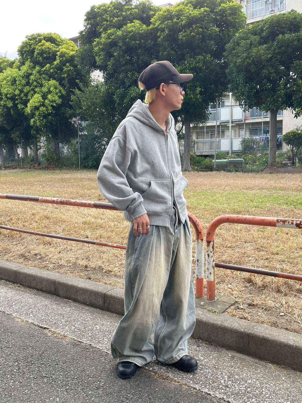 オーバーサイズながら短丈に仕上げたグレーパーカーは、重心を上げてバランスよく見せてくれる今季のキーアイテム。極太のウォッシュデニムと合わせれば、90’sストリートの空気感をモダンに再構築できる。ラフなのに計算されたシルエットで、抜け感と存在感を両立。シンプルなカラーリングだからこそ、ボリュームのあるパンツや小物で遊ぶのがポイント。