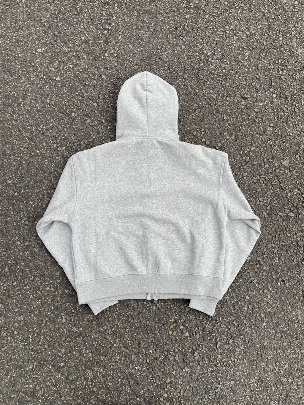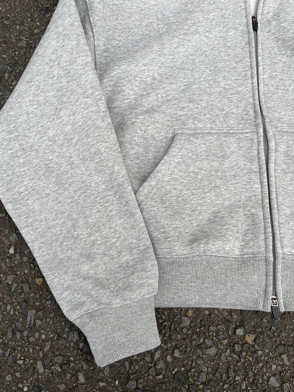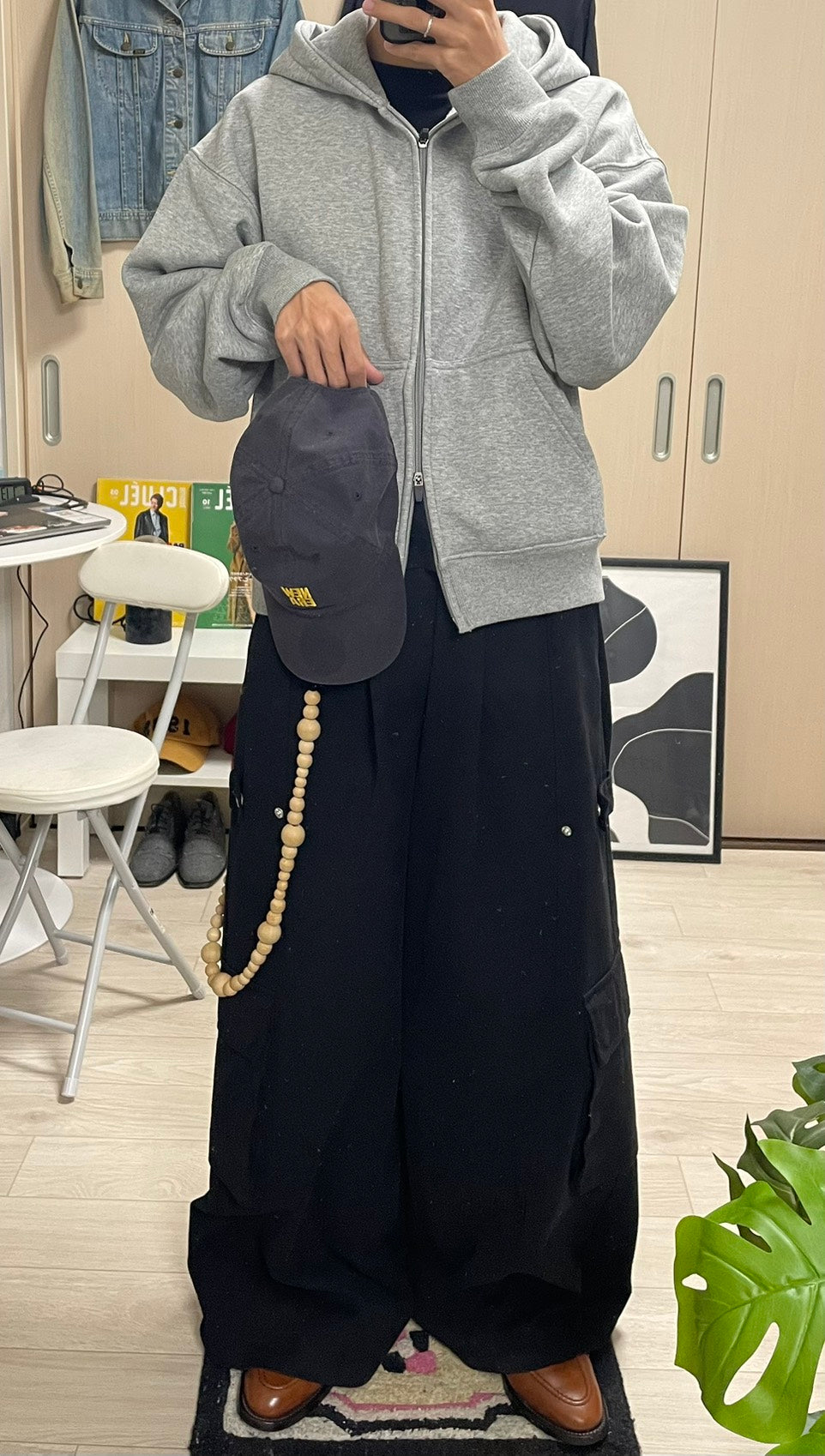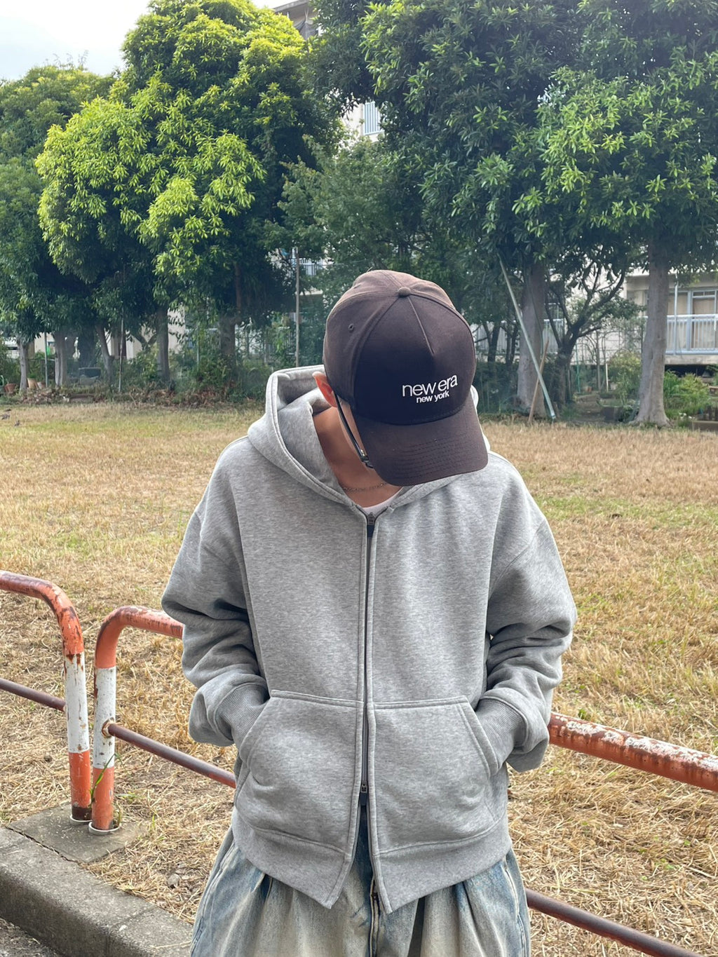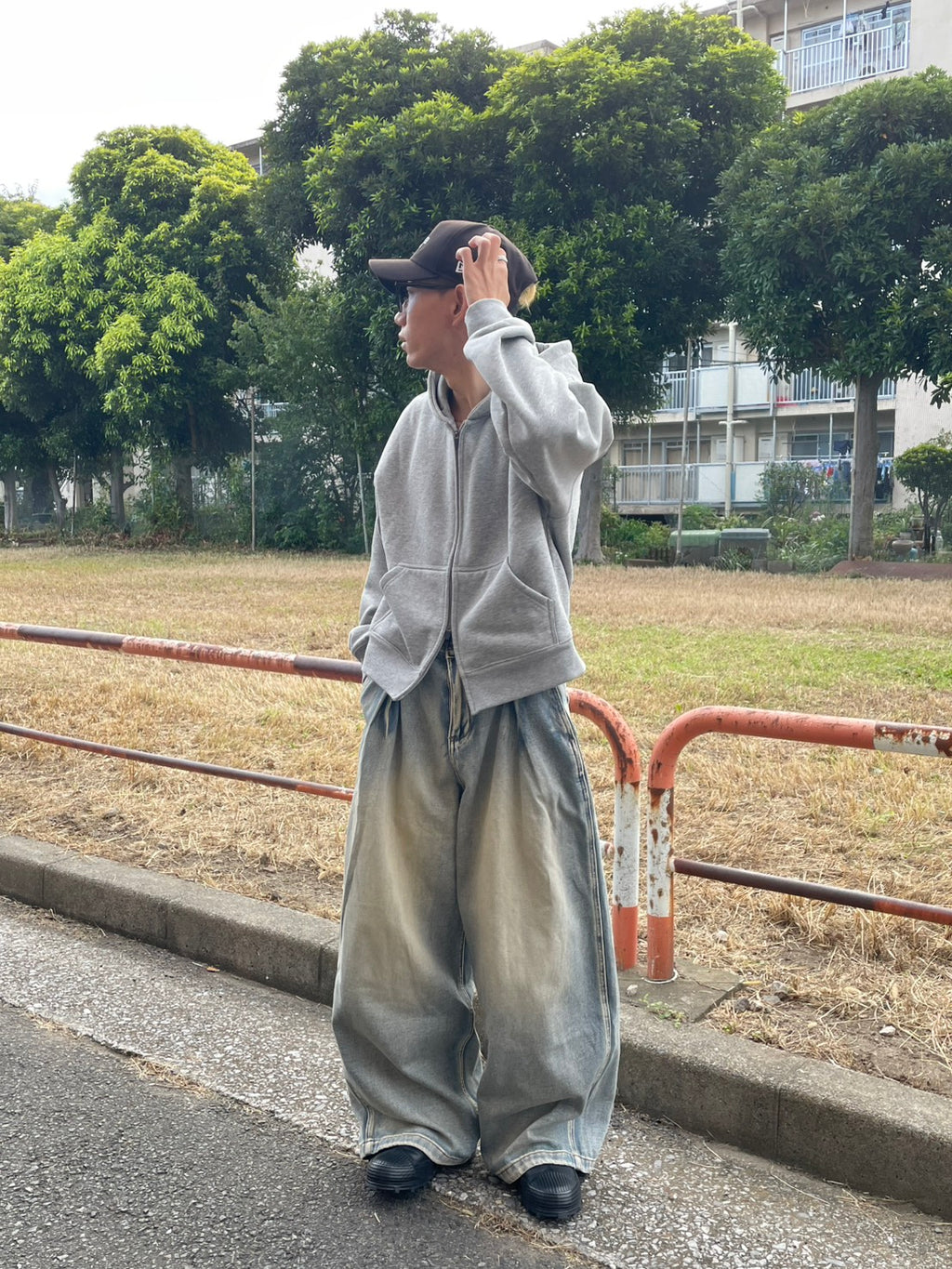 オーバーサイズながら短丈に仕上げたグレーパーカーは、重心を上げてバランスよく見せてくれる今季のキーアイテム。極太のウォッシュデニムと合わせれば、90’sストリートの空気感をモダンに再構築できる。ラフなのに計算されたシルエットで、抜け感と存在感を両立。シンプルなカラーリングだからこそ、ボリュームのあるパンツや小物で遊ぶのがポイント。
