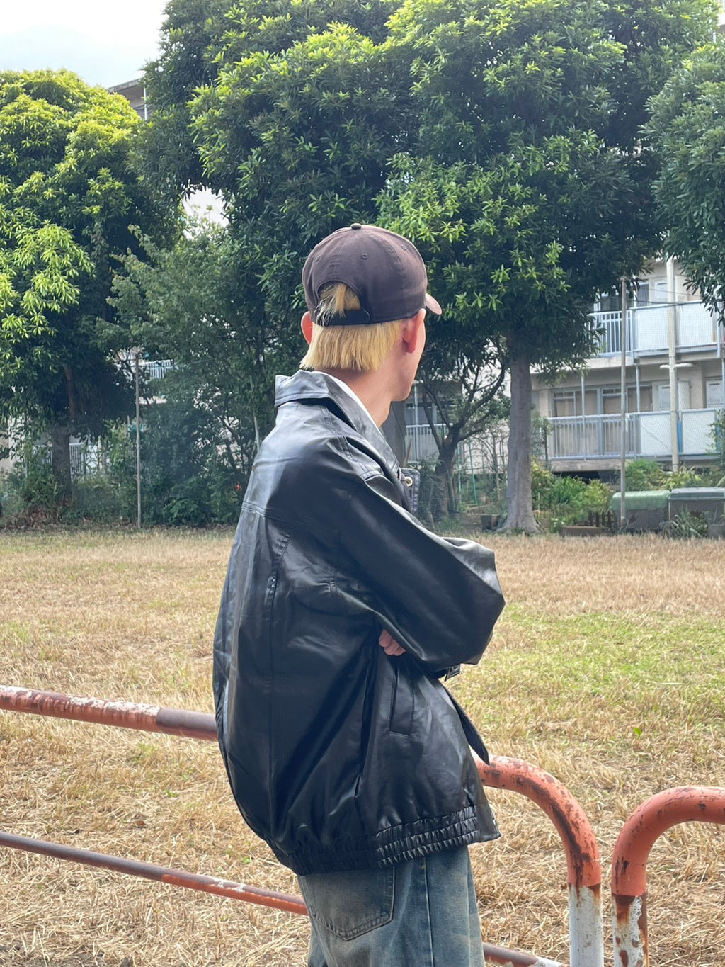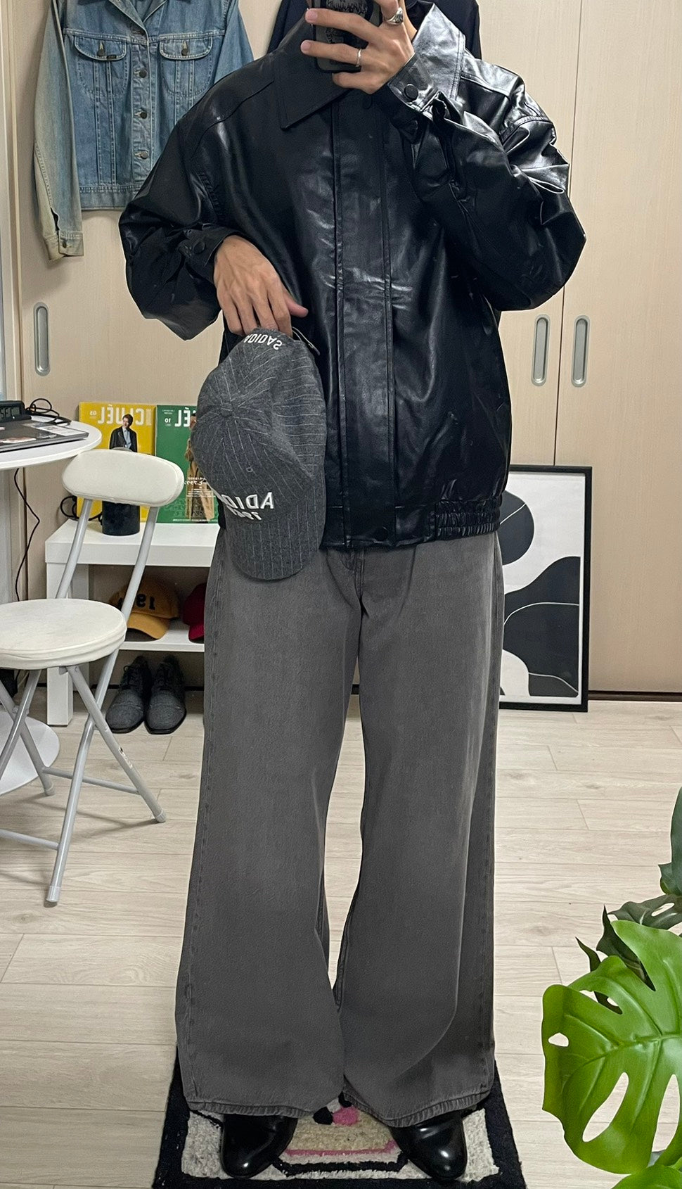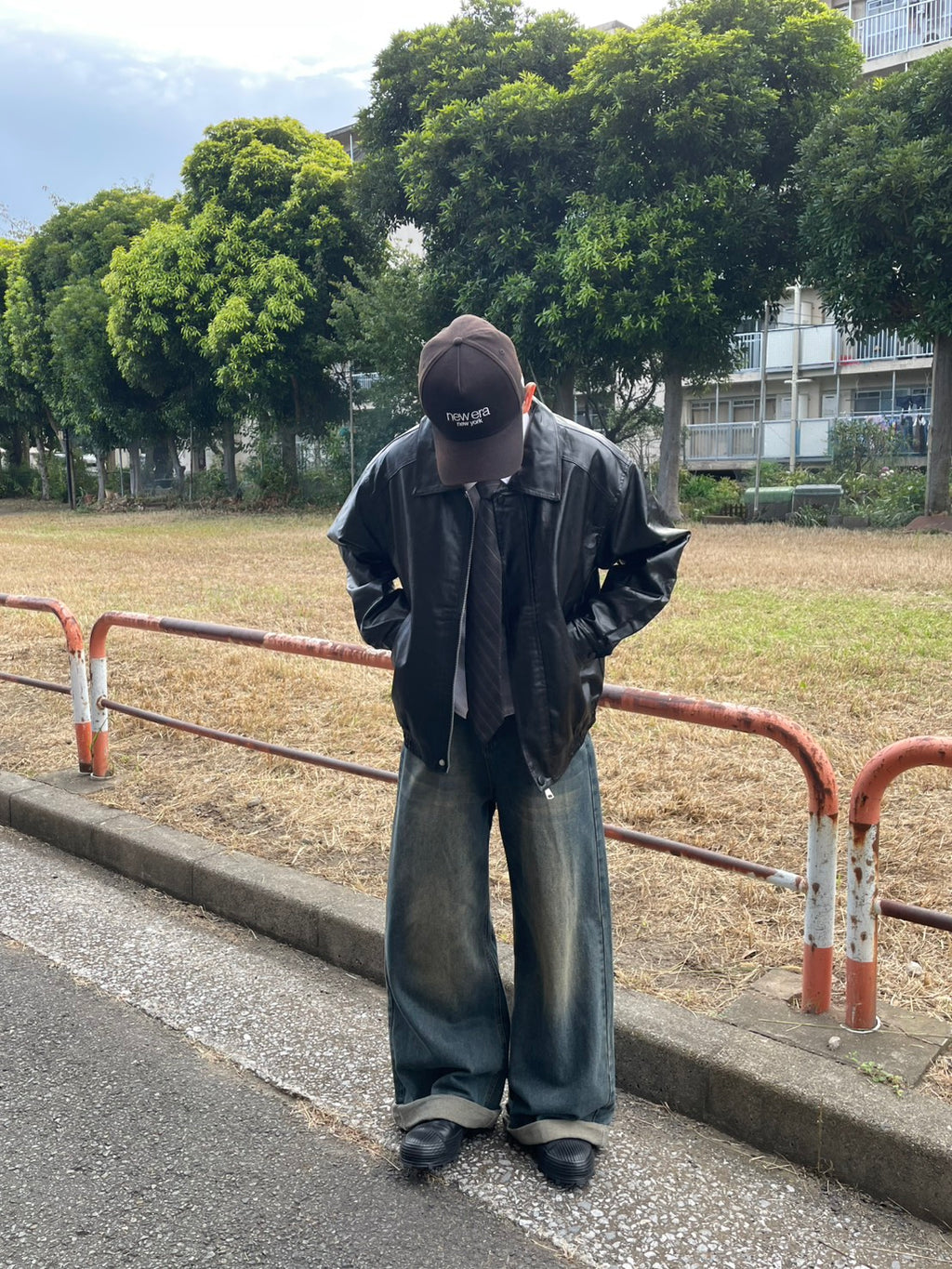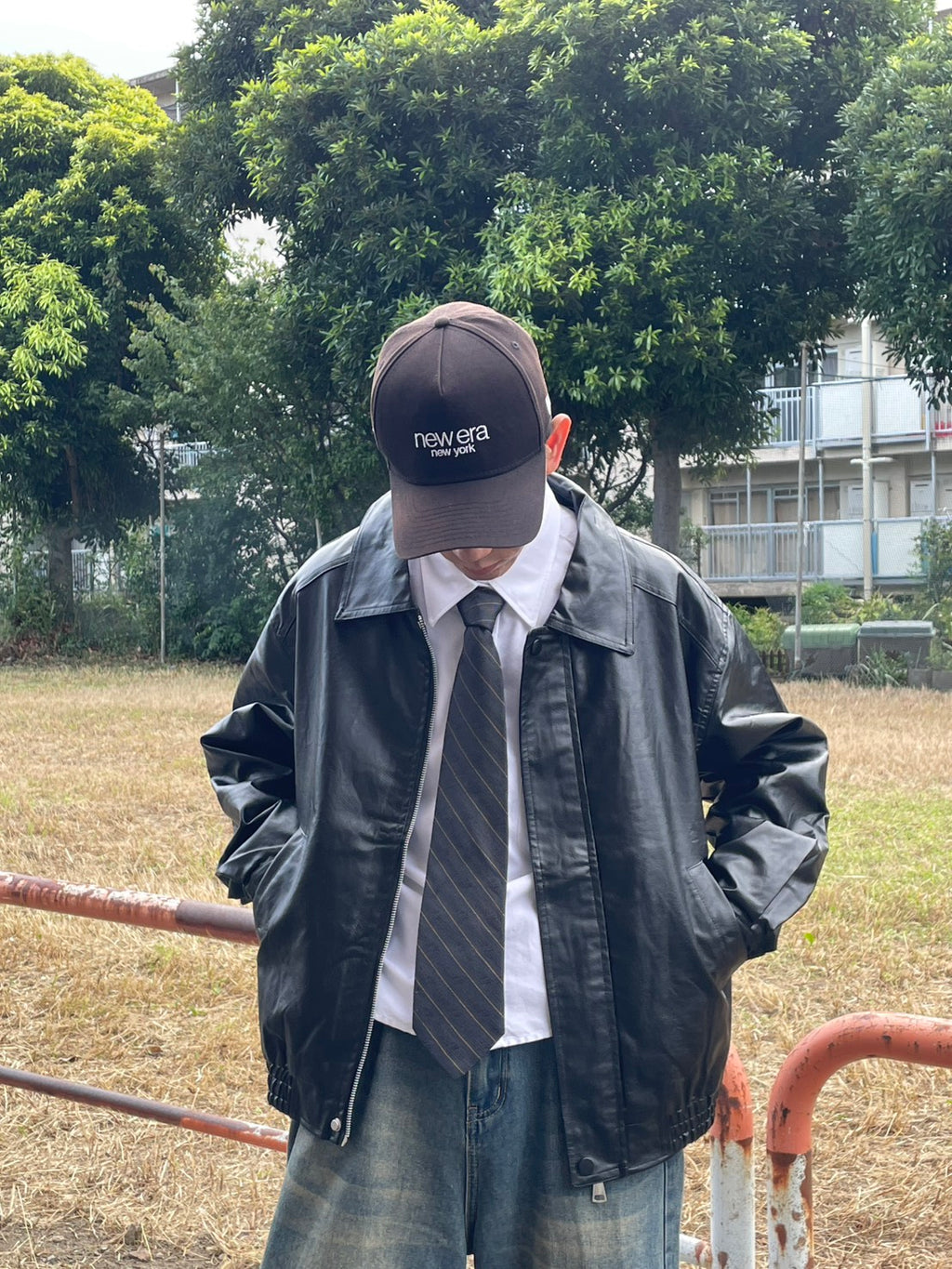このPUレザージャケットは、カチッとしすぎないオーバーサイズ感が魅力。今日はシャツとネクタイを合わせて、あえてドレッシーな要素をMIX。でも、足元はワイドデニムで重めに。この「キレイめ×ストリート」のアンバランス感がコーデの鍵。キャップで抜け感を出すのも忘れずに。