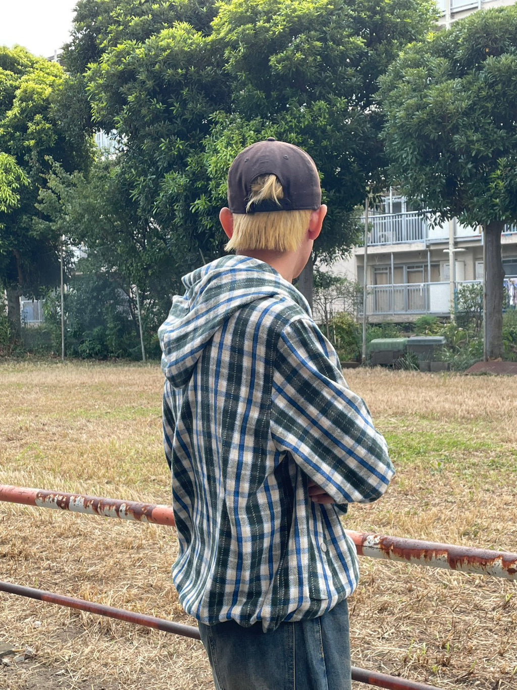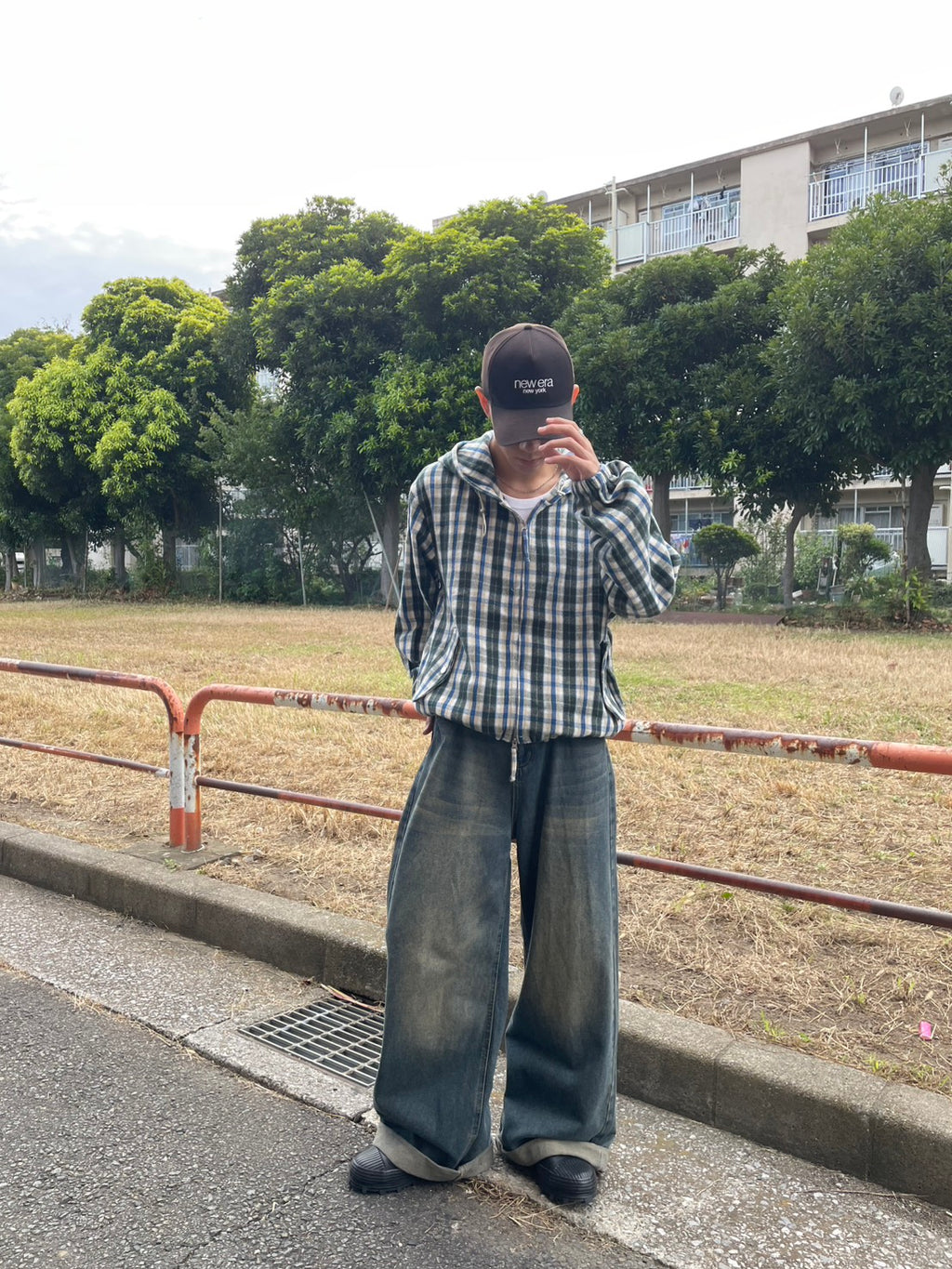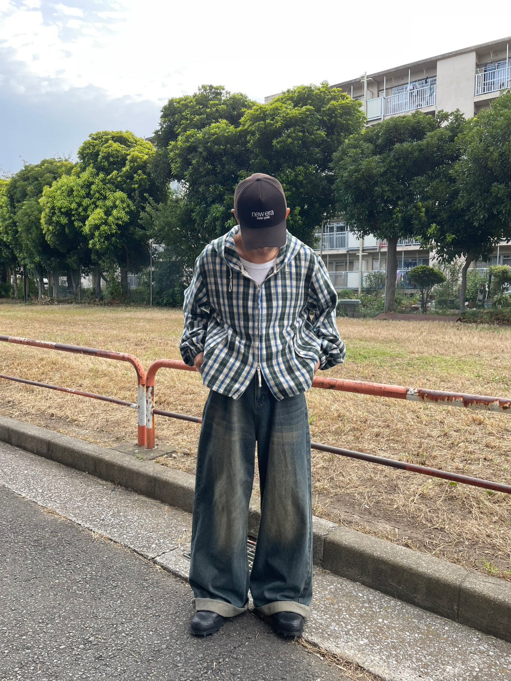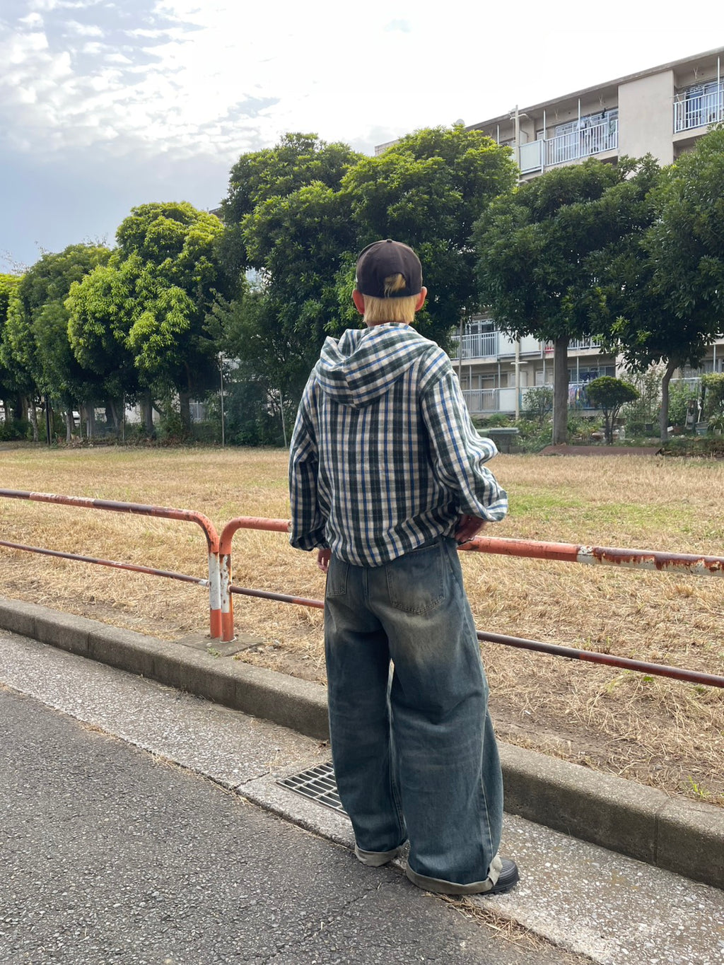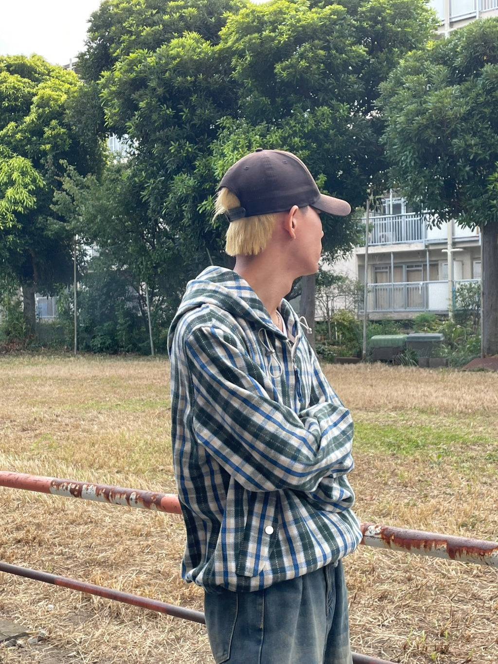 このネルシャツみたいな生地感のチェックフーディーが、今季のお気に入り。シャツジャケットとして羽織ってもいいし、今日はジップを上げてトップスとして。このルーズなサイズ感に、あえて極太のワイドデニムを合わせるのが気分。ラフだけど、色味で秋っぽさも。キャップでストリート感をプラス。