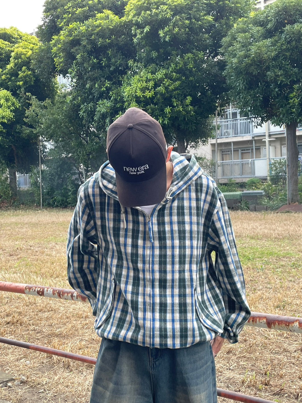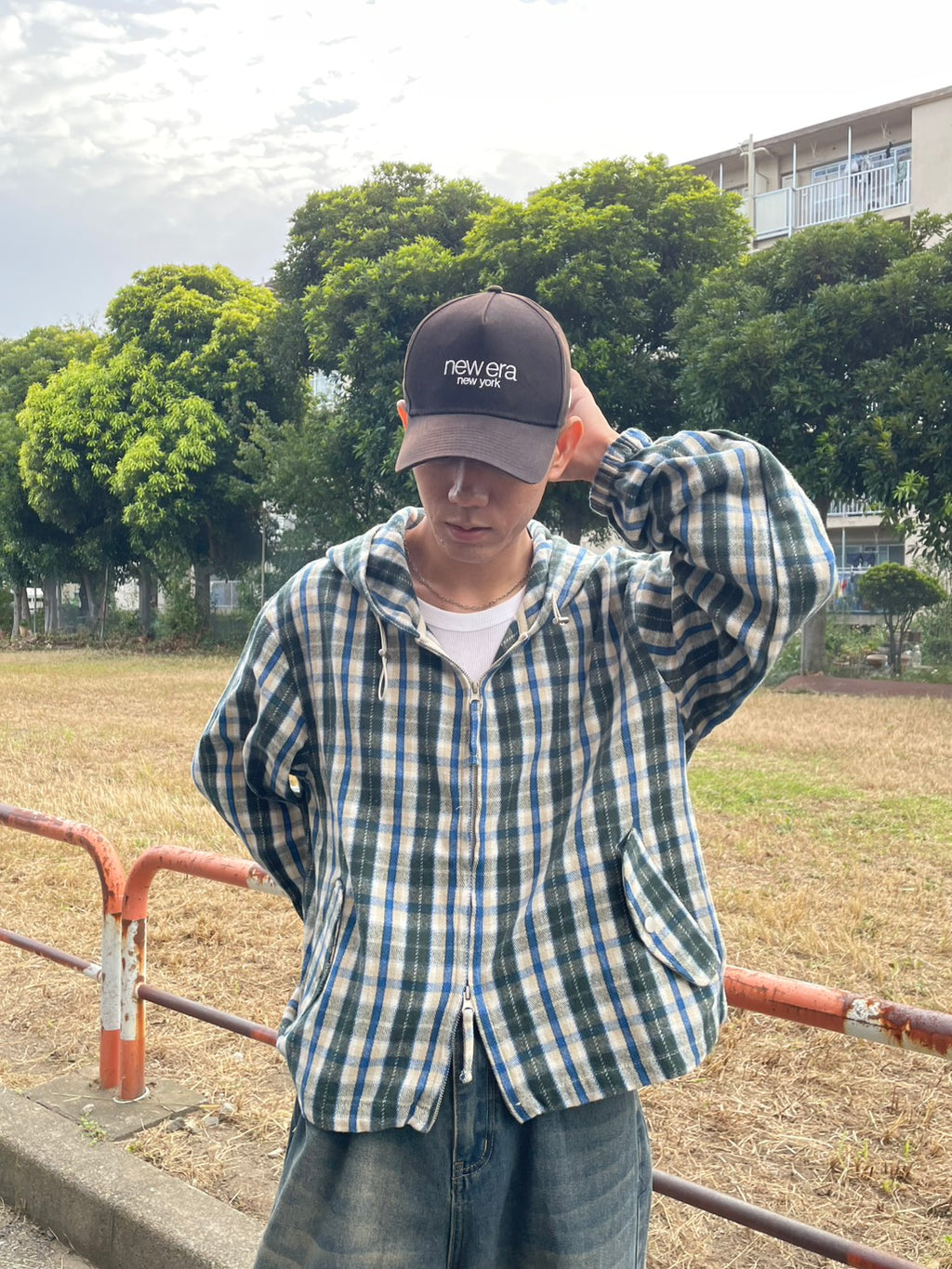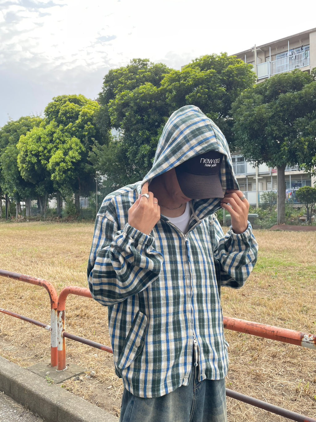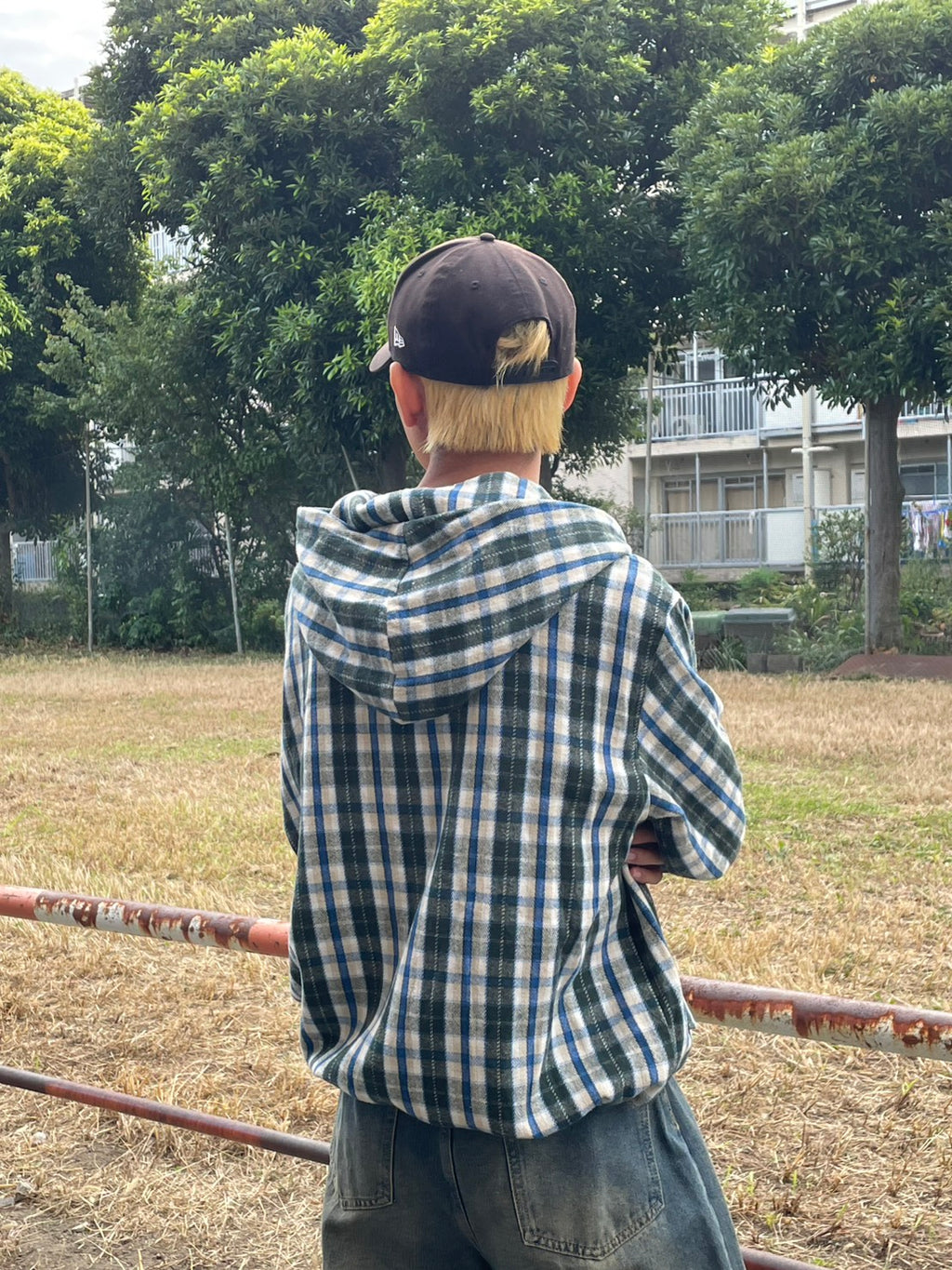 このネルシャツみたいな生地感のチェックフーディーが、今季のお気に入り。シャツジャケットとして羽織ってもいいし、今日はジップを上げてトップスとして。このルーズなサイズ感に、あえて極太のワイドデニムを合わせるのが気分。ラフだけど、色味で秋っぽさも。キャップでストリート感をプラス。