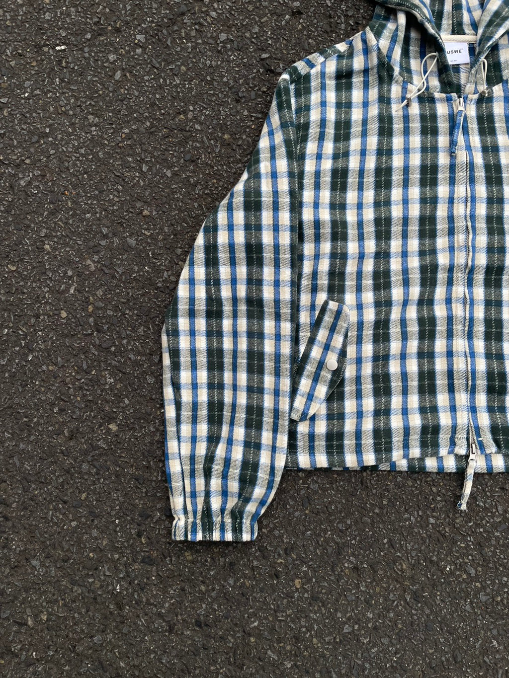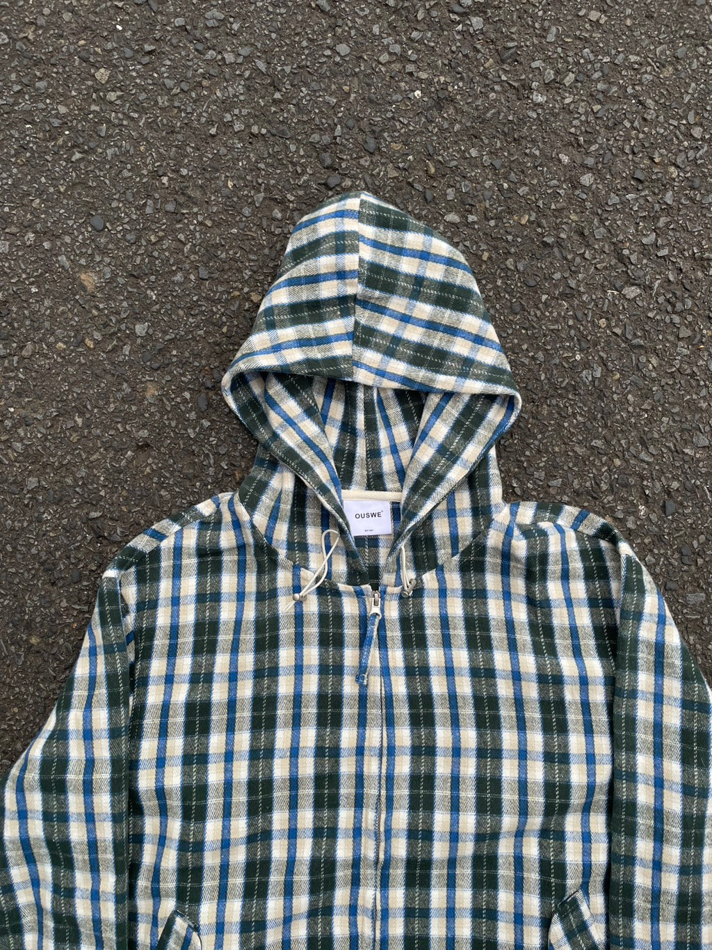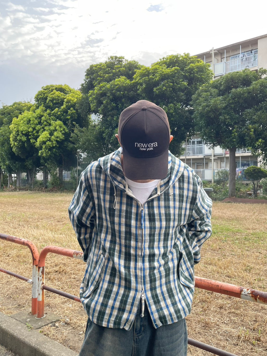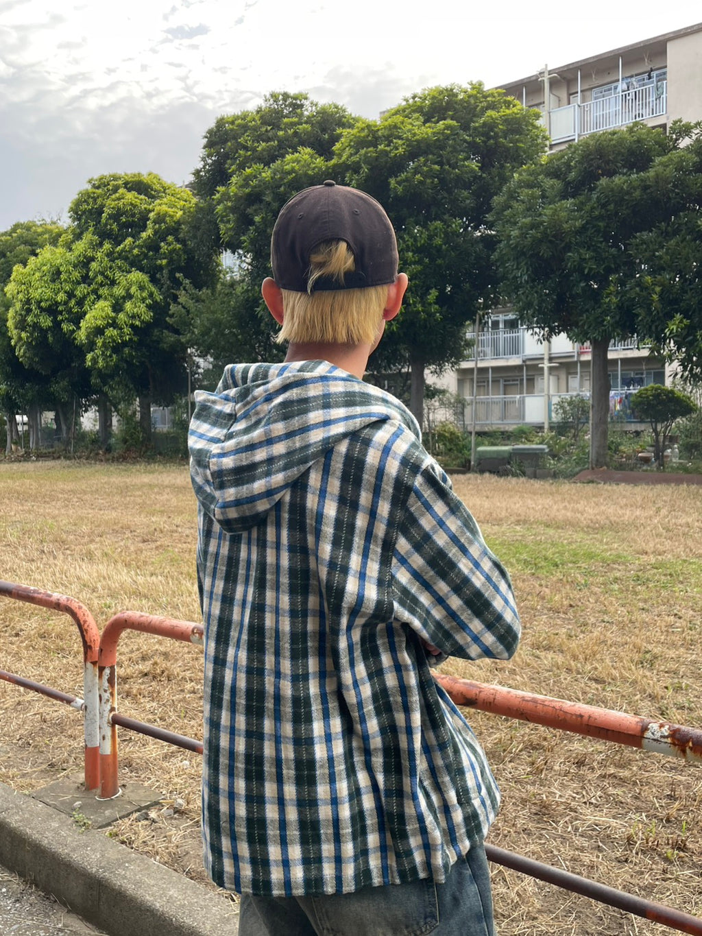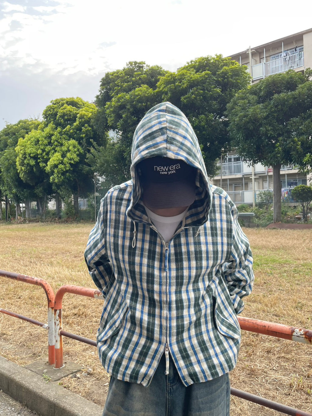 このネルシャツみたいな生地感のチェックフーディーが、今季のお気に入り。シャツジャケットとして羽織ってもいいし、今日はジップを上げてトップスとして。このルーズなサイズ感に、あえて極太のワイドデニムを合わせるのが気分。ラフだけど、色味で秋っぽさも。キャップでストリート感をプラス。